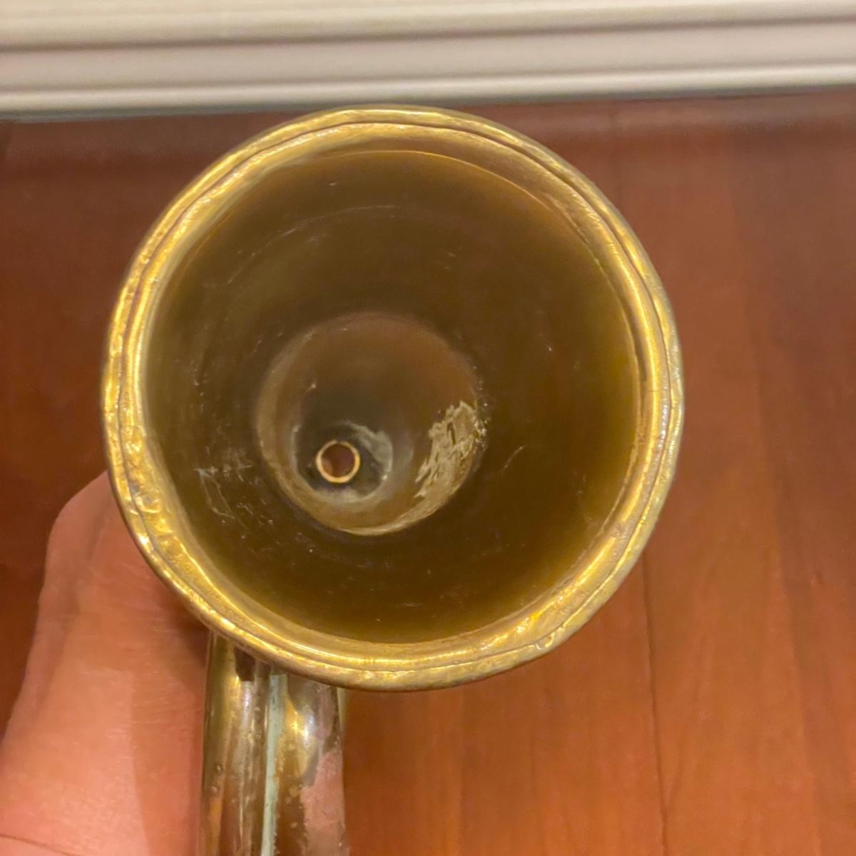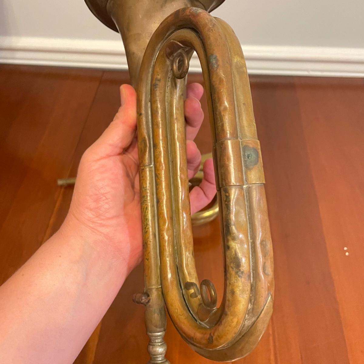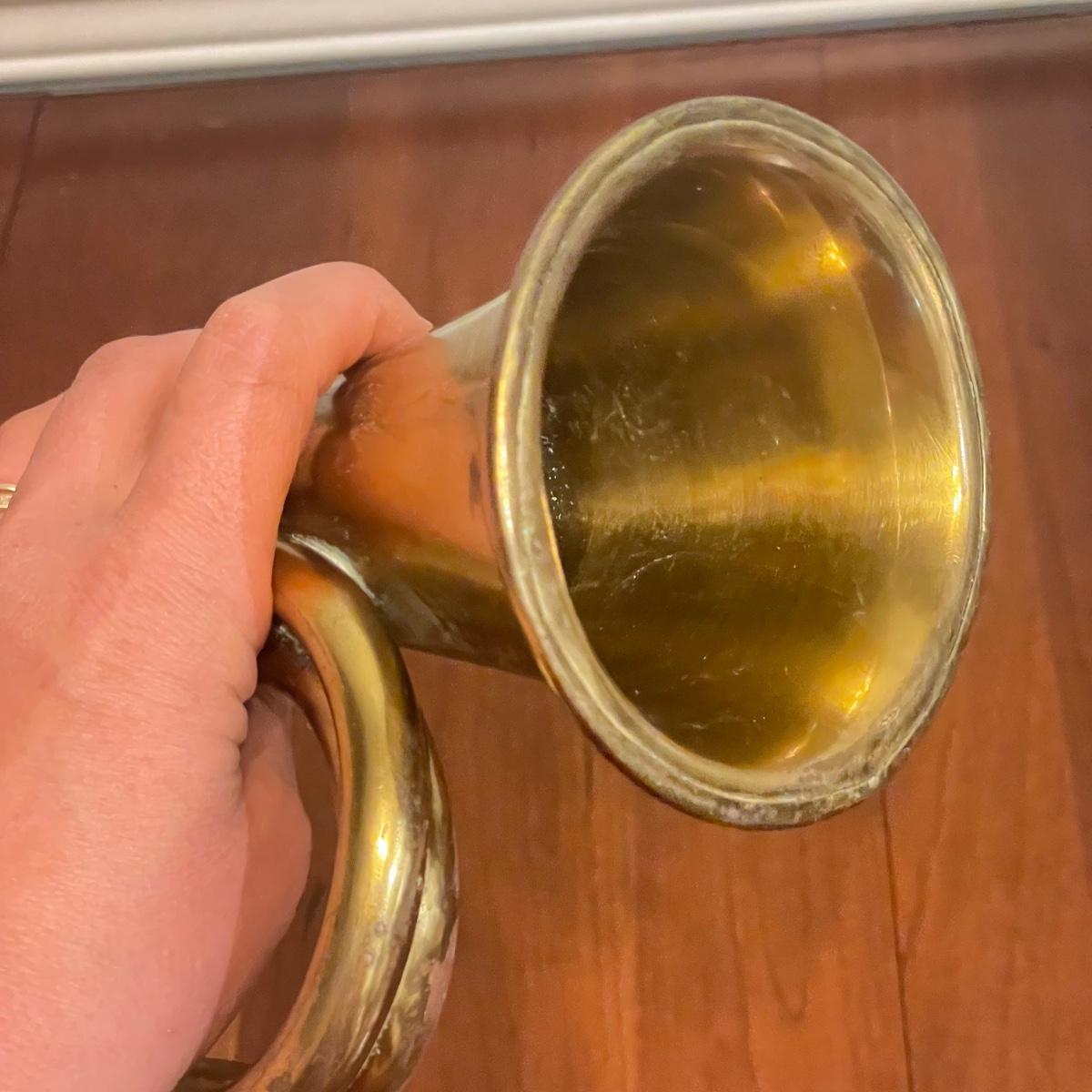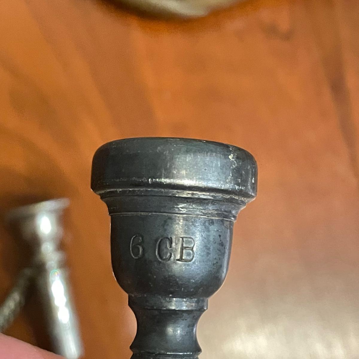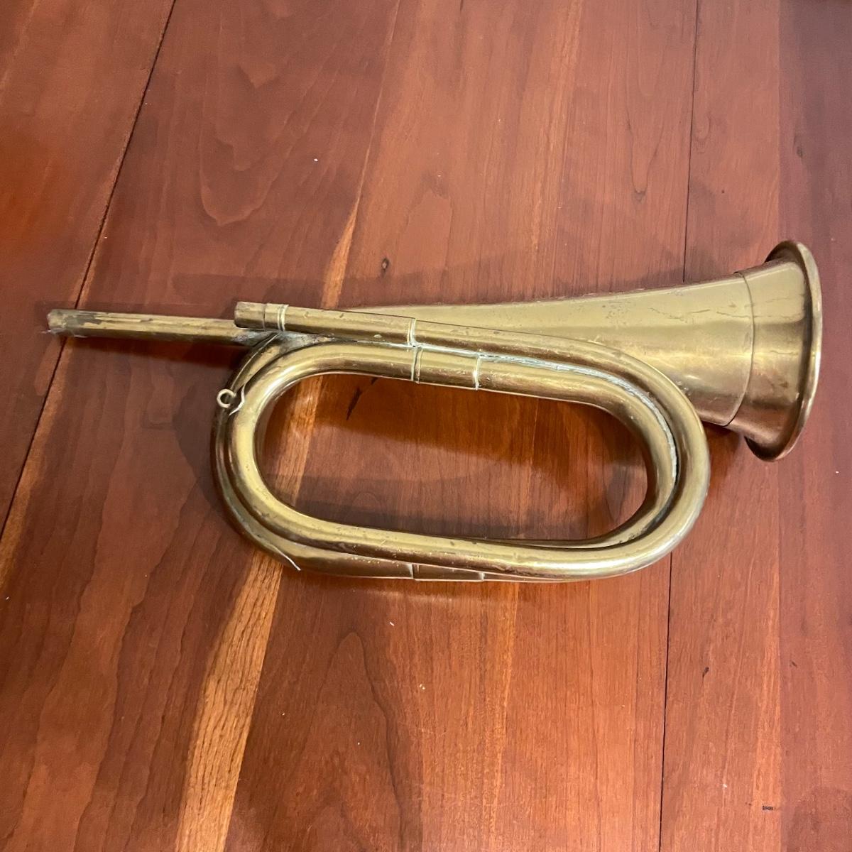 Two vintage, perhaps antique, bugles and two mouth pieces, one marked 6 CB. One bugle is dented and appears to be copper with a silver metal mouthpiece. The brass colored bugle has two openings See images. Shipping available.