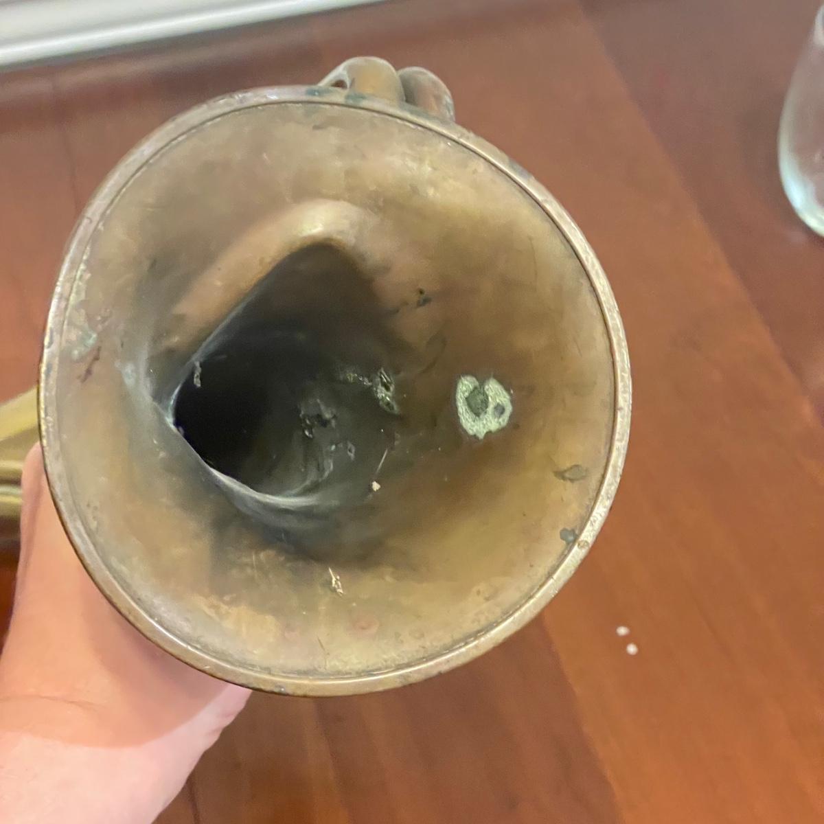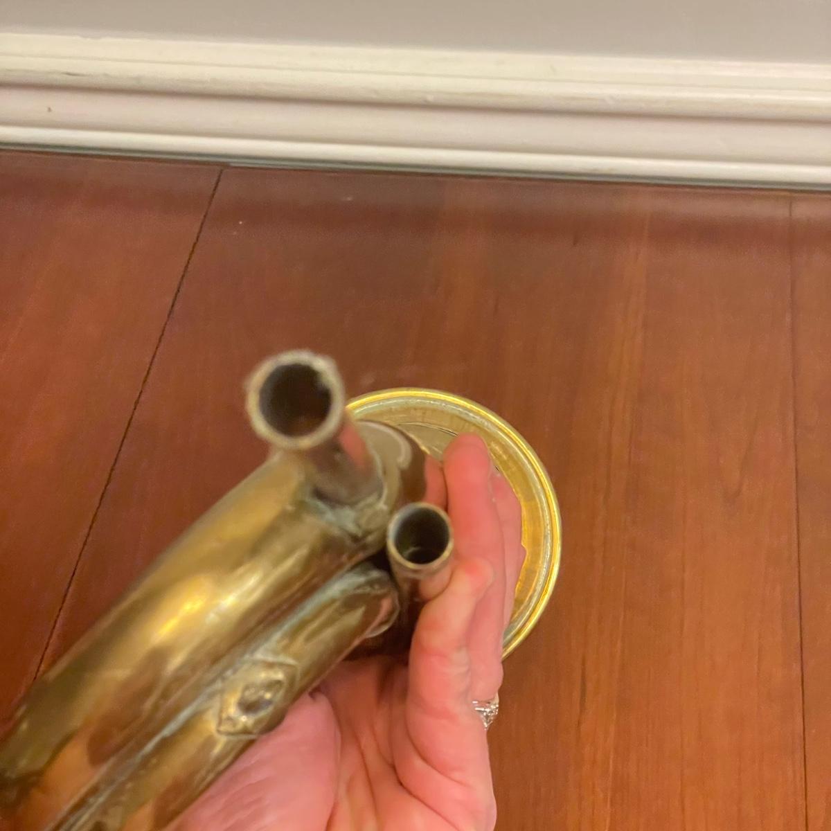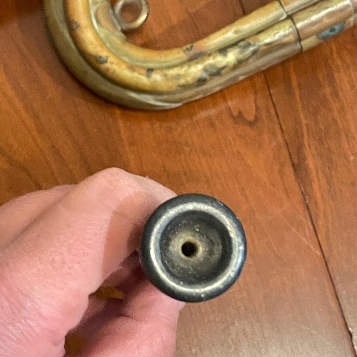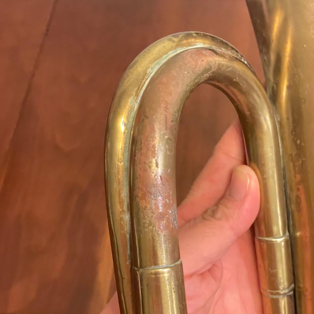 Two vintage, perhaps antique, bugles and two mouth pieces, one marked 6 CB. One bugle is dented and appears to be copper with a silver metal mouthpiece. The brass colored bugle has two openings See images. Shipping available.