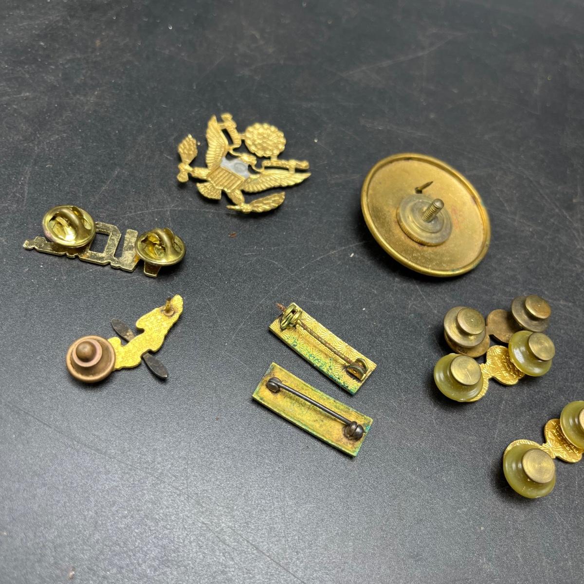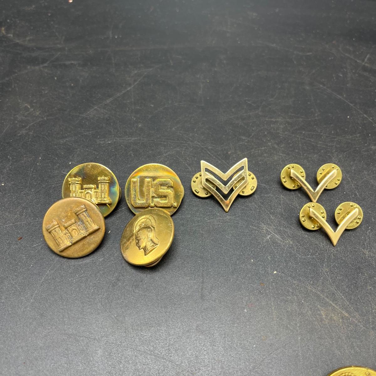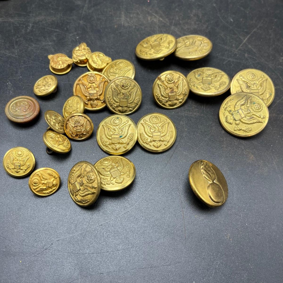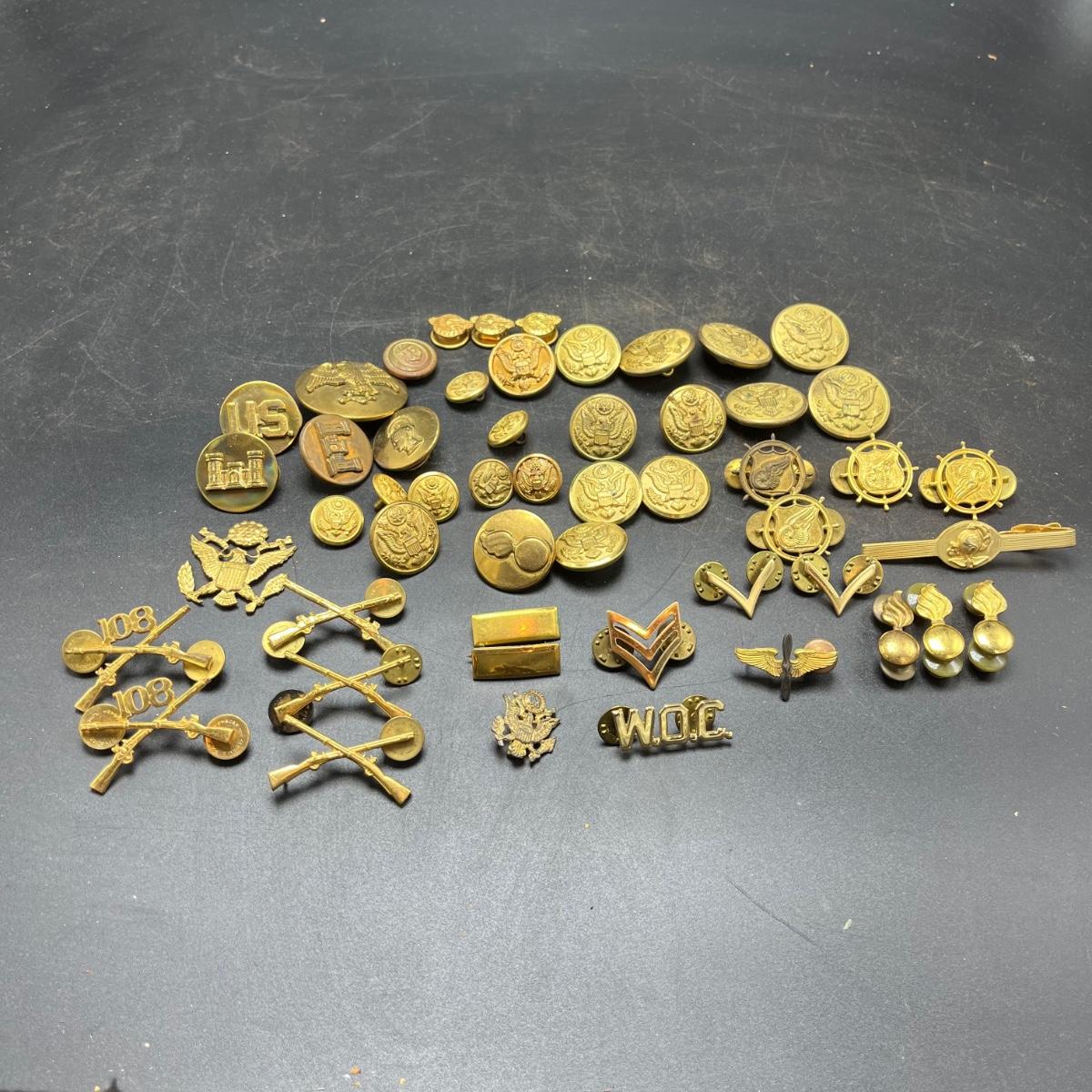 Lot includes a plethora of military buttons and pins that most appear to be brass.