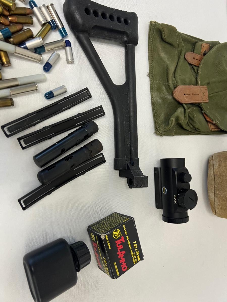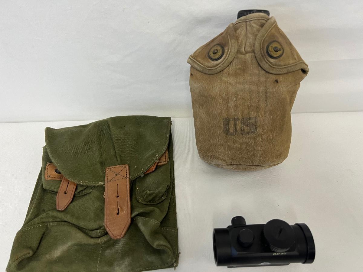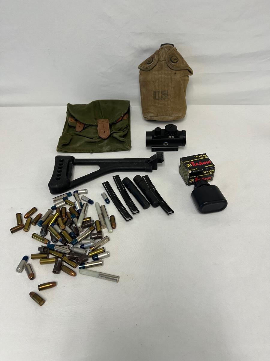 Includes a U.S. canteen, a red dot optic, assorted ammo, and more. Total of 30+ pieces. **NO SHIPPING ON AMMUNITION.** [LA]
