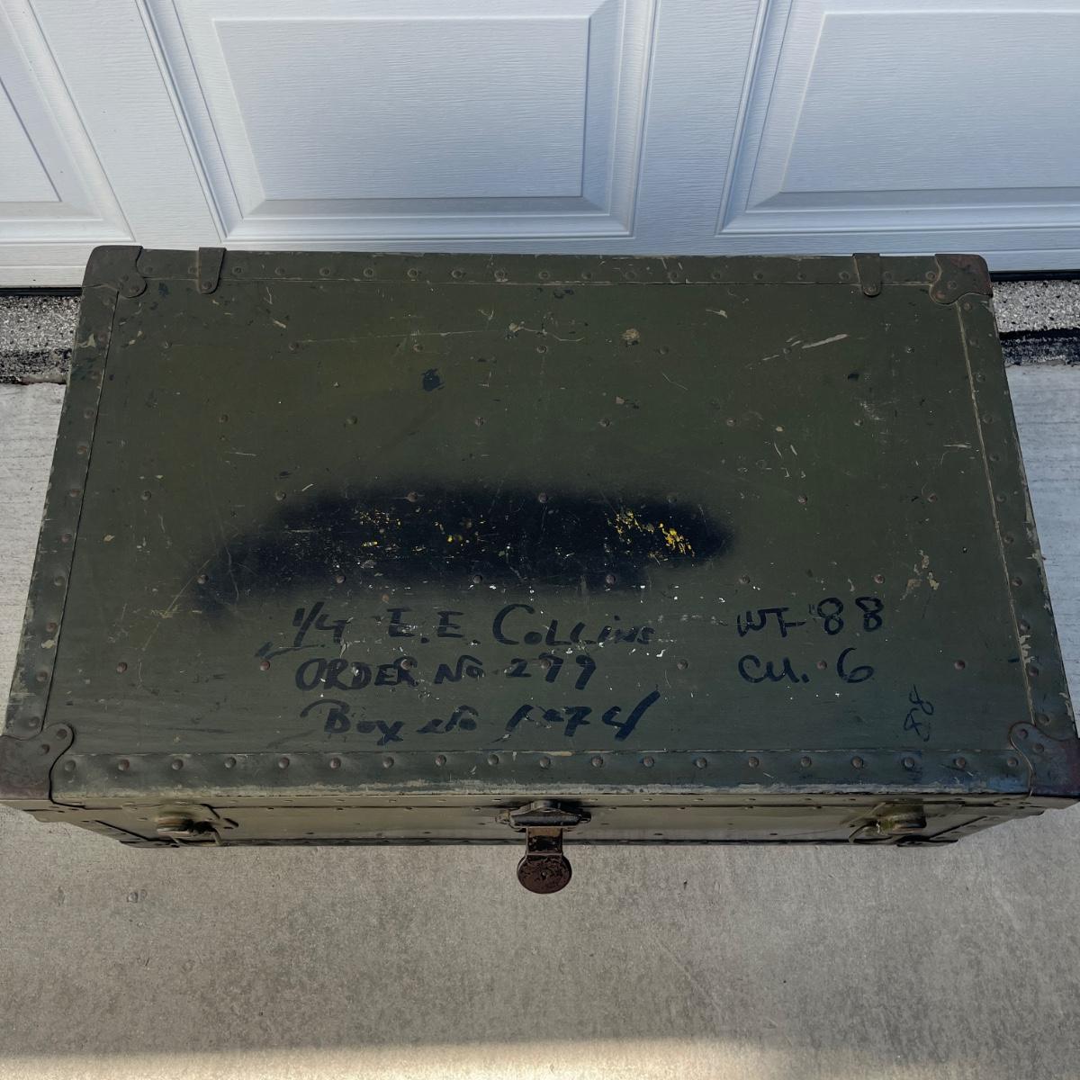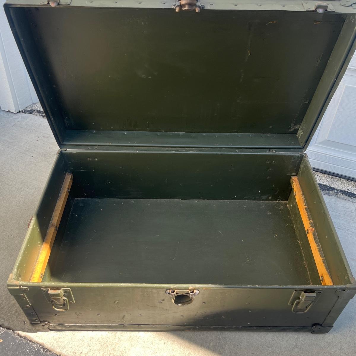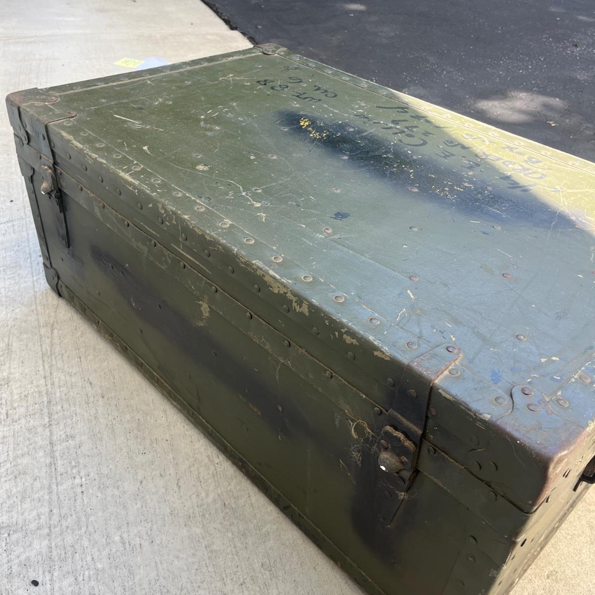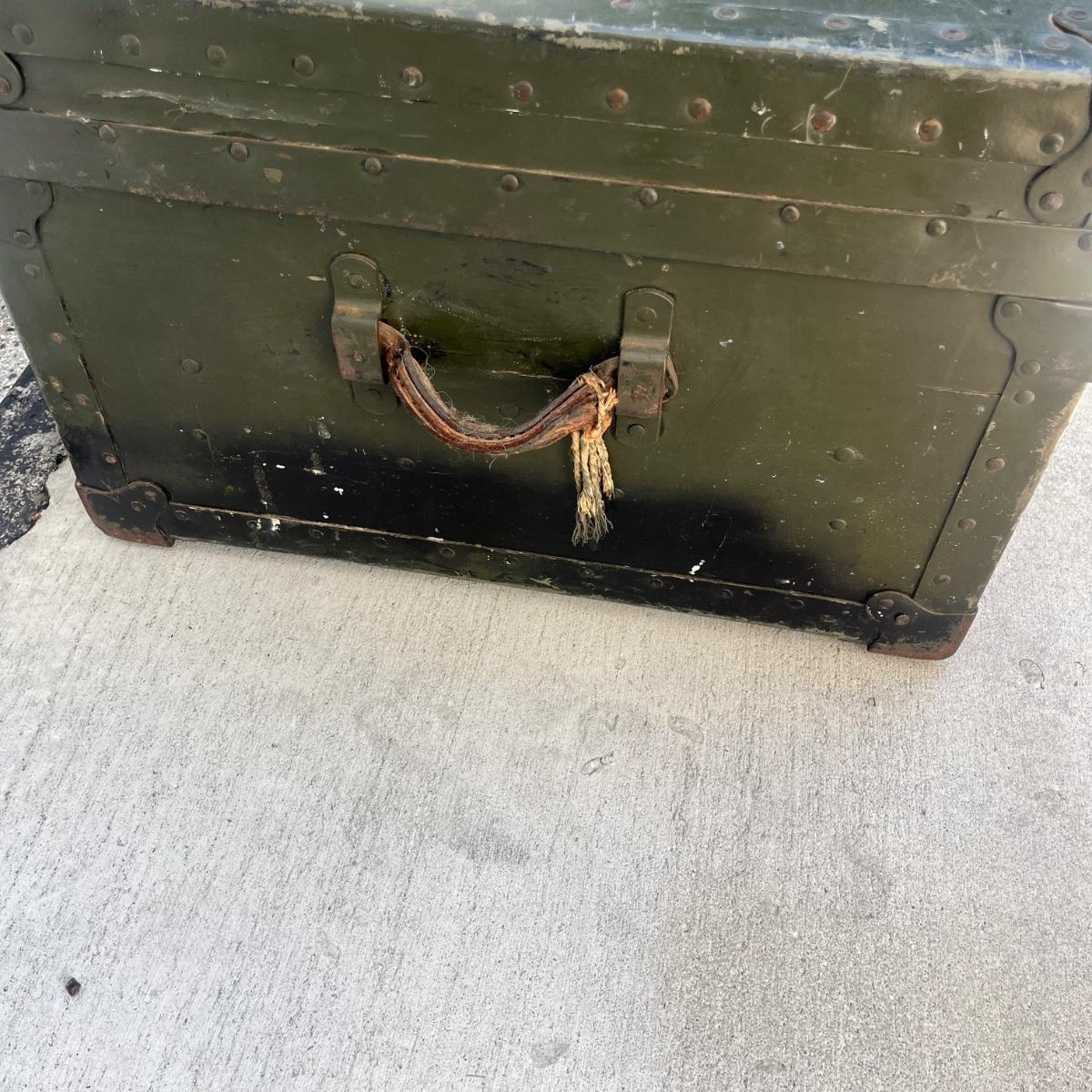 This military style foot locker measures 34” x 20” x 13.5”H. It is wood painted army green. Locker has no key and has one broken leather handle, see pictures.