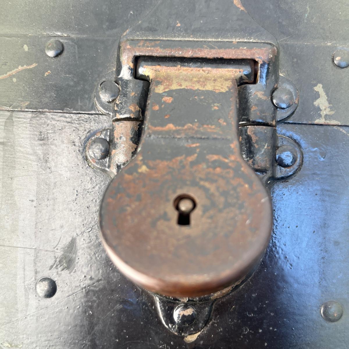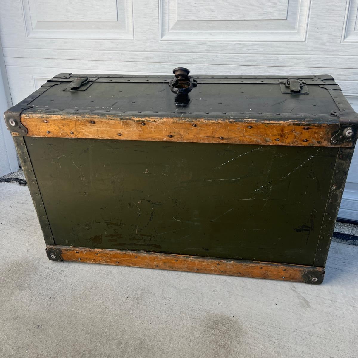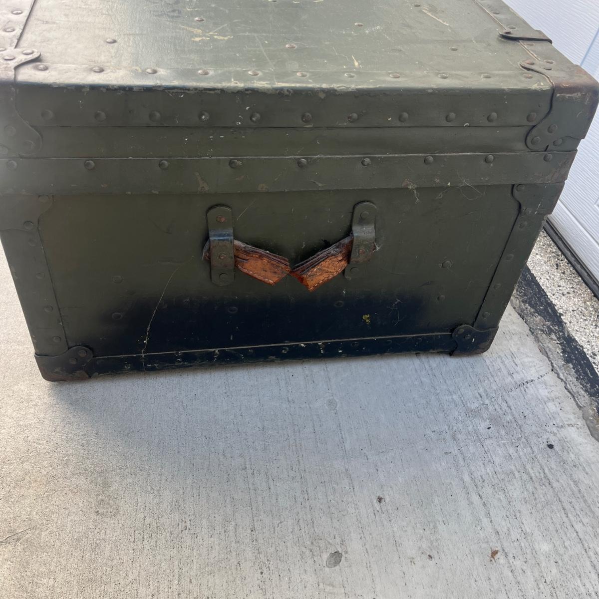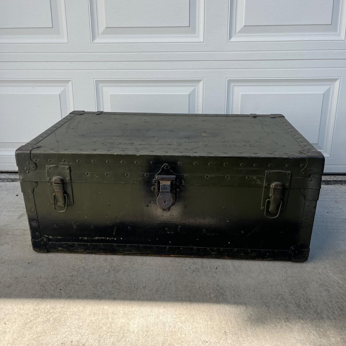 This military style foot locker measures 34” x 20” x 13.5”H. It is wood painted army green. Locker has no key and has one broken leather handle, see pictures.