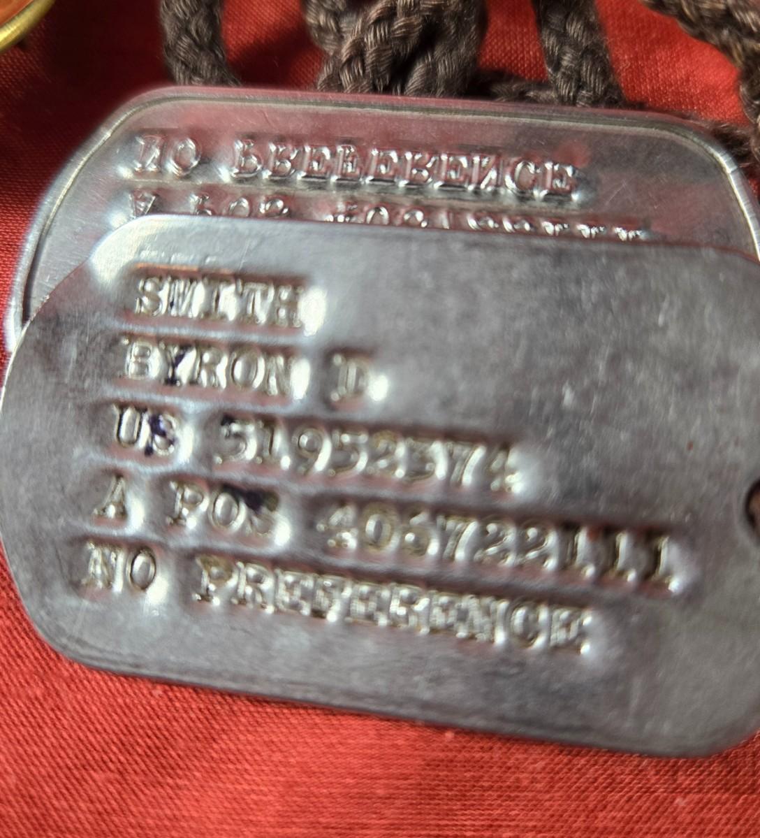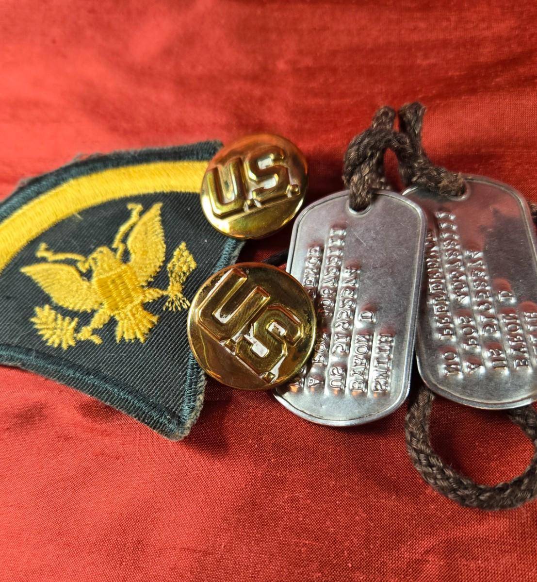 This auction lot is for a Military Item Grouping. This is a grouping of a military grade patch, two lapel pins and a set of dog tags. Pins do not have the back clasps. The man who wore these dog tags is deceased was never married and has no direct heirs.