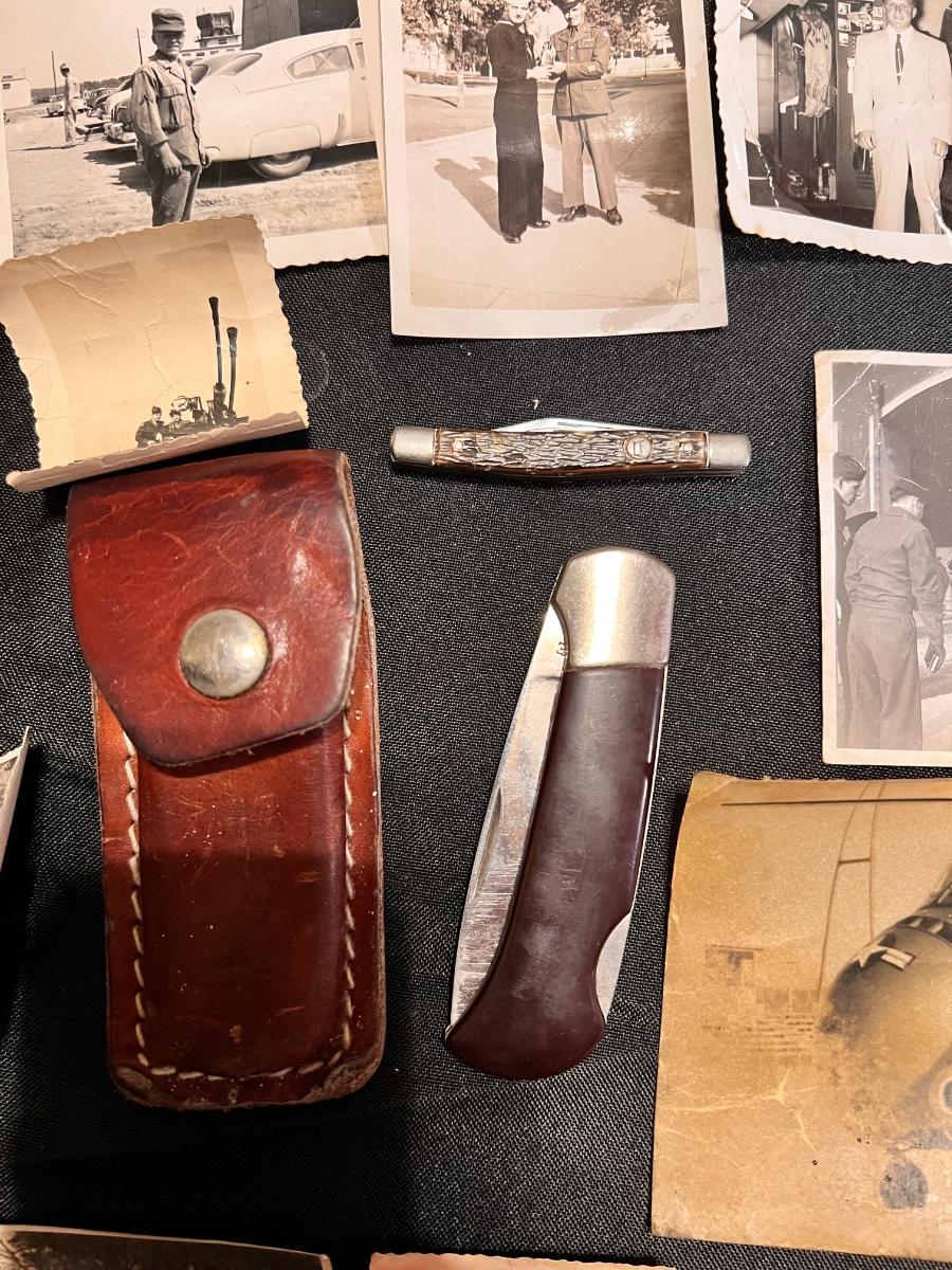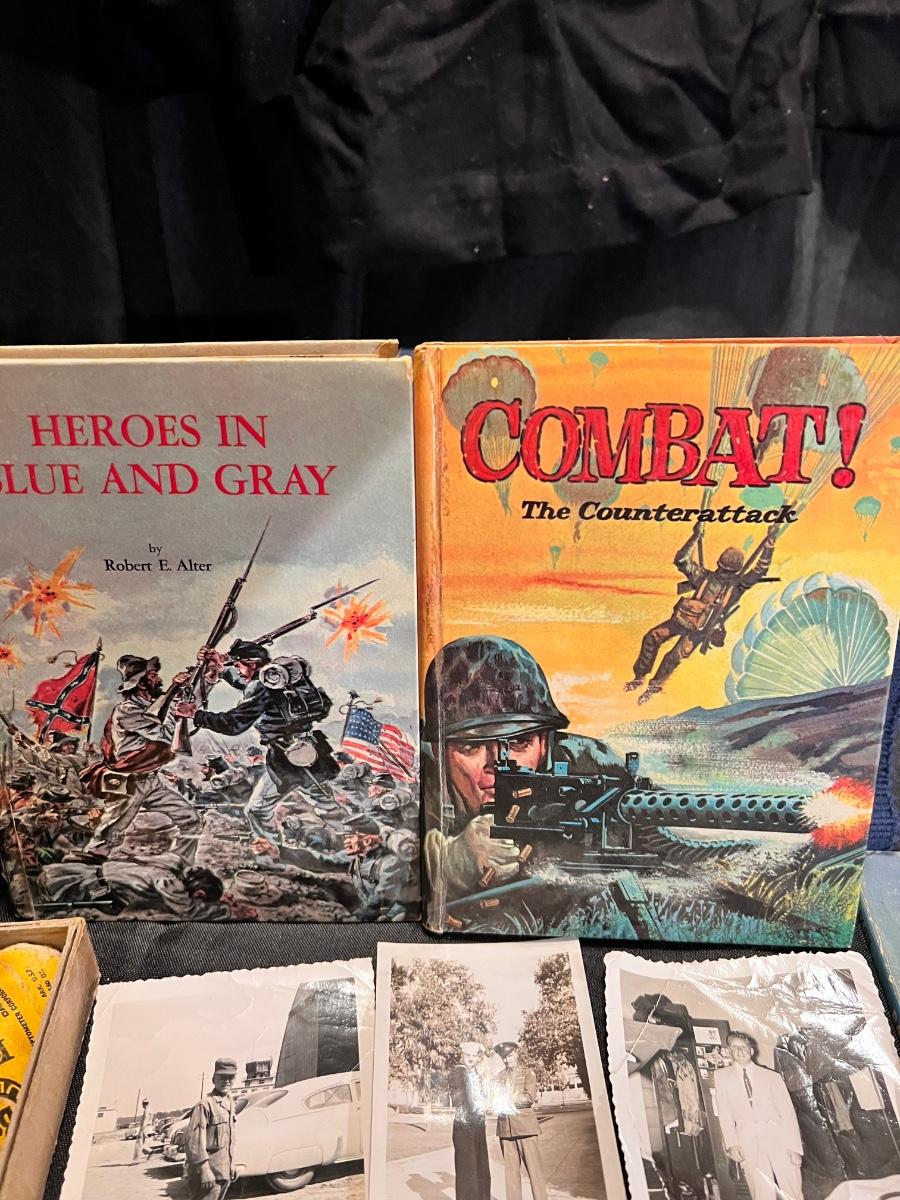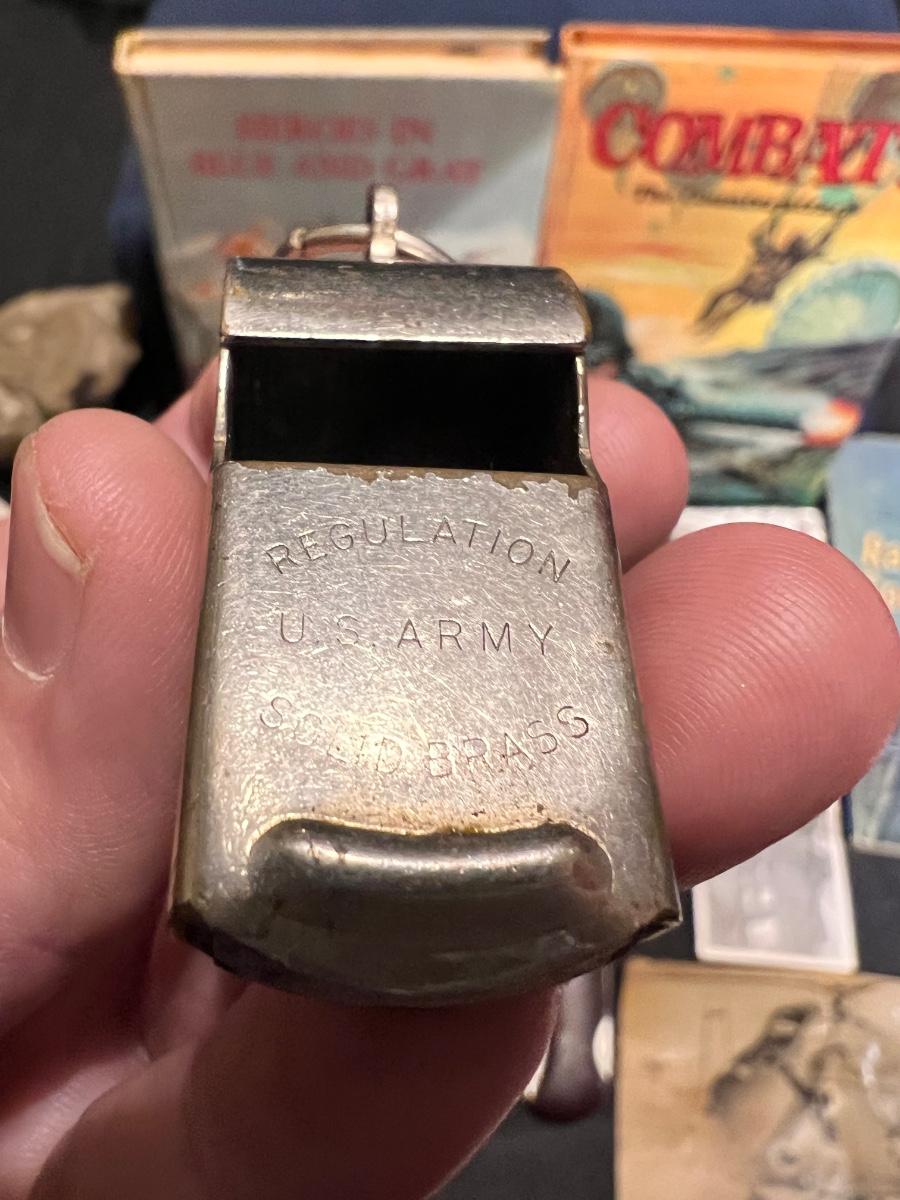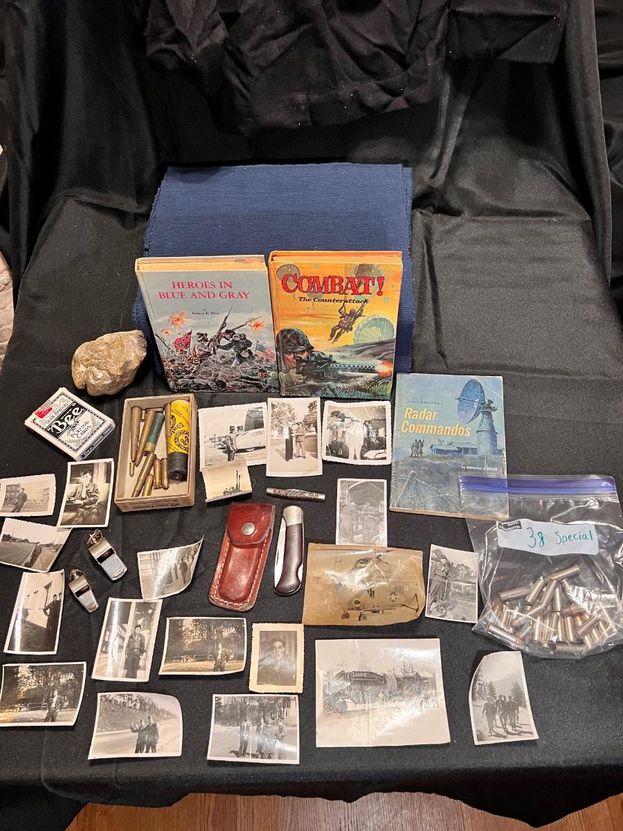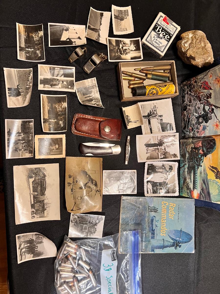 Vintage books, flashlight, whistles, photos, knives, some bullets as well.