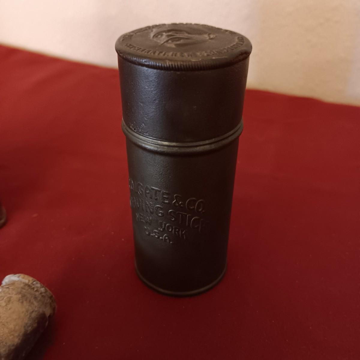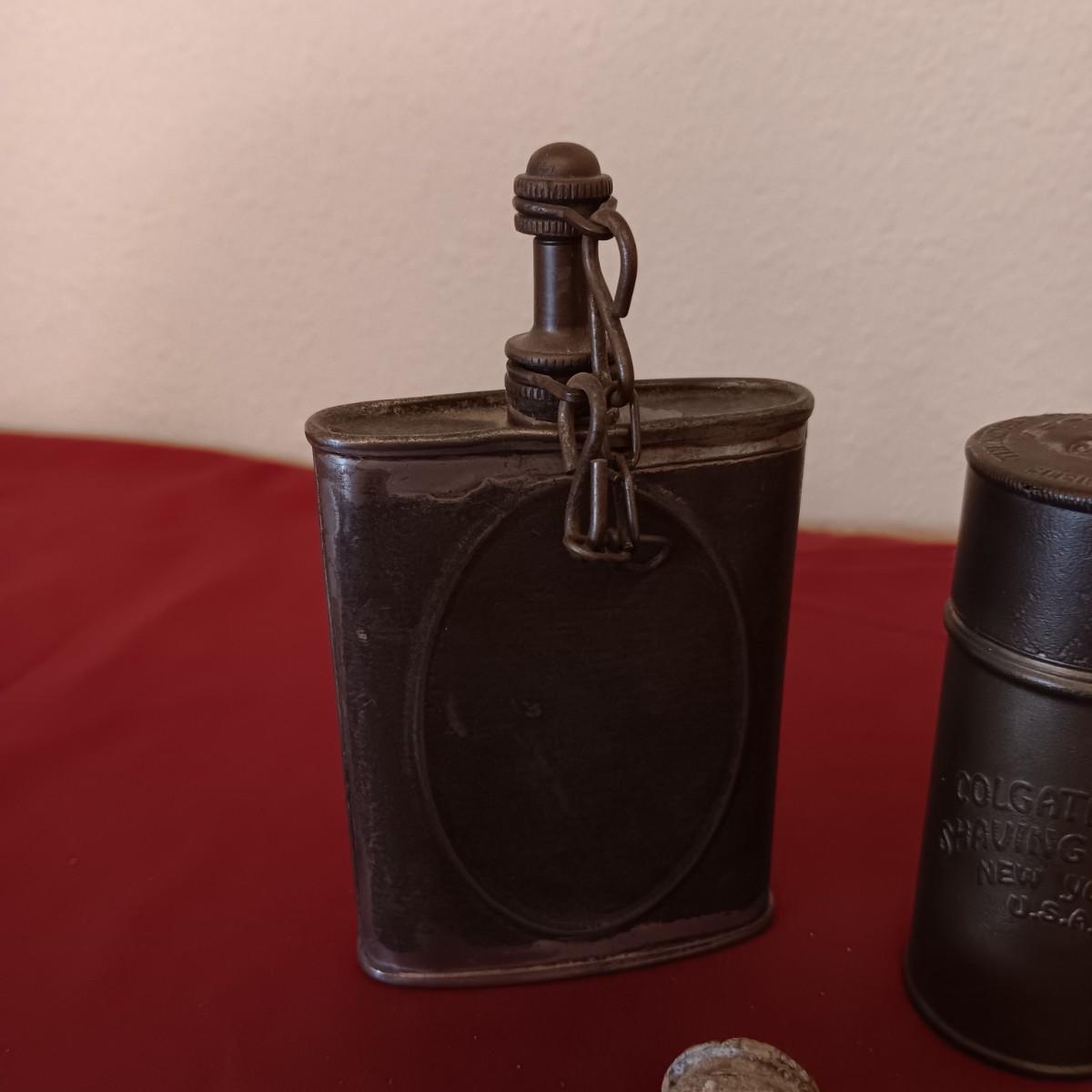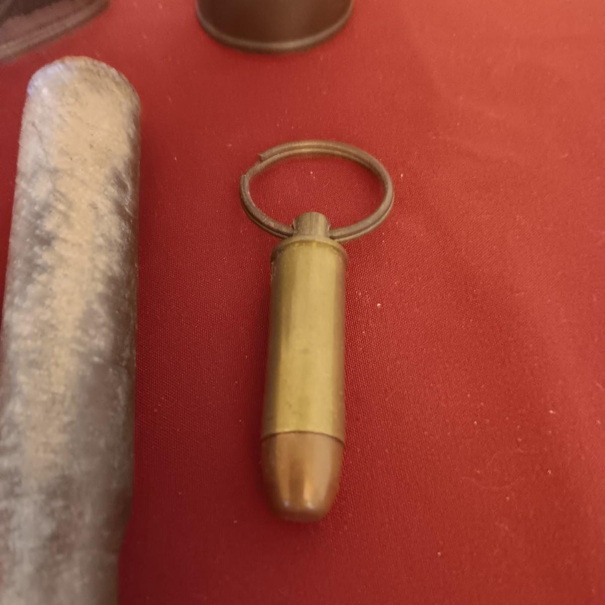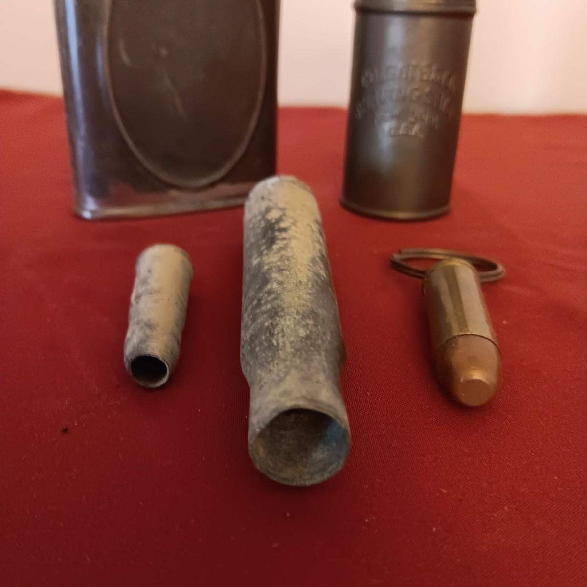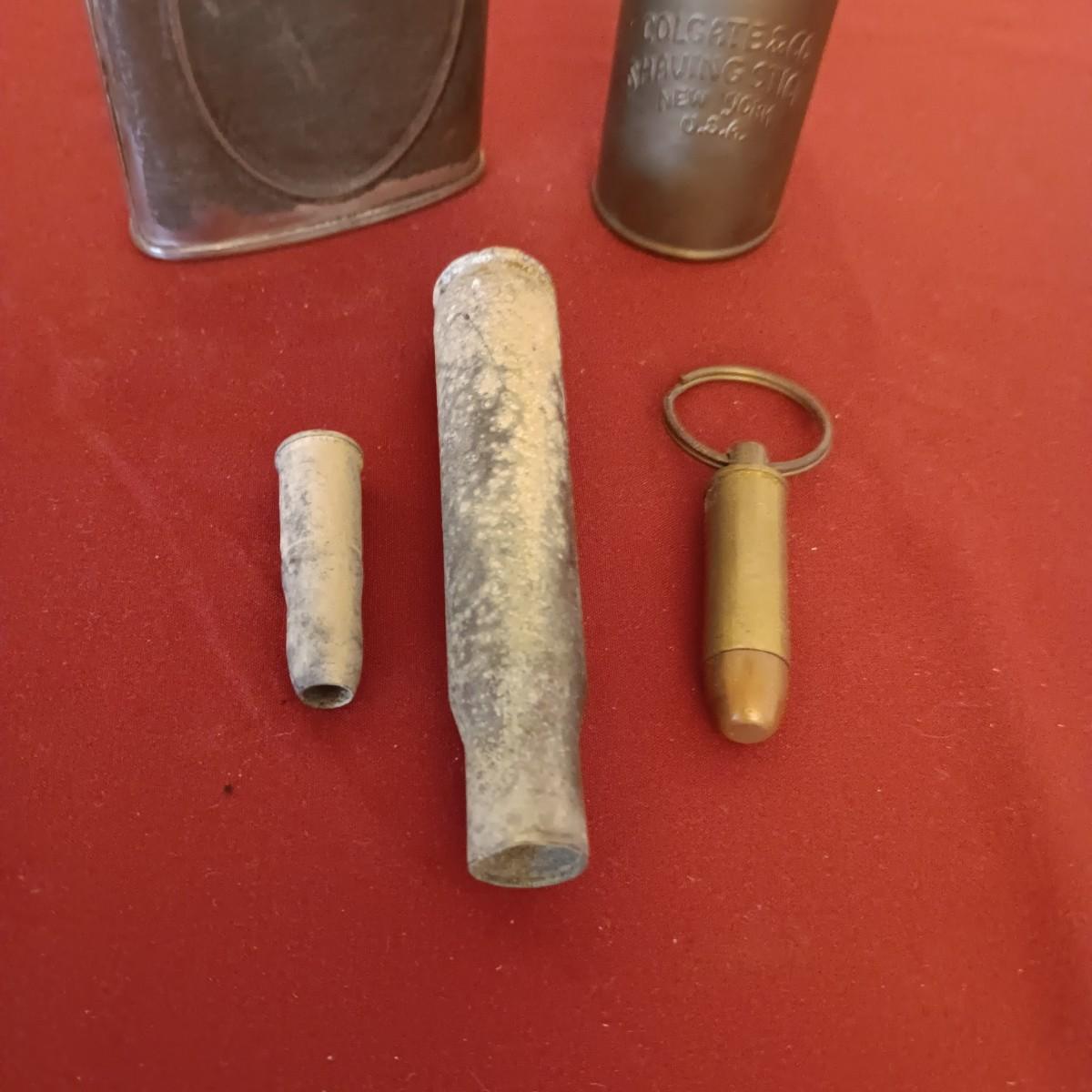 MILITARY MACHINE GUN OILER CAN, METAL COLGATE SHAVING STICK, BULLET KEYCHAIN AND SPENT CARTRIDGES