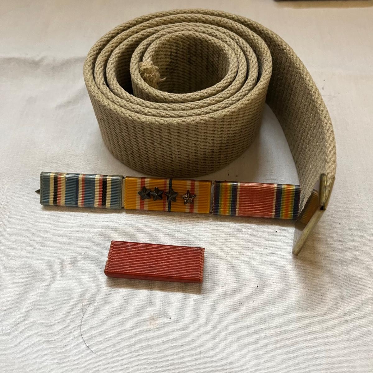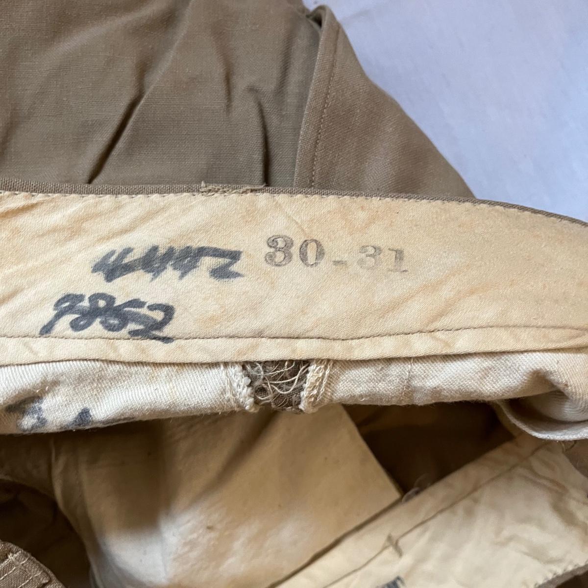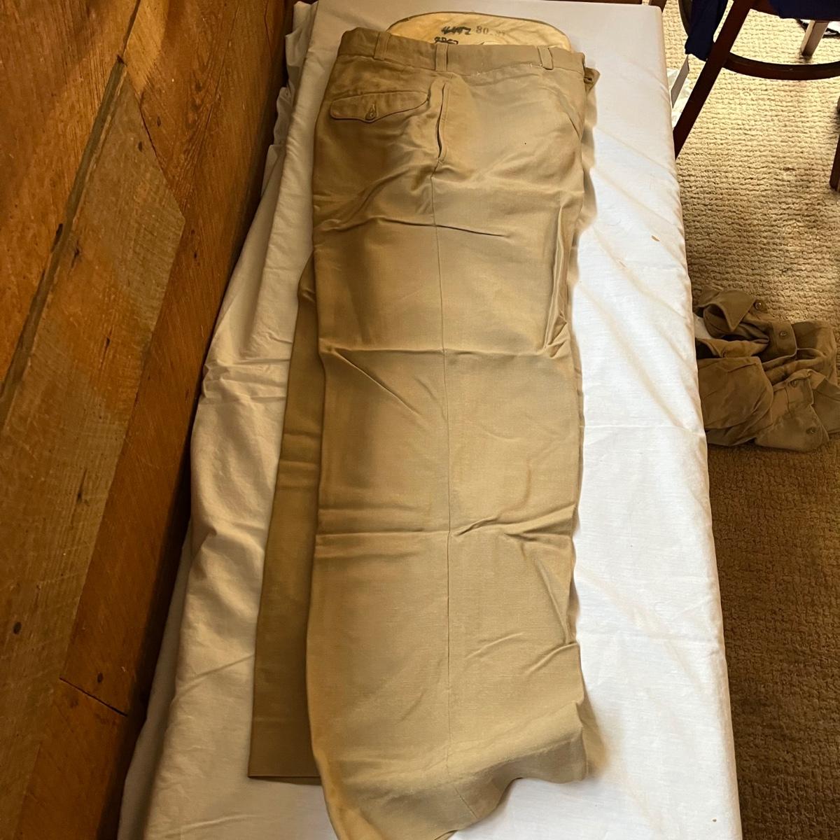 This lot contains a US Navy Asiatic Pacific and WWII medal, five corporal patches, two pairs of pants marked 30-31, shirt and a belt with no buckle.