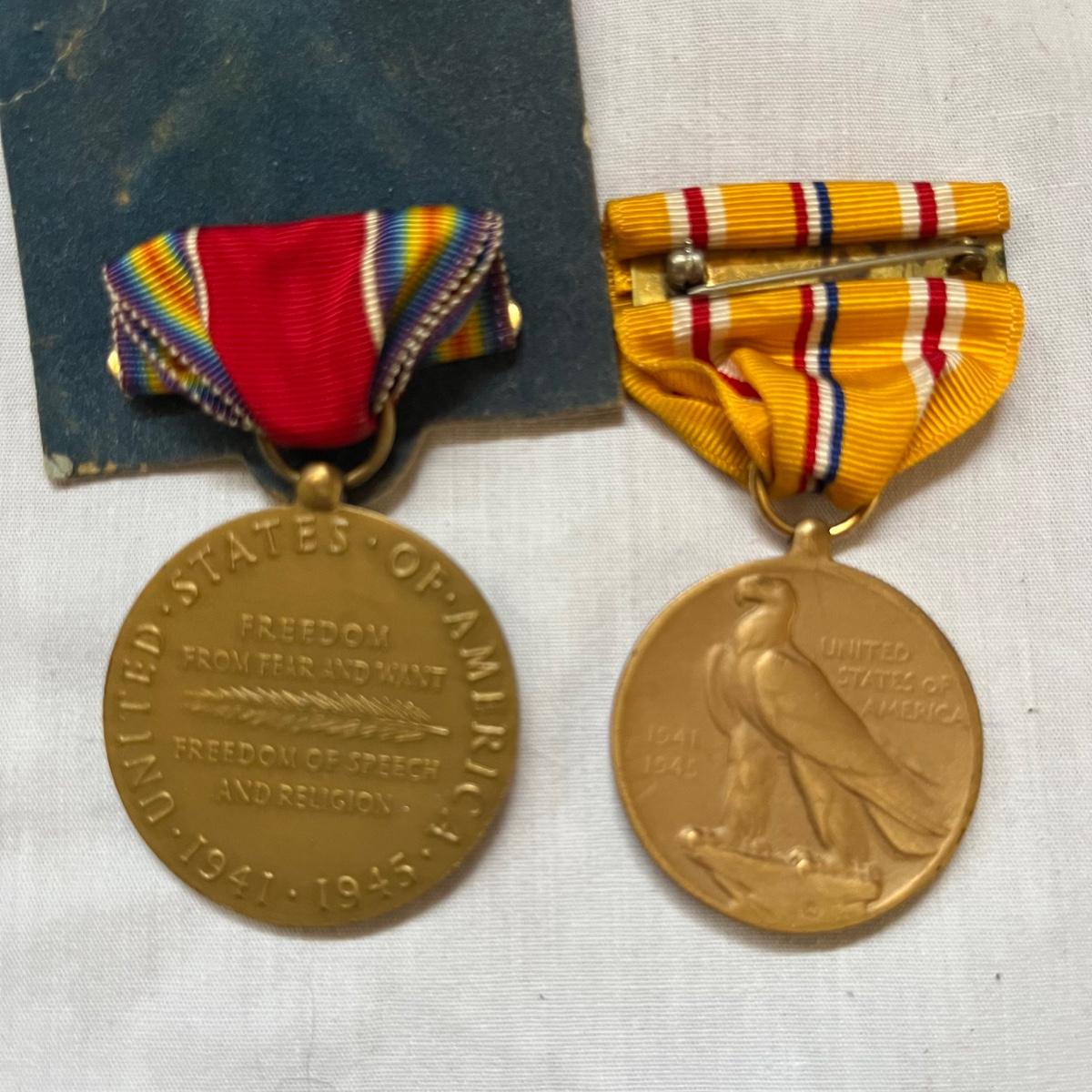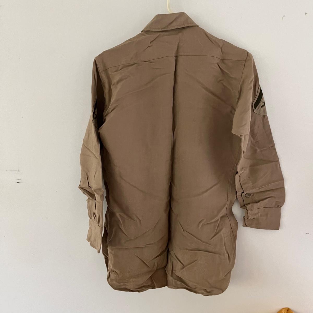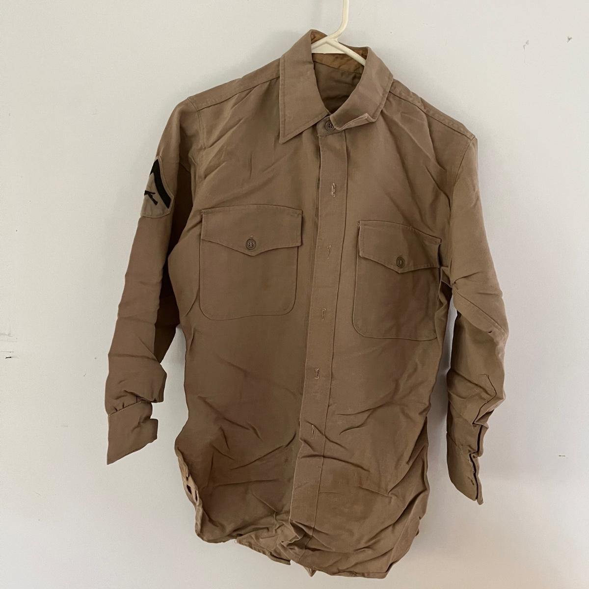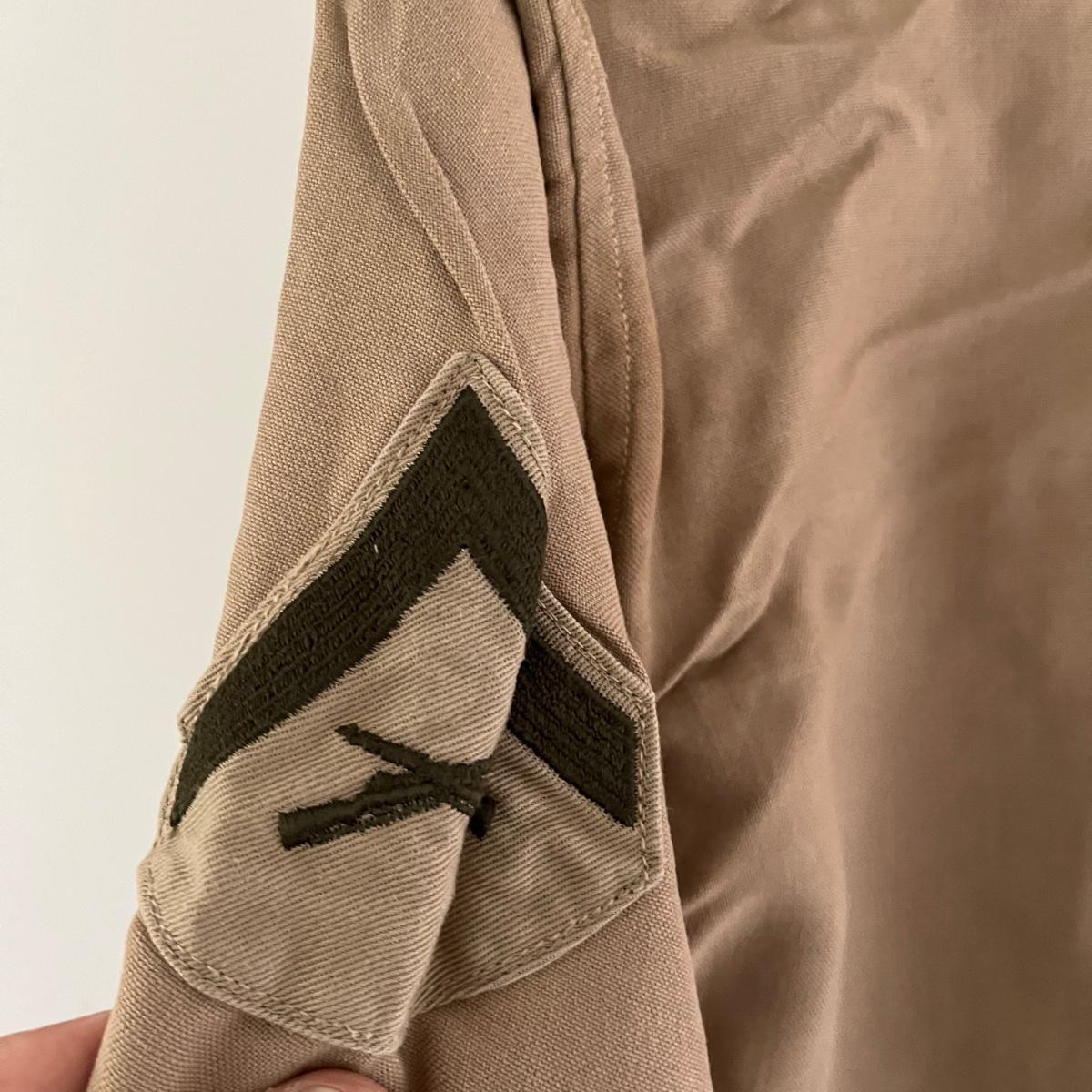 This lot contains a US Navy Asiatic Pacific and WWII medal, five corporal patches, two pairs of pants marked 30-31, shirt and a belt with no buckle.