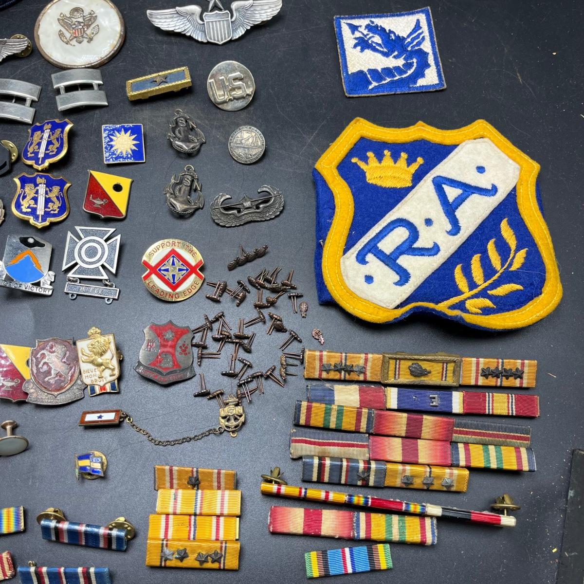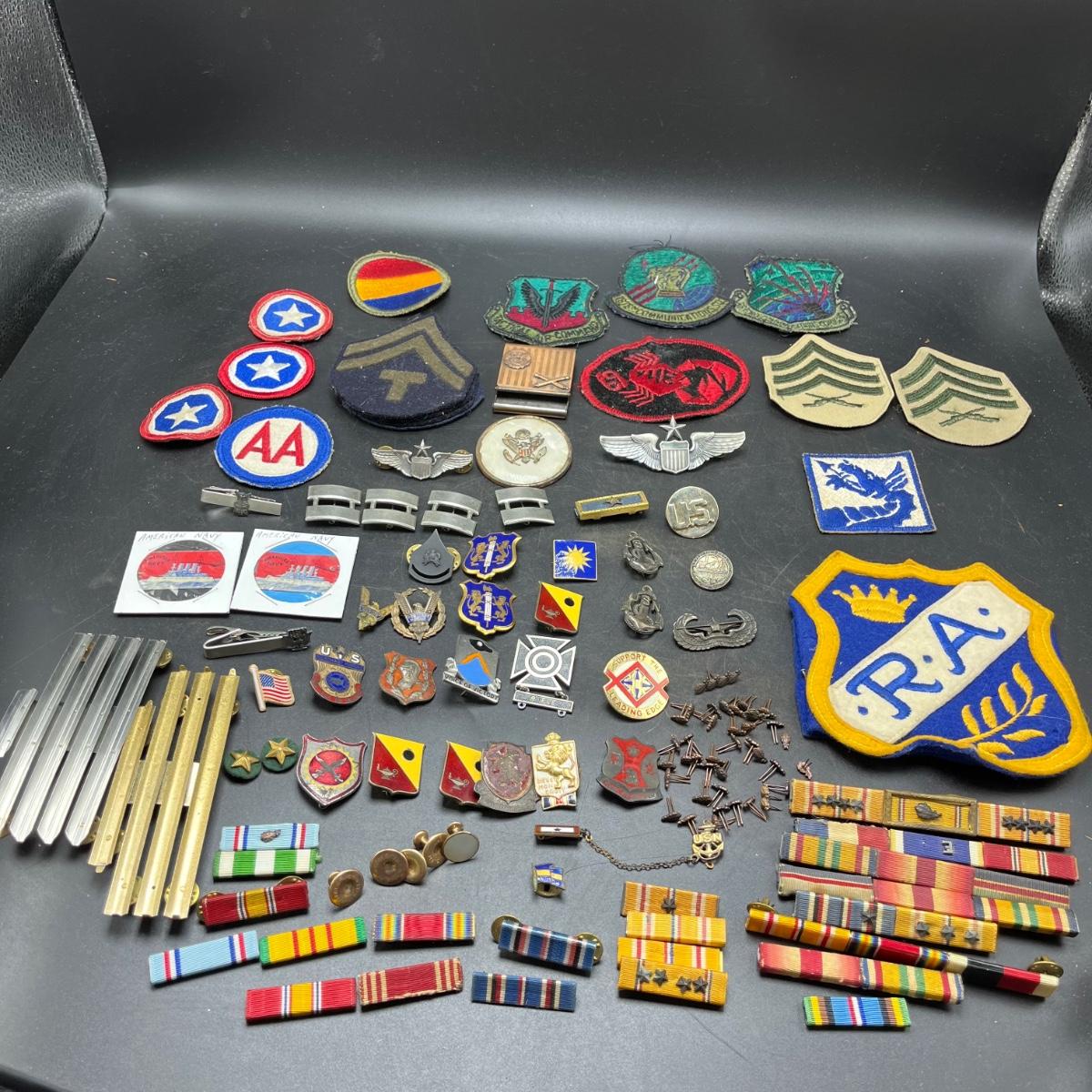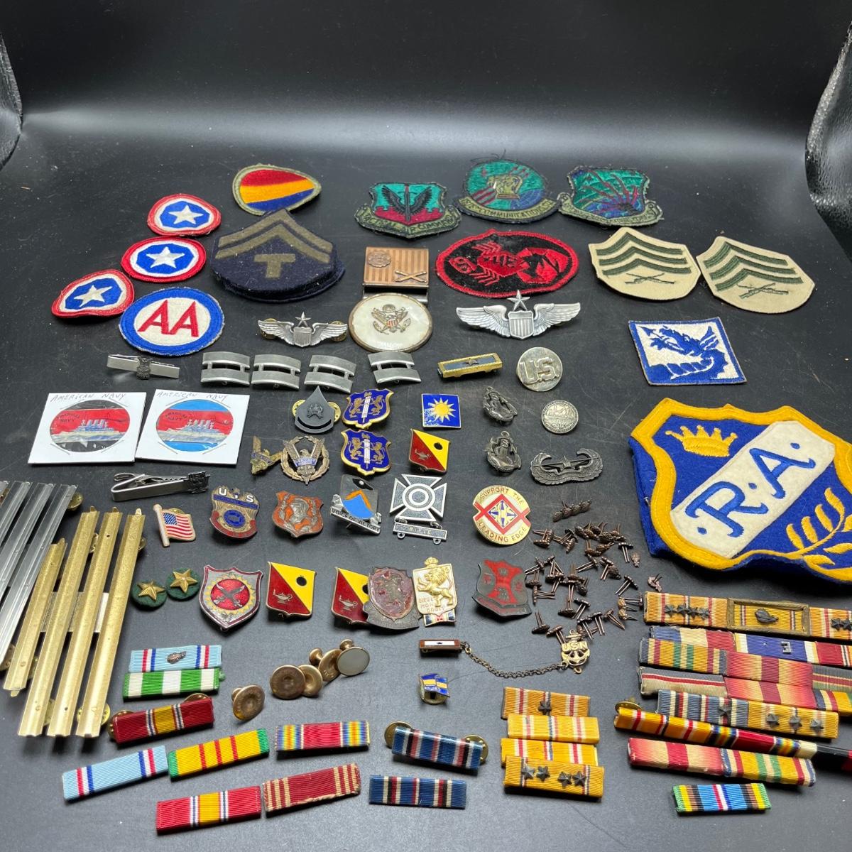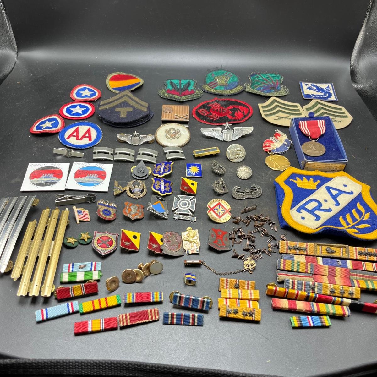 Lot contains military patches, ribbons, pins, shirt studs, boxing medal and a good conduct medal. Largest medal measures 4.25” x 4.5”.