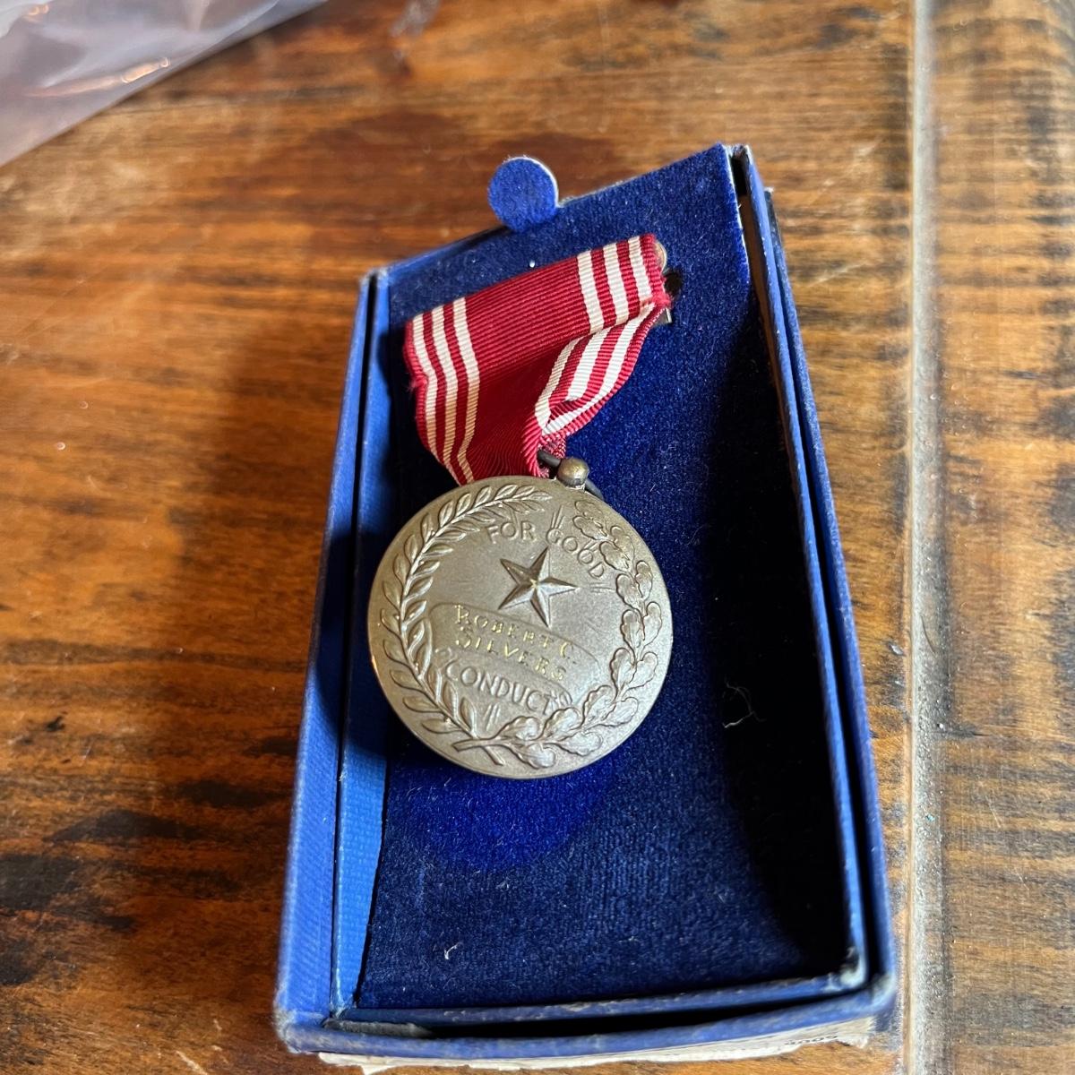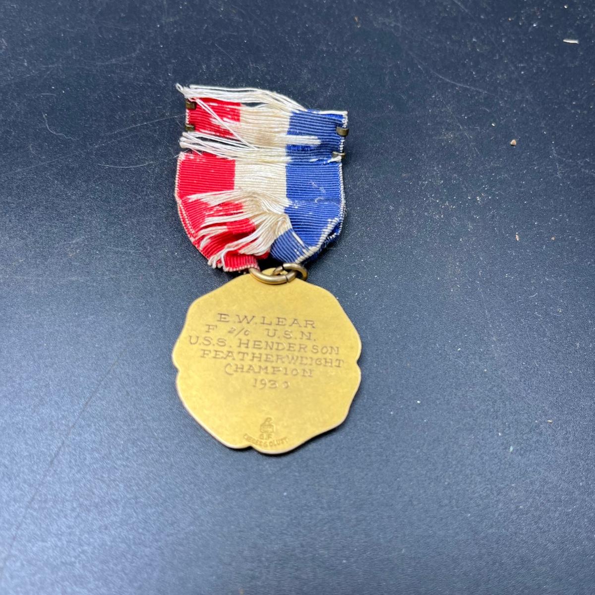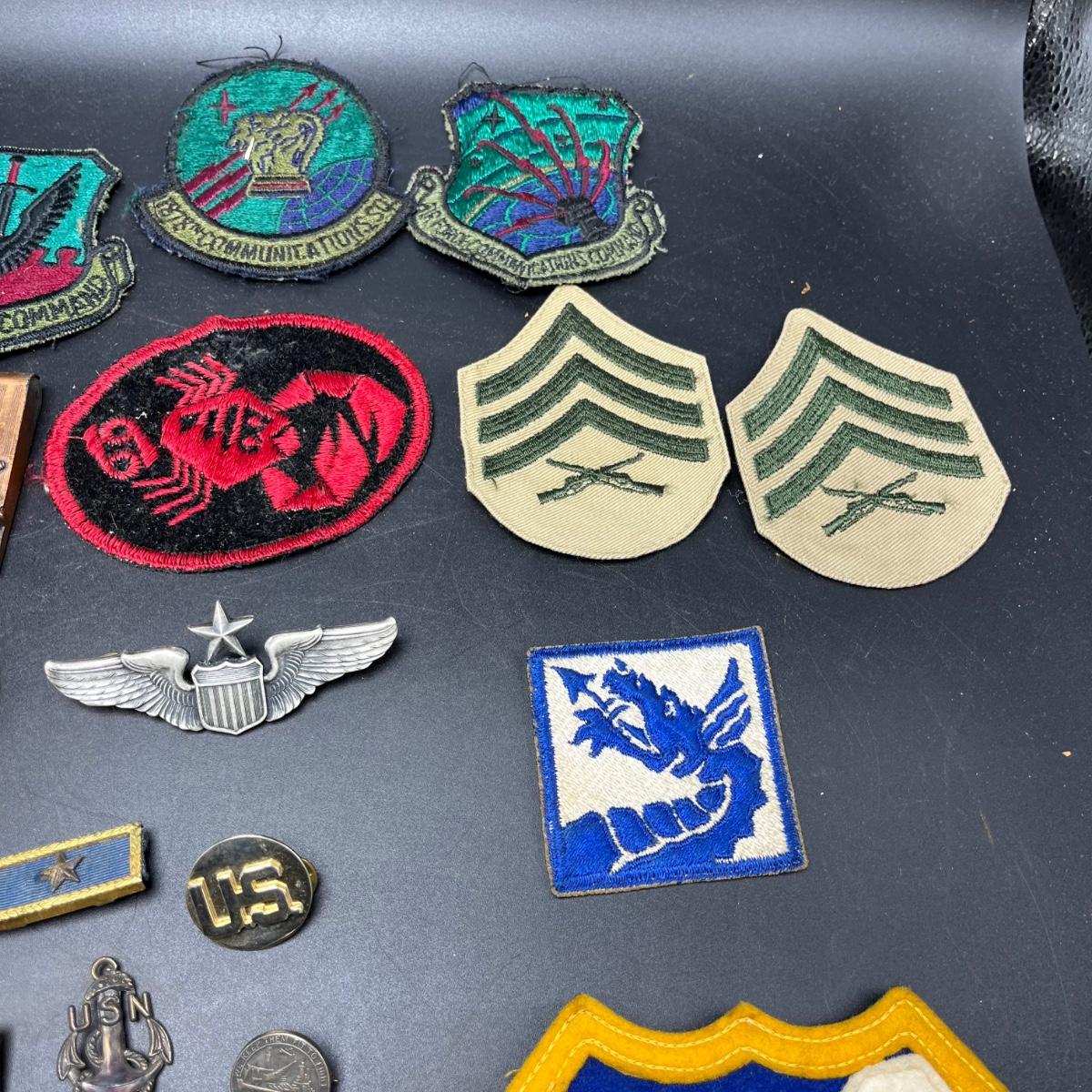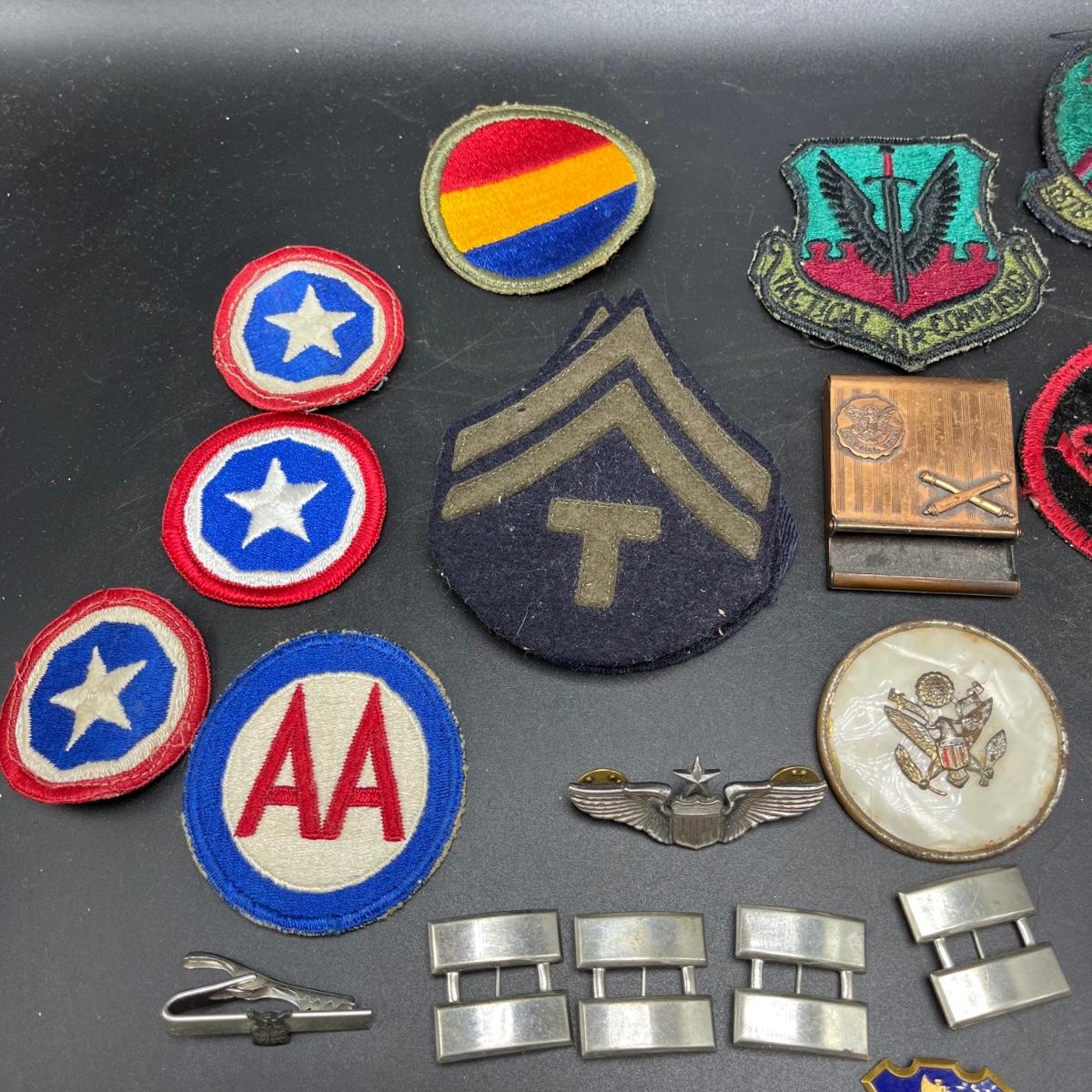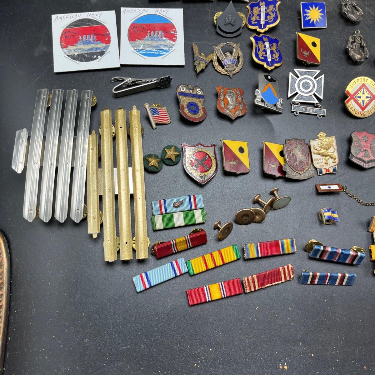 Lot contains military patches, ribbons, pins, shirt studs, boxing medal and a good conduct medal. Largest medal measures 4.25” x 4.5”.