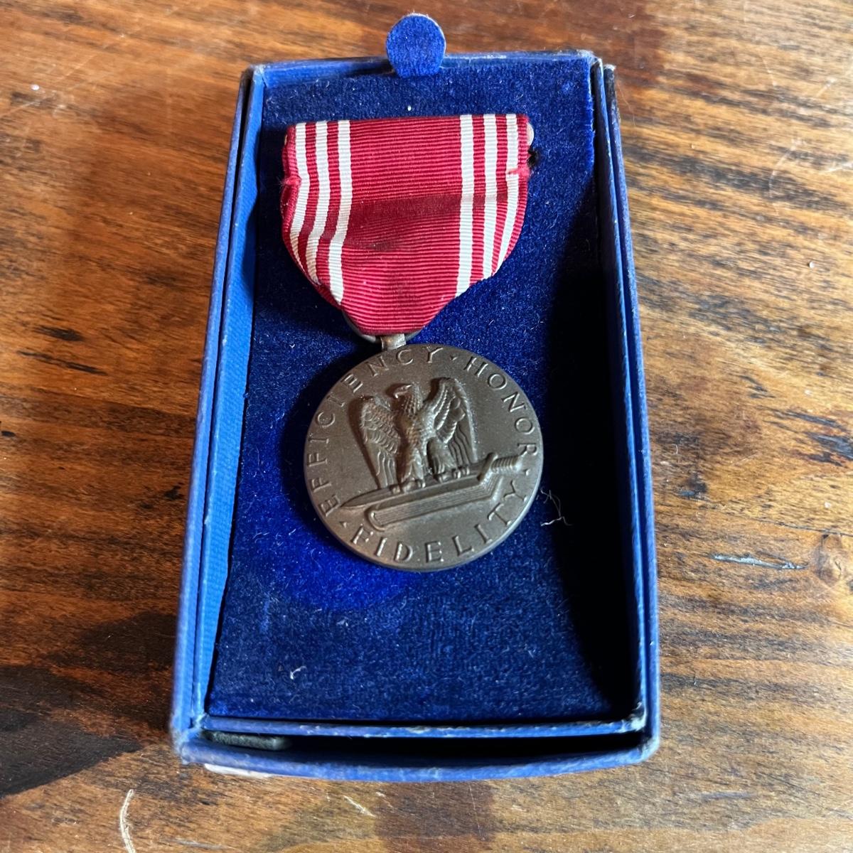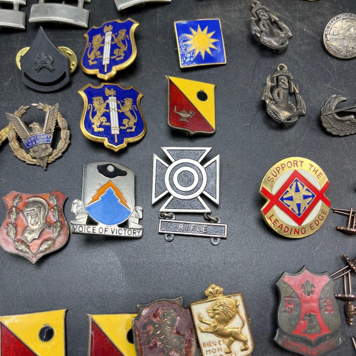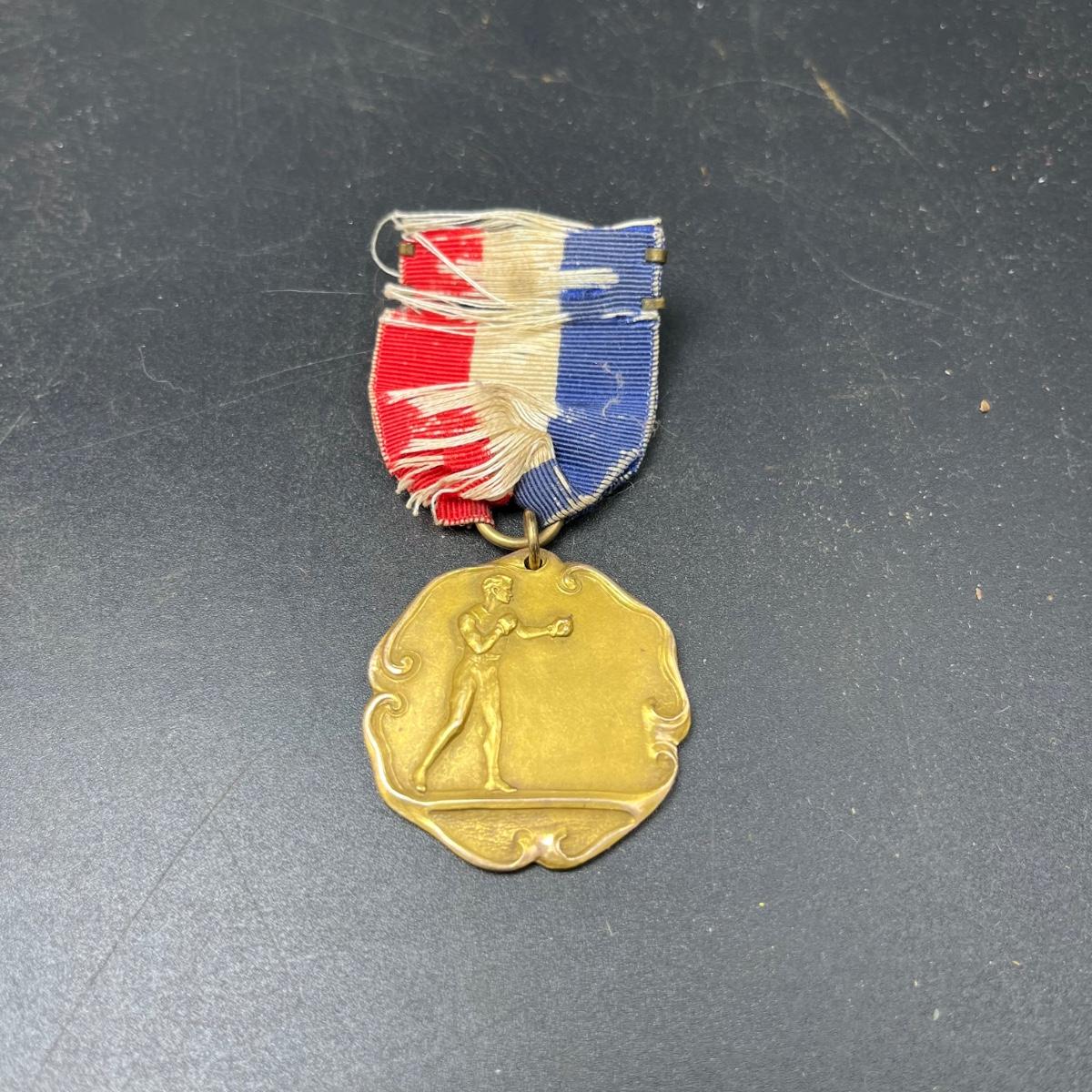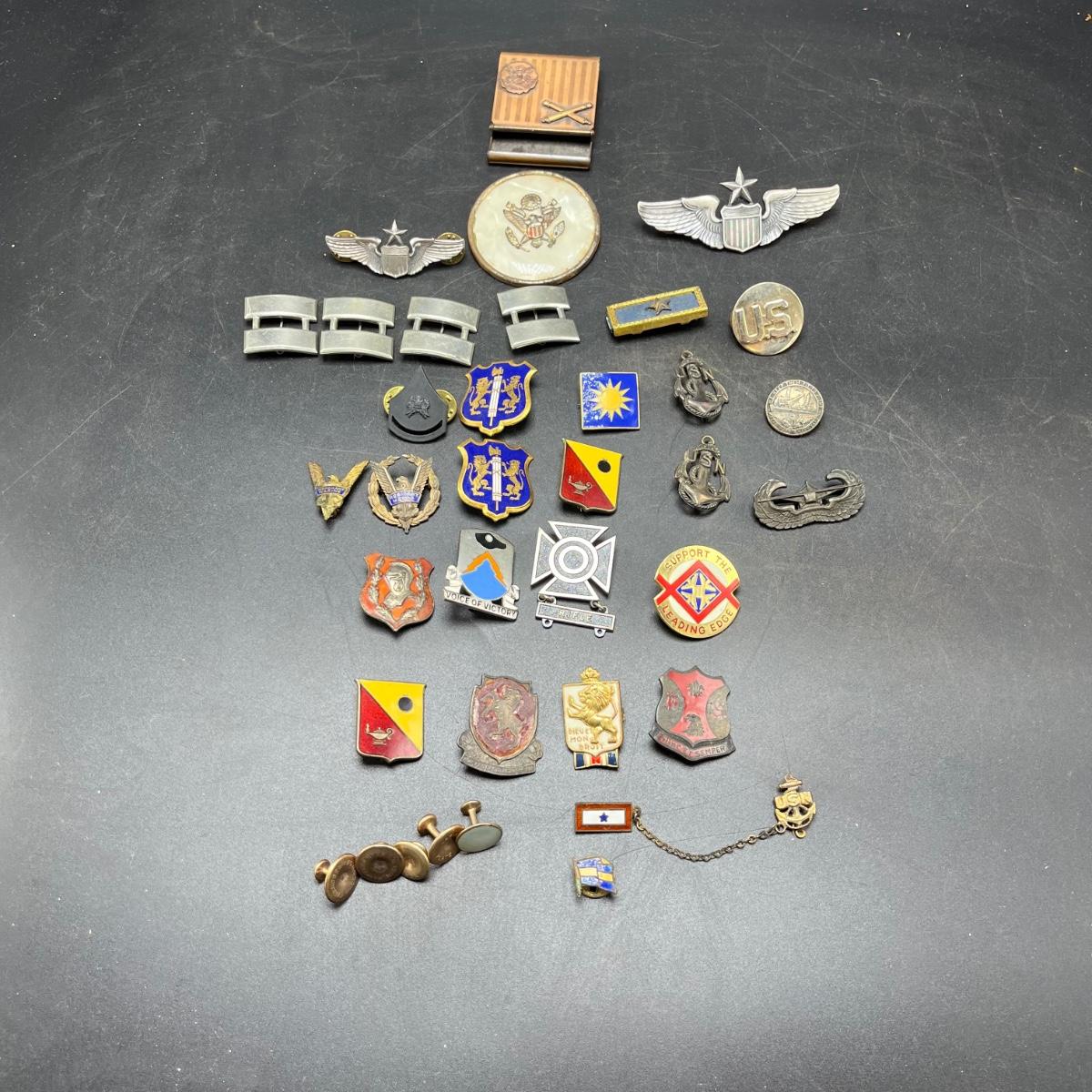 Lot contains military patches, ribbons, pins, shirt studs, boxing medal and a good conduct medal. Largest medal measures 4.25” x 4.5”.