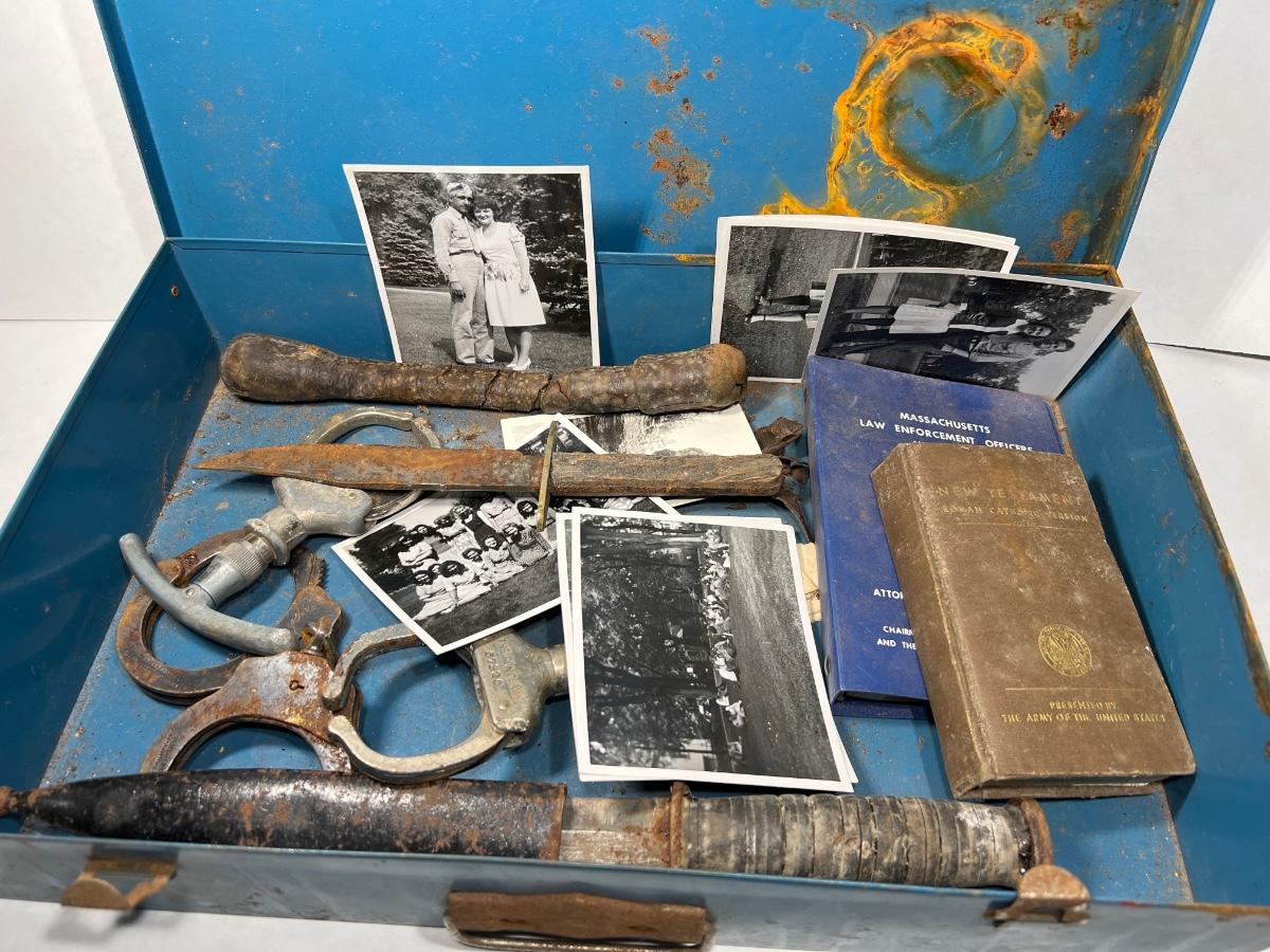 Estate found, K BAR knife, law enforcement Handcuffs, army photographs