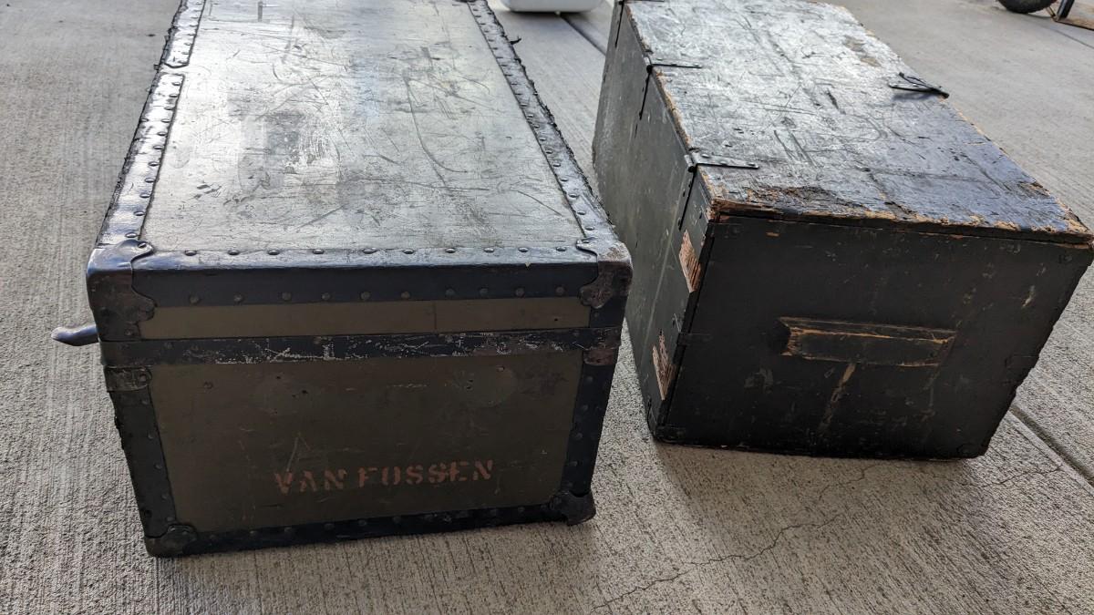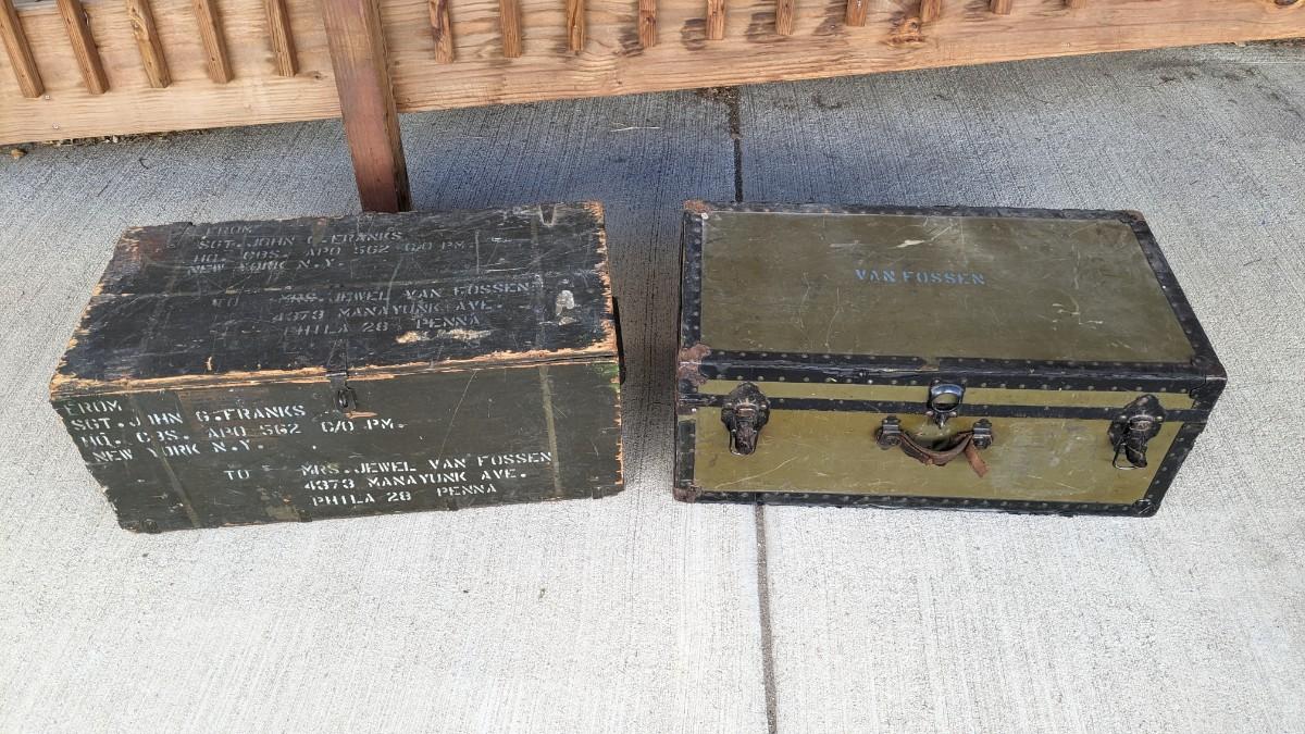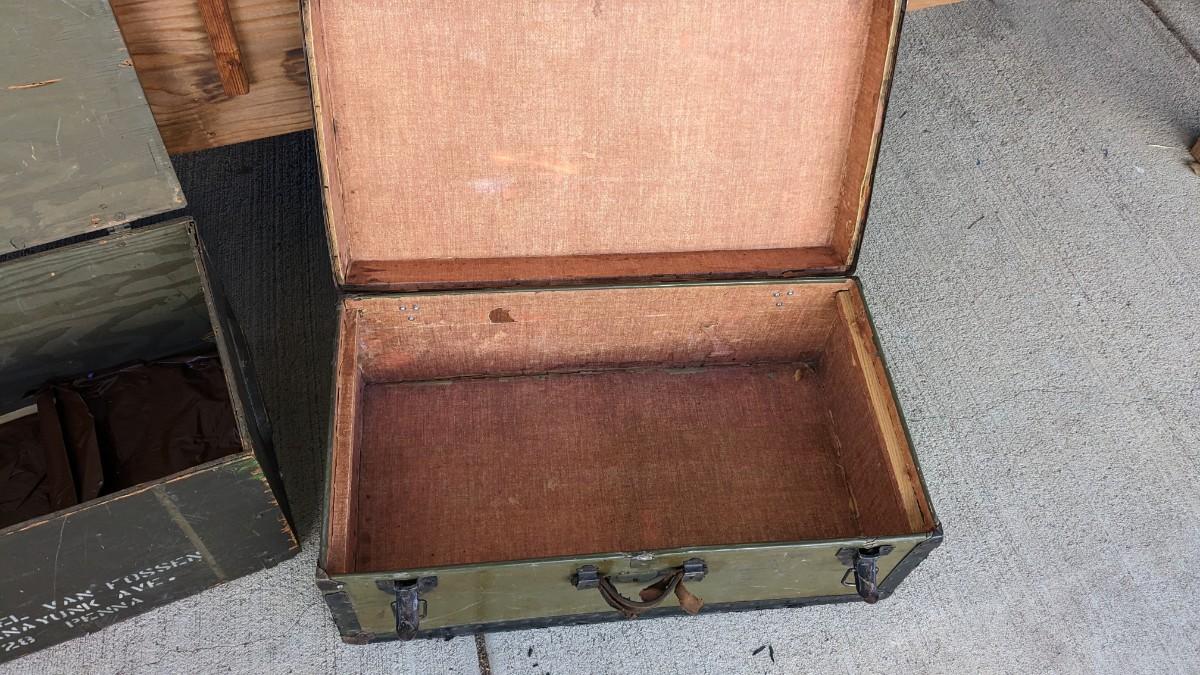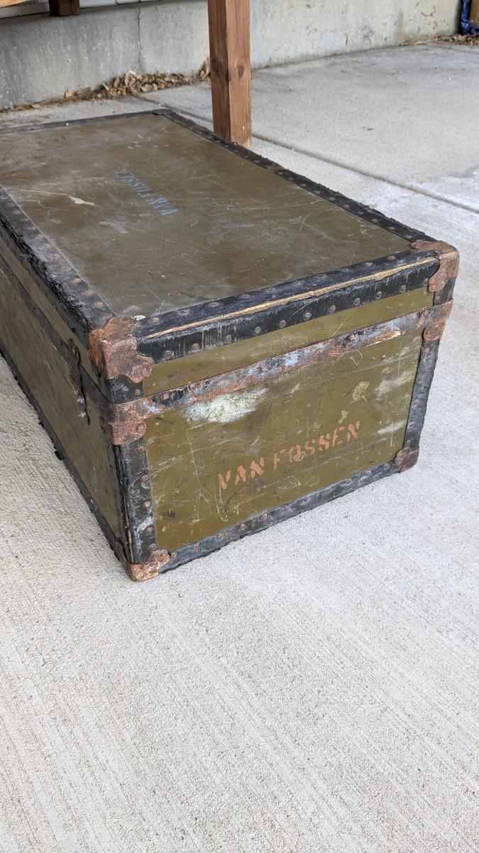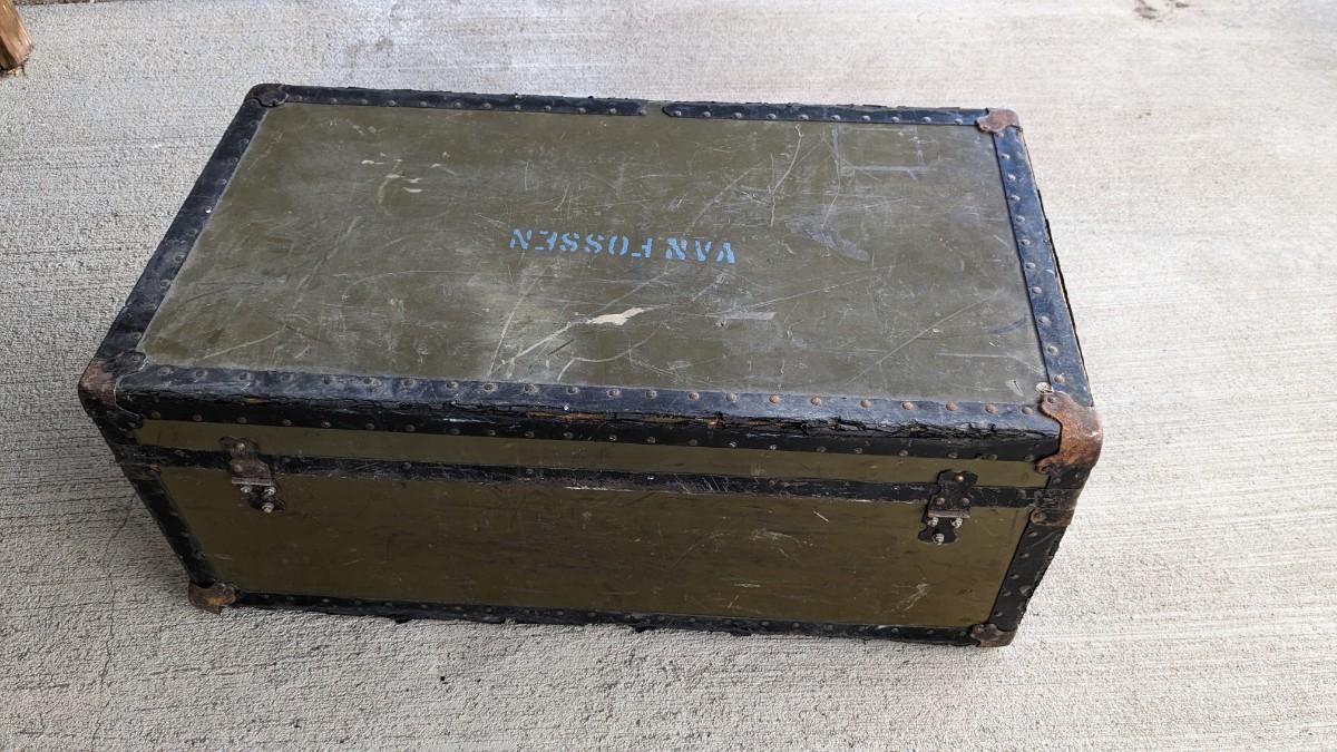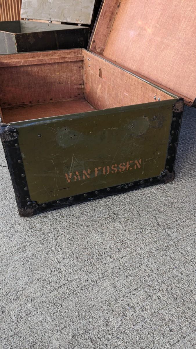 2ea, 1 solid wood 31.75"x16"x12.5" with stenciled addresses still intact on outside, American Luggage Works 1943 on the inside of the lid lots of chipping, and a ton of character to this piece. Also includes standard metal and leather handle trunk 30 5/8"x16.75"x 12 7/8" with stenciled name on top and side, piece shows a lot of wear. Both trunks have the Van Fossen last name and are really neat pieces to use as storage or to create permanent fixtures in your home. No shipping. Shed