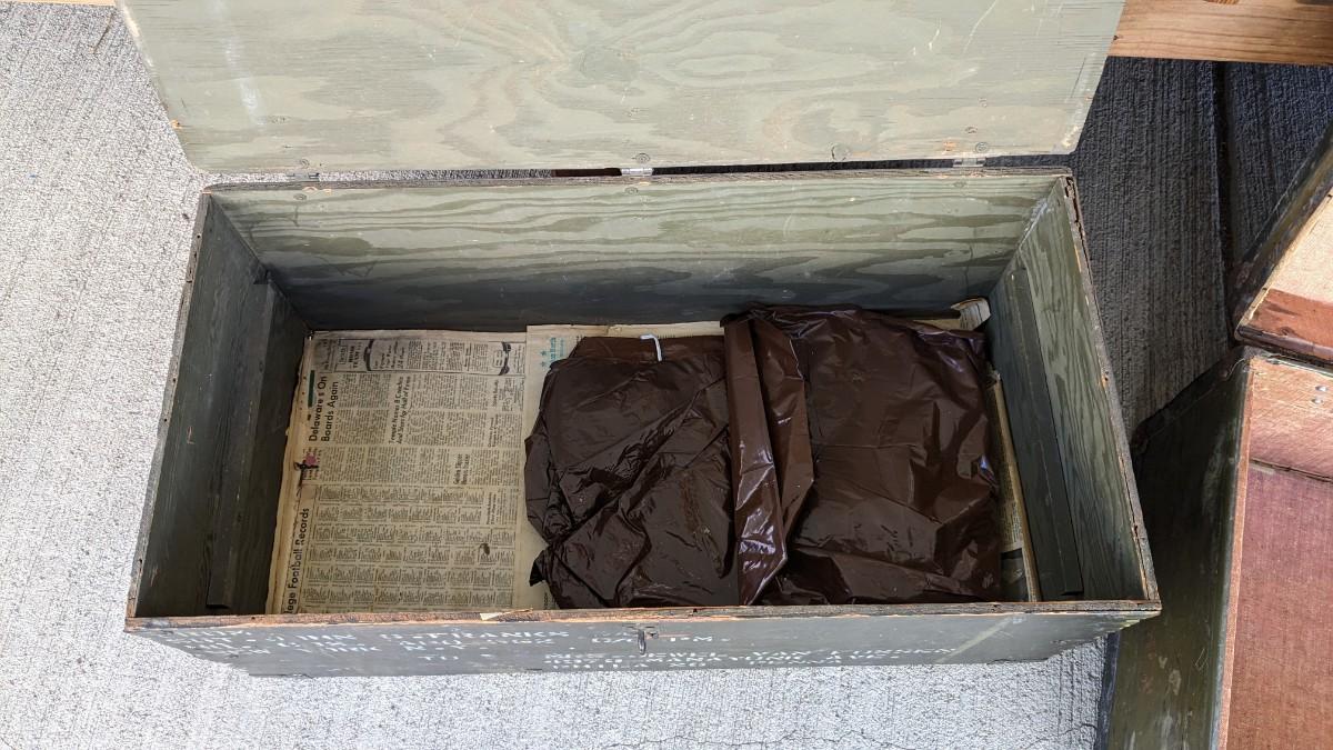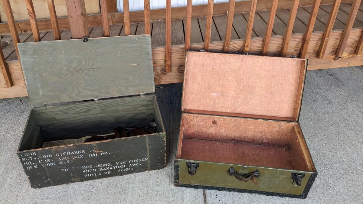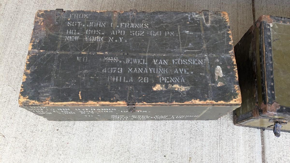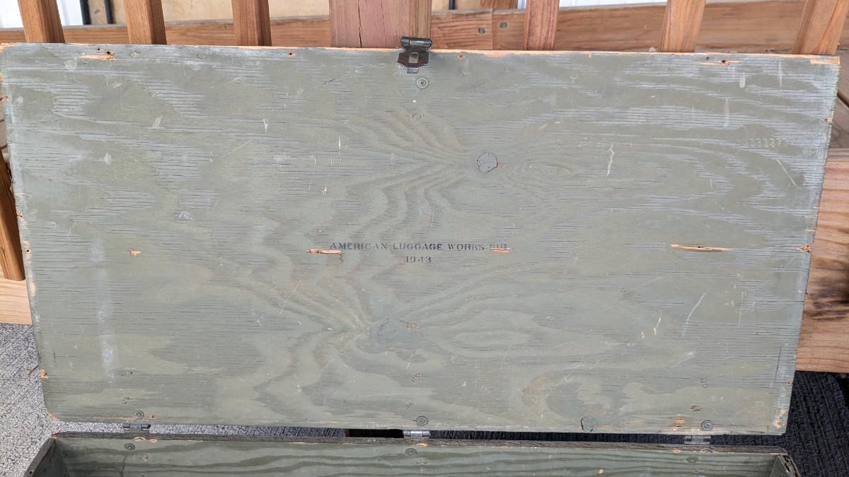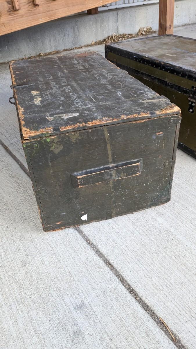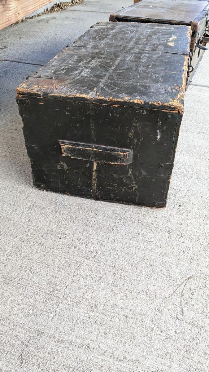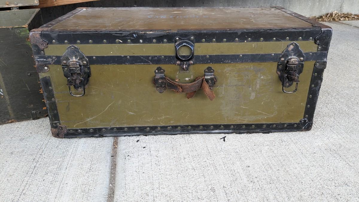 2ea, 1 solid wood 31.75"x16"x12.5" with stenciled addresses still intact on outside, American Luggage Works 1943 on the inside of the lid lots of chipping, and a ton of character to this piece. Also includes standard metal and leather handle trunk 30 5/8"x16.75"x 12 7/8" with stenciled name on top and side, piece shows a lot of wear. Both trunks have the Van Fossen last name and are really neat pieces to use as storage or to create permanent fixtures in your home. No shipping. Shed