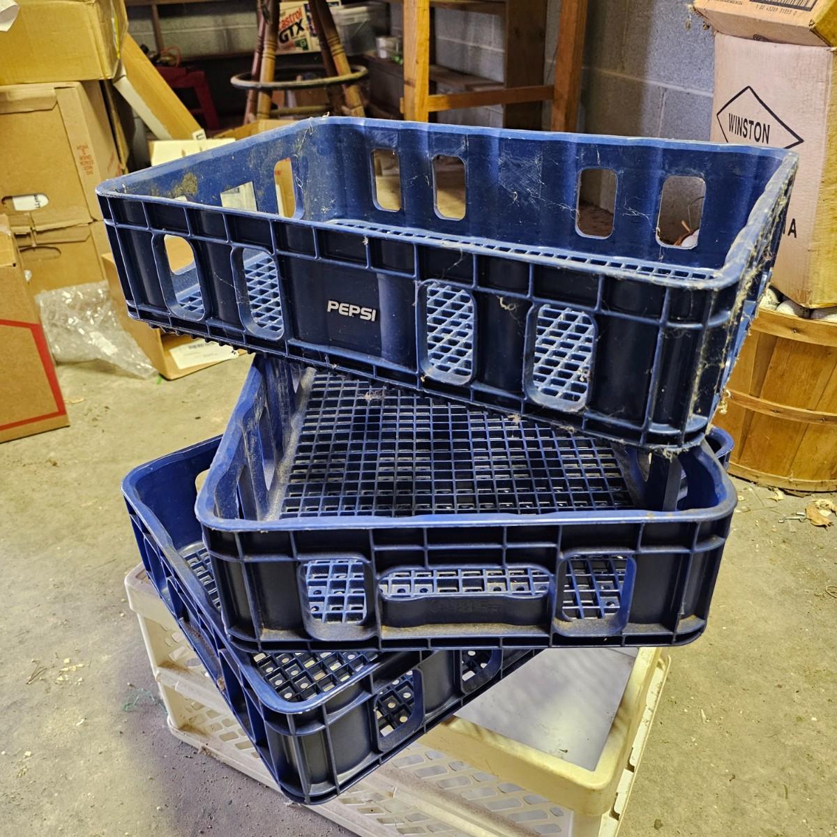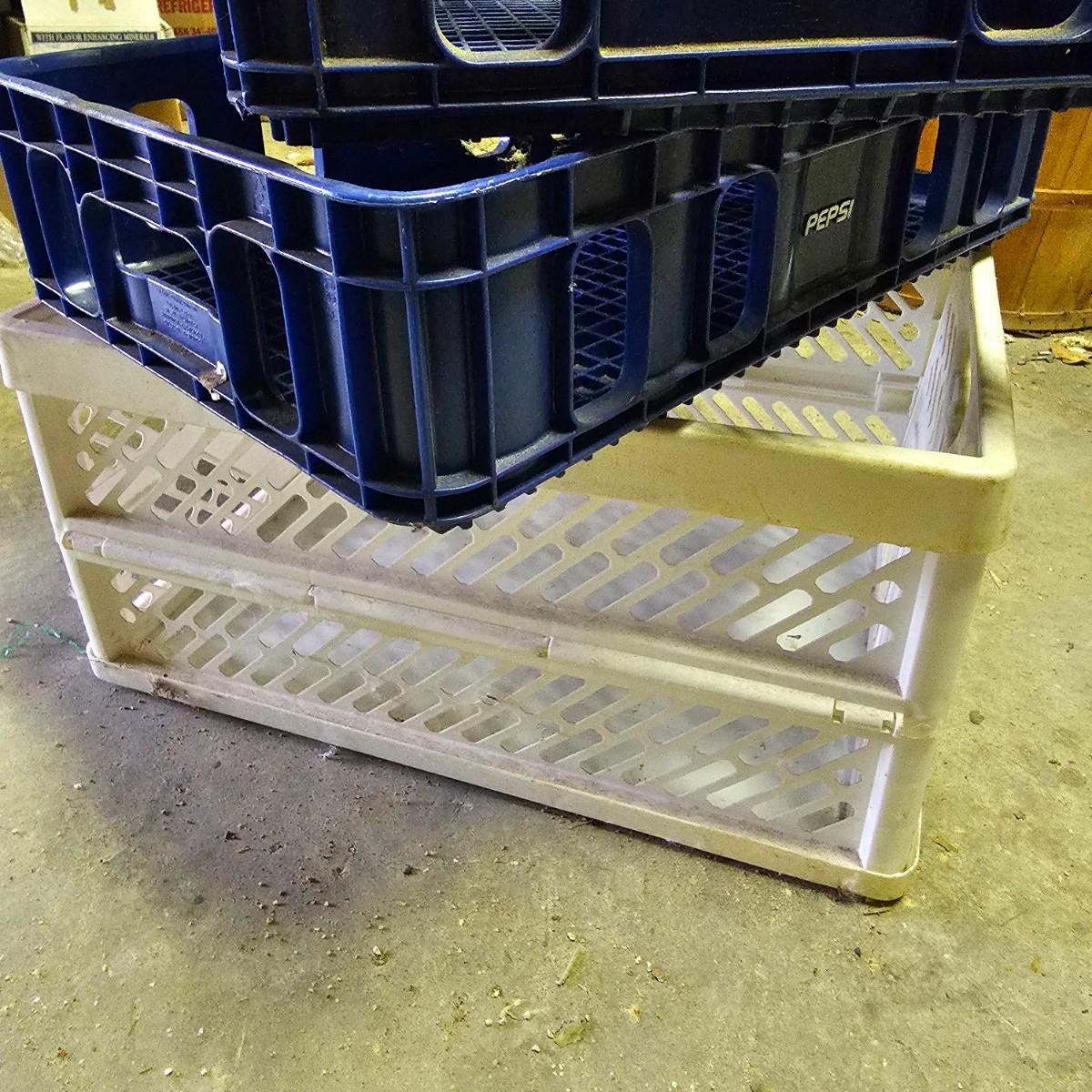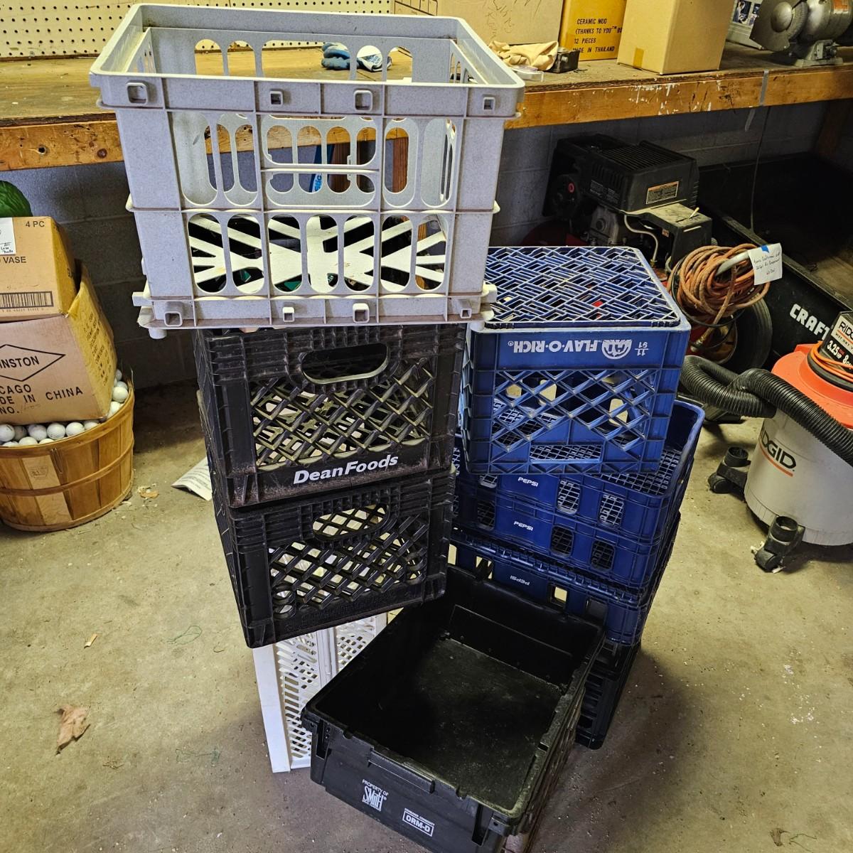 An even dozen storage crates, some milk style and others. Includes one vintage metal milk crate, all others plastic. Pepsi size units are 8.5" x 12" x 4.5"h. Largest container is 16" x 13" x 11"h. See photos for details. Local pickup only.