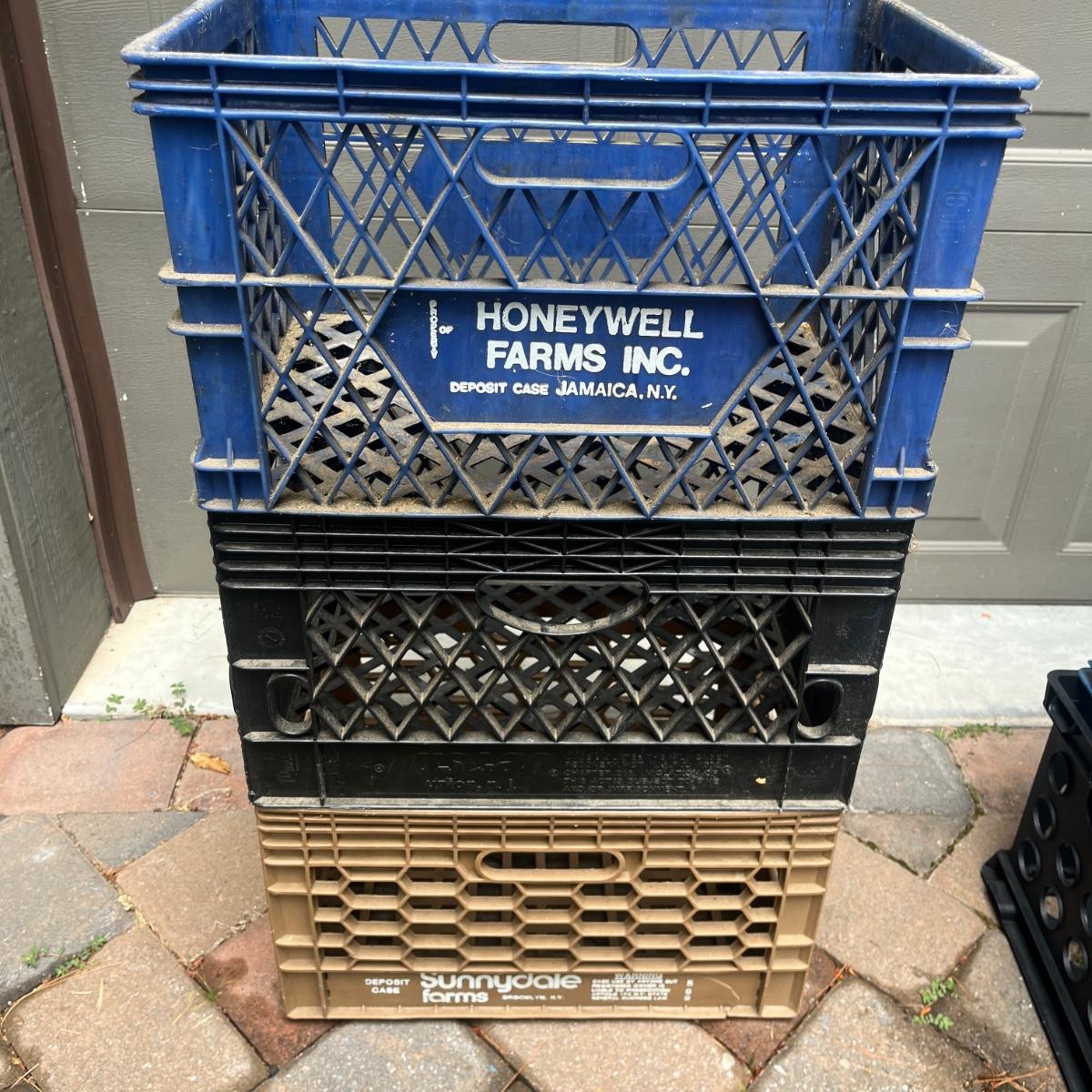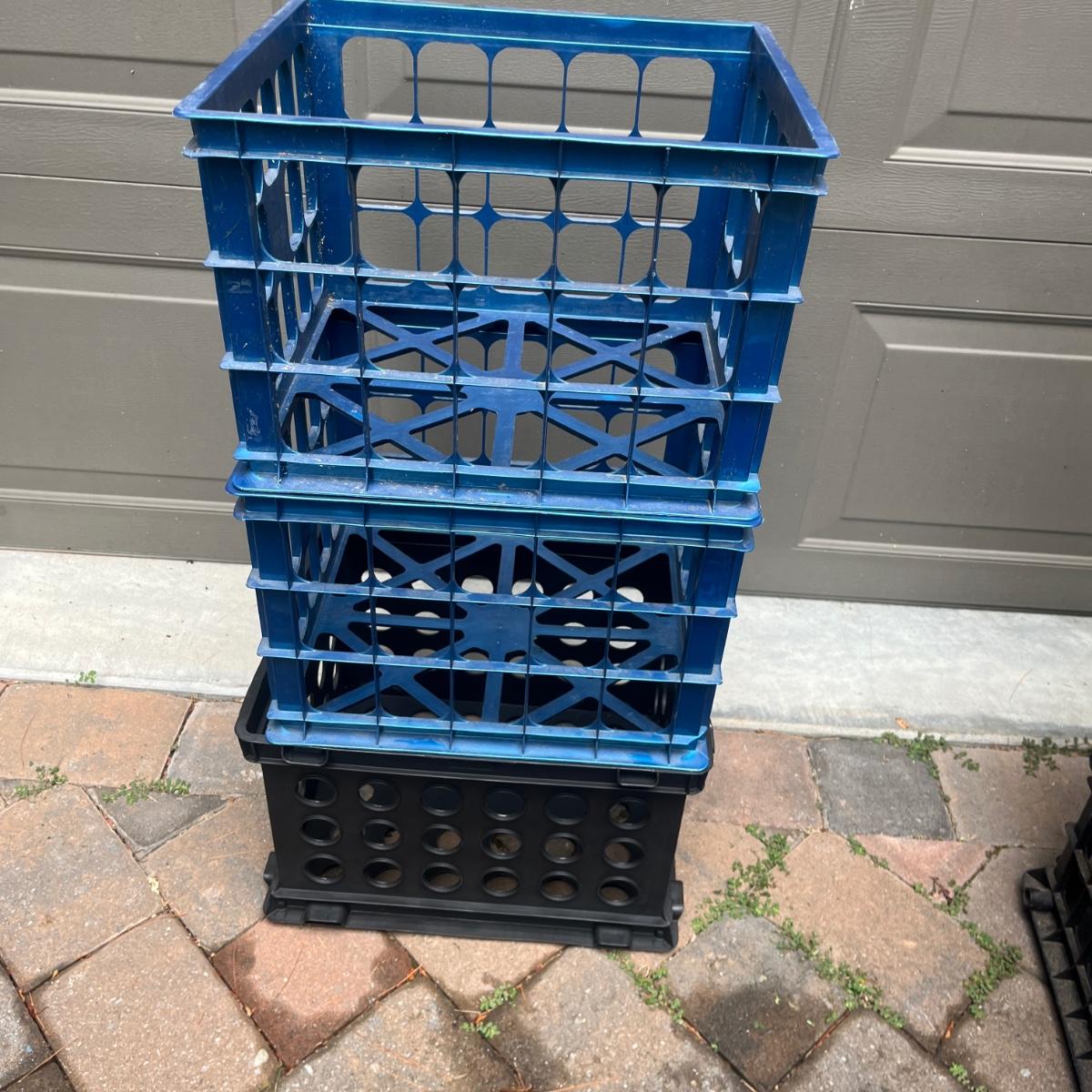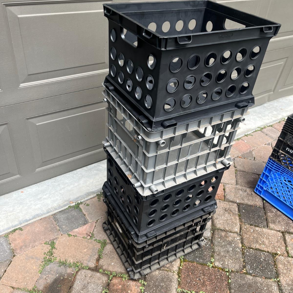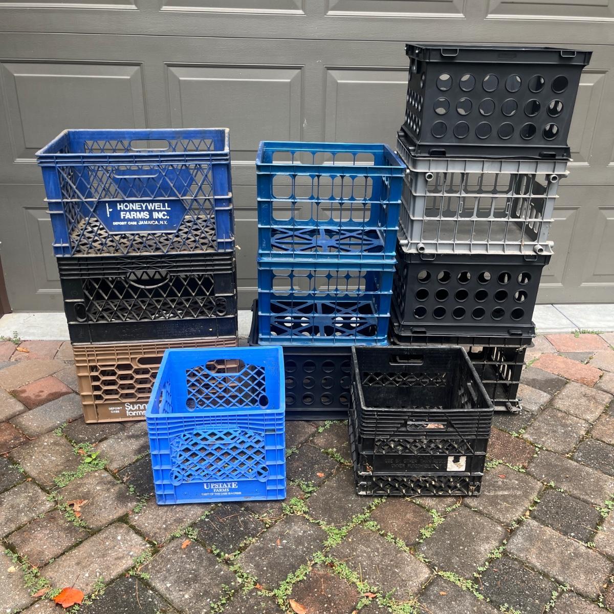 Lot includes 12 milk crates in a variety of sizes and colors. Largest crates measure 19” x 13” x 11”H.
