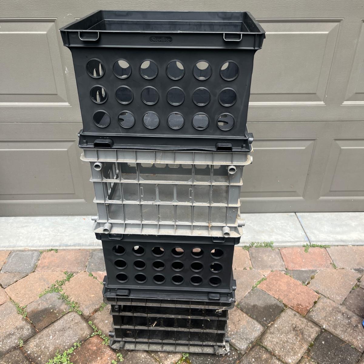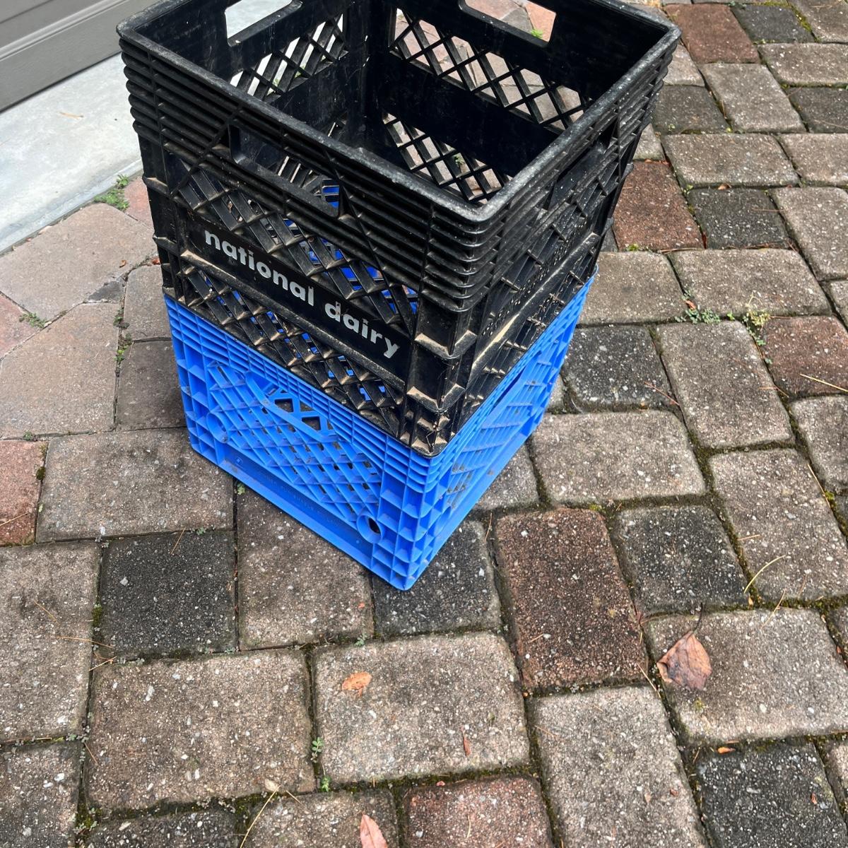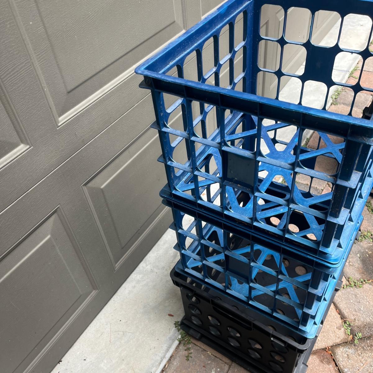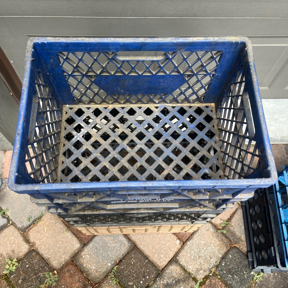 Lot includes 12 milk crates in a variety of sizes and colors. Largest crates measure 19” x 13” x 11”H.