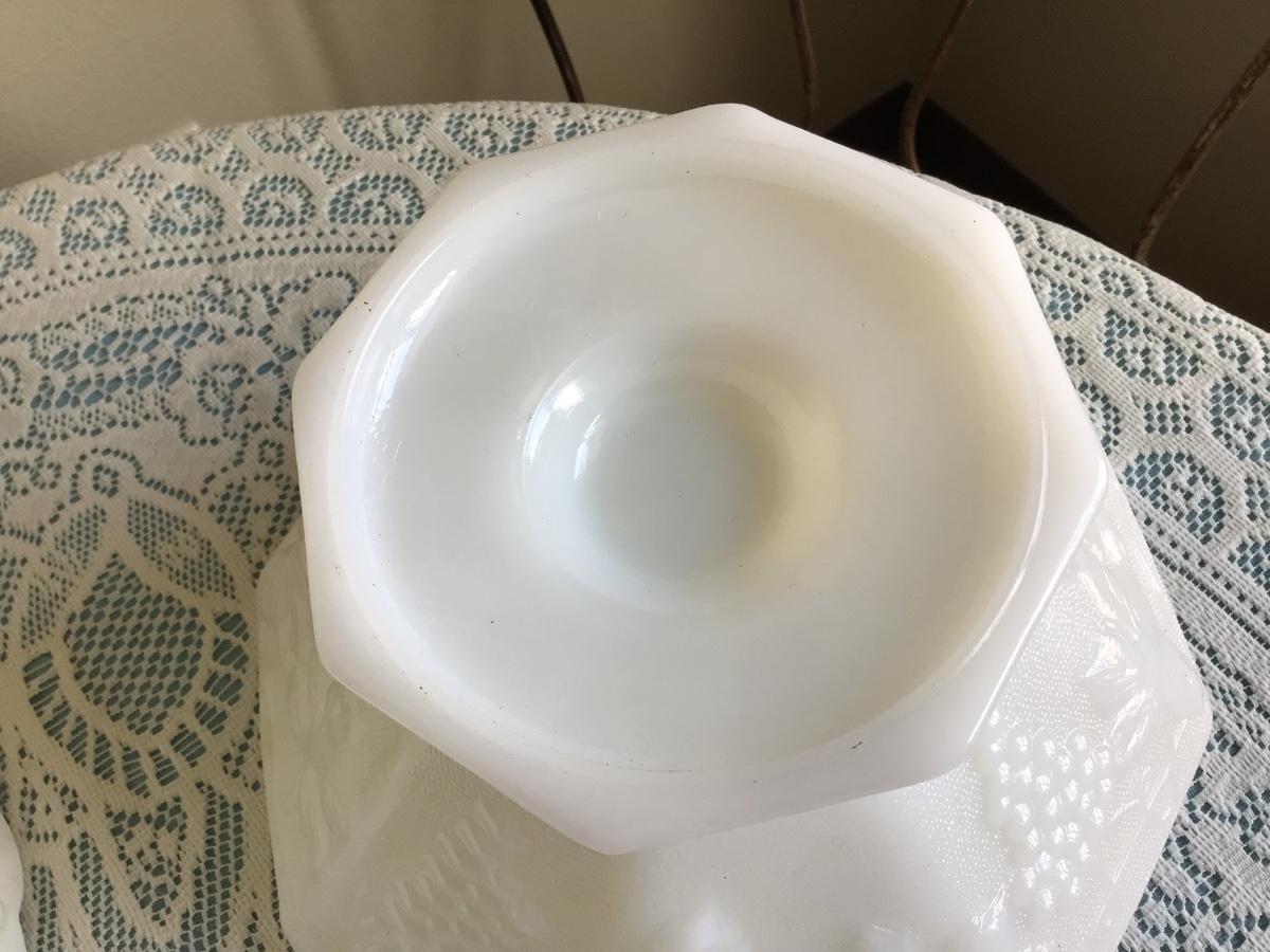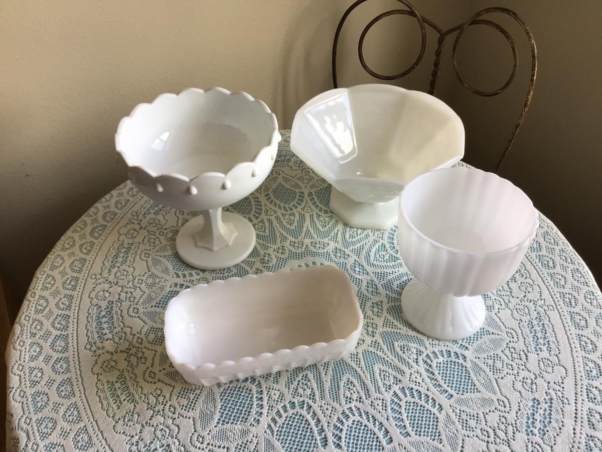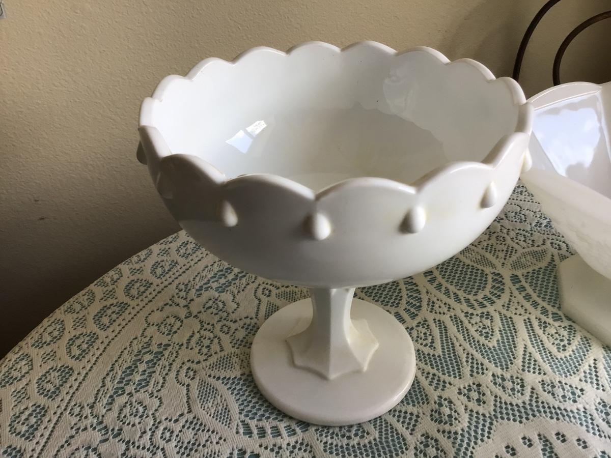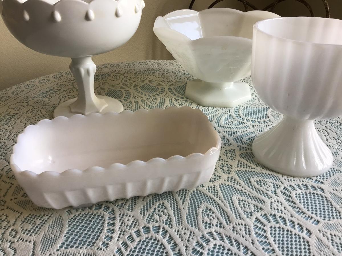 You get nice milk glass large compote, grape and leaf milk glass large footed bowl, medium milk glass compote and a rectangular milk glass bowl.