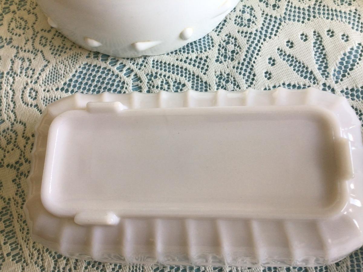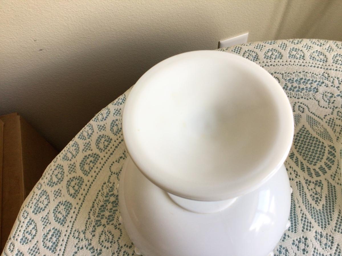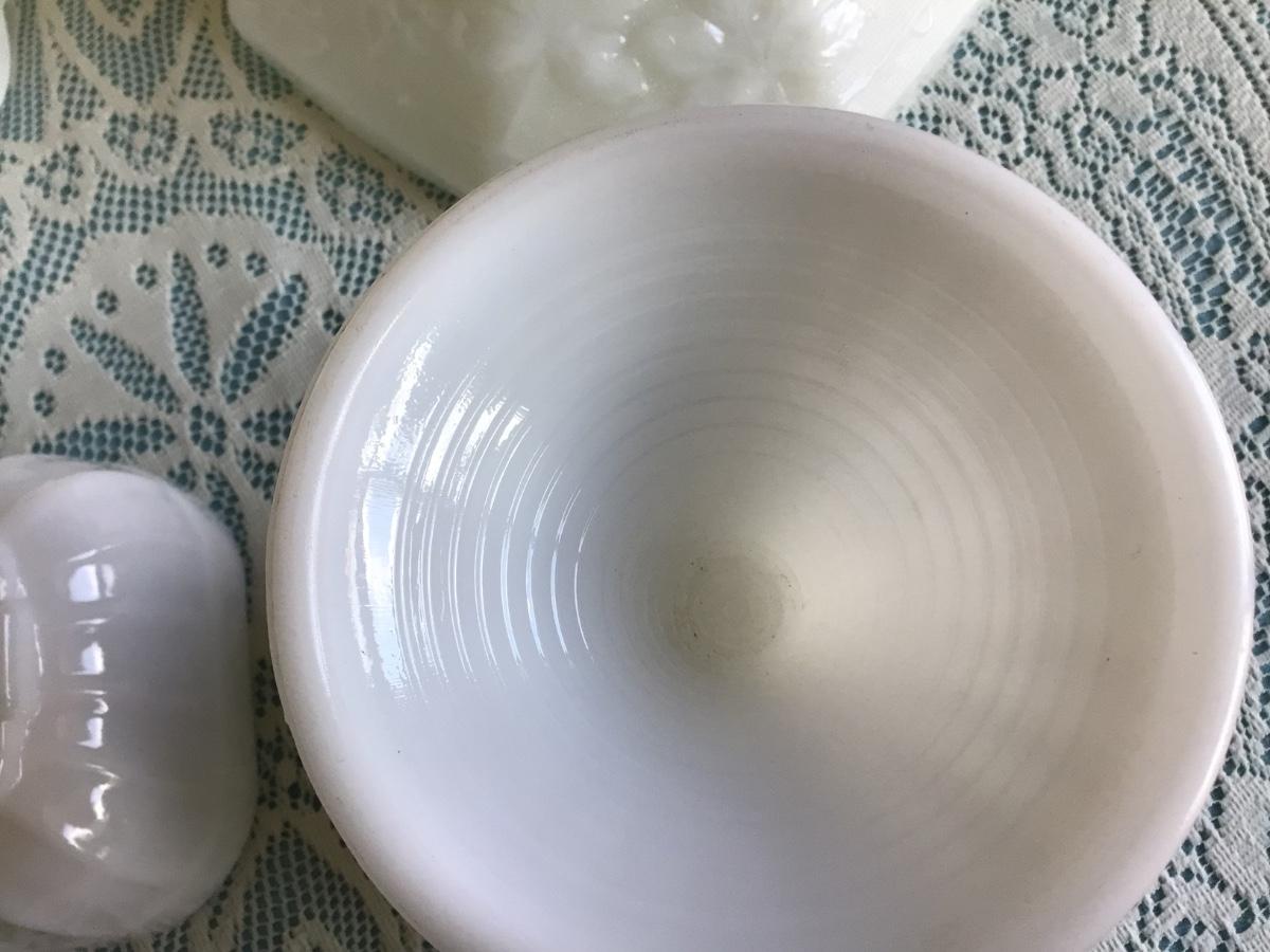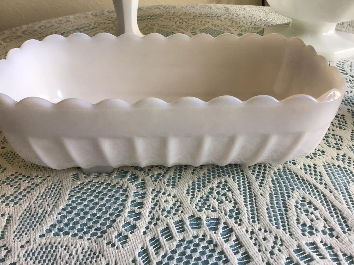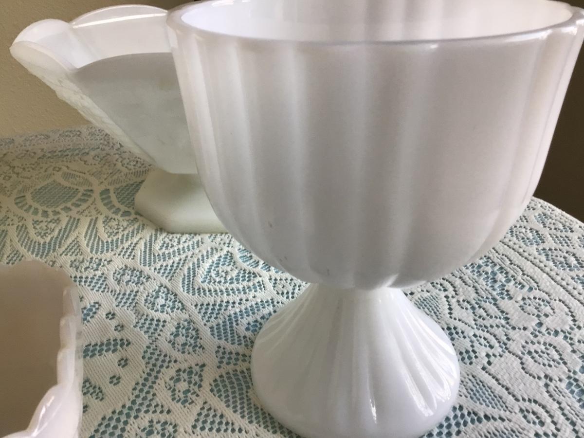 You get nice milk glass large compote, grape and leaf milk glass large footed bowl, medium milk glass compote and a rectangular milk glass bowl.