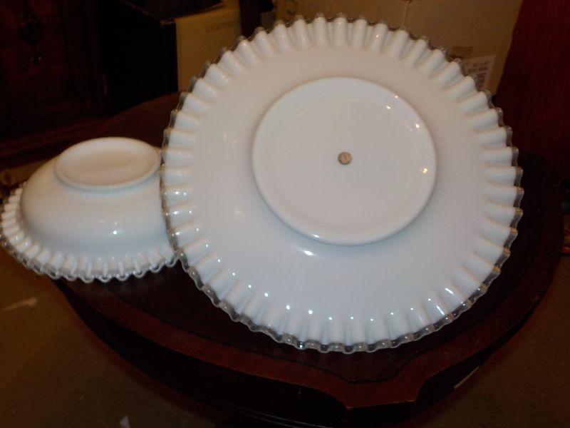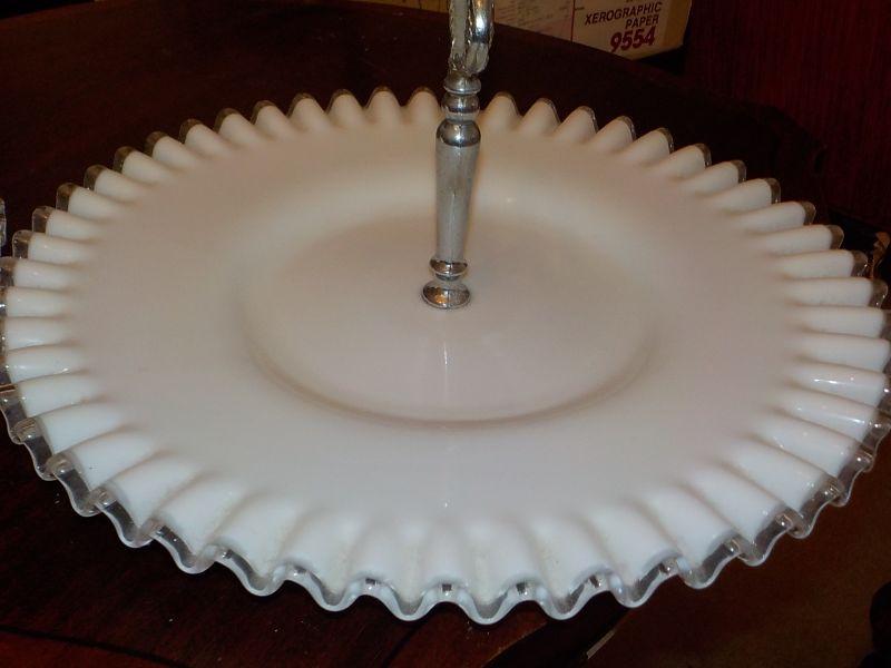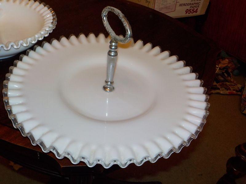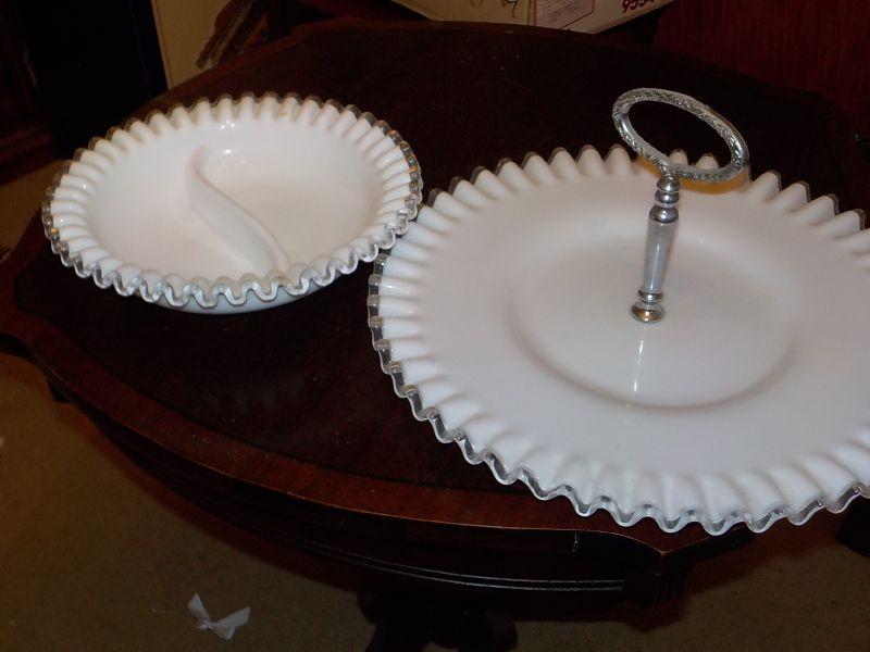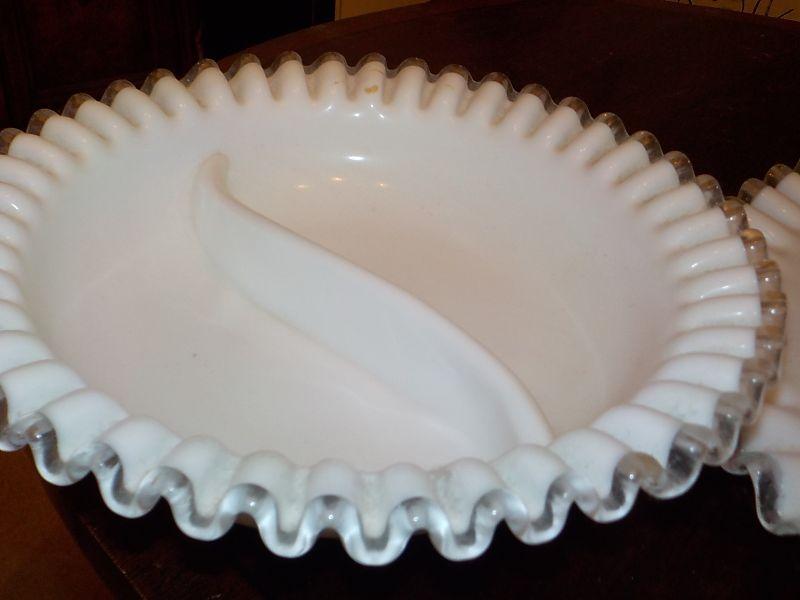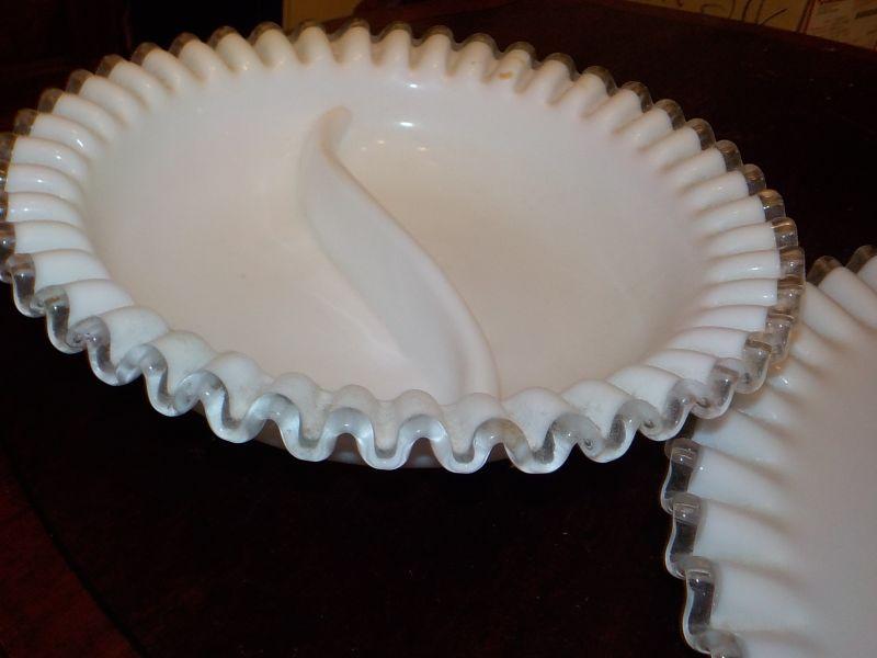 2 serving trays with brilliant white and edged clear glass. 12in. main plate and 8 in. divider plate .