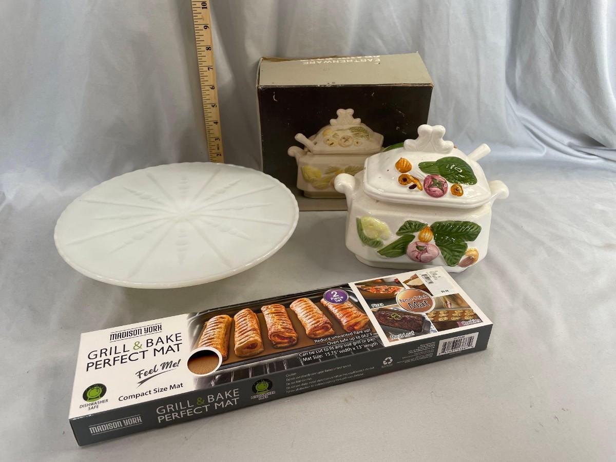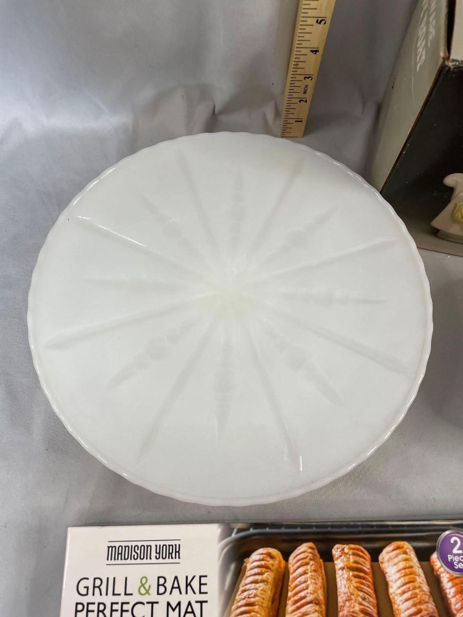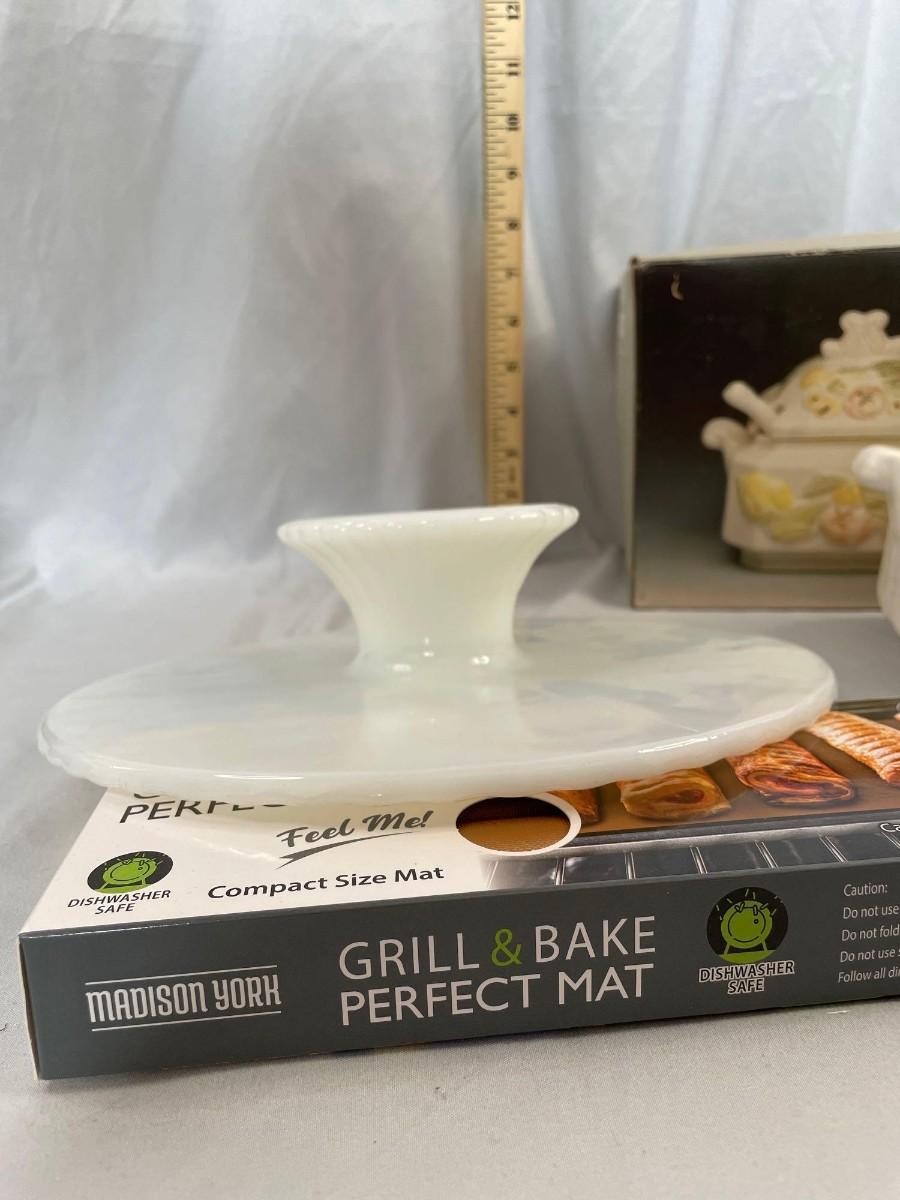 The cake plate is in excellent condition and the grill and bake mat is in an unused condition. <br />