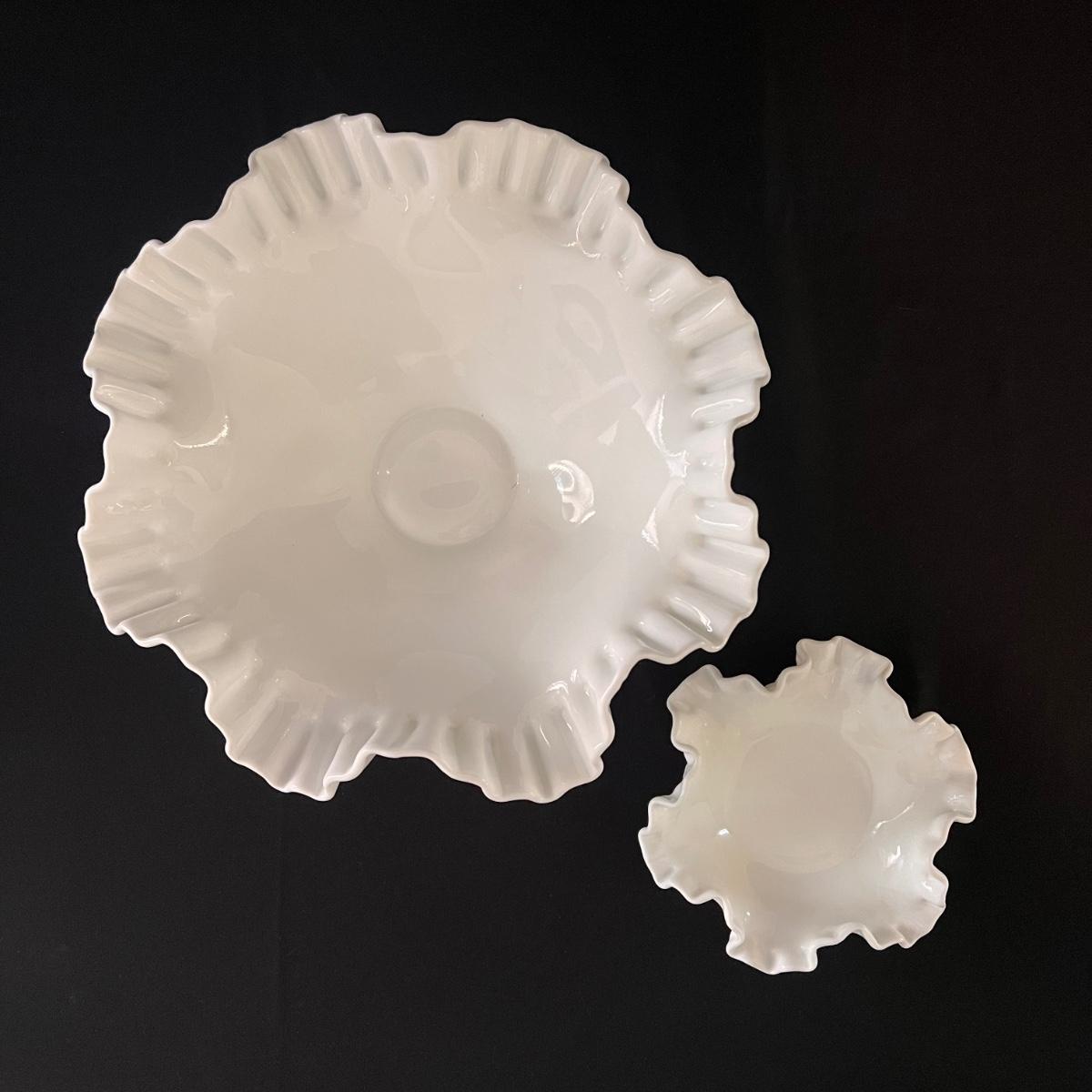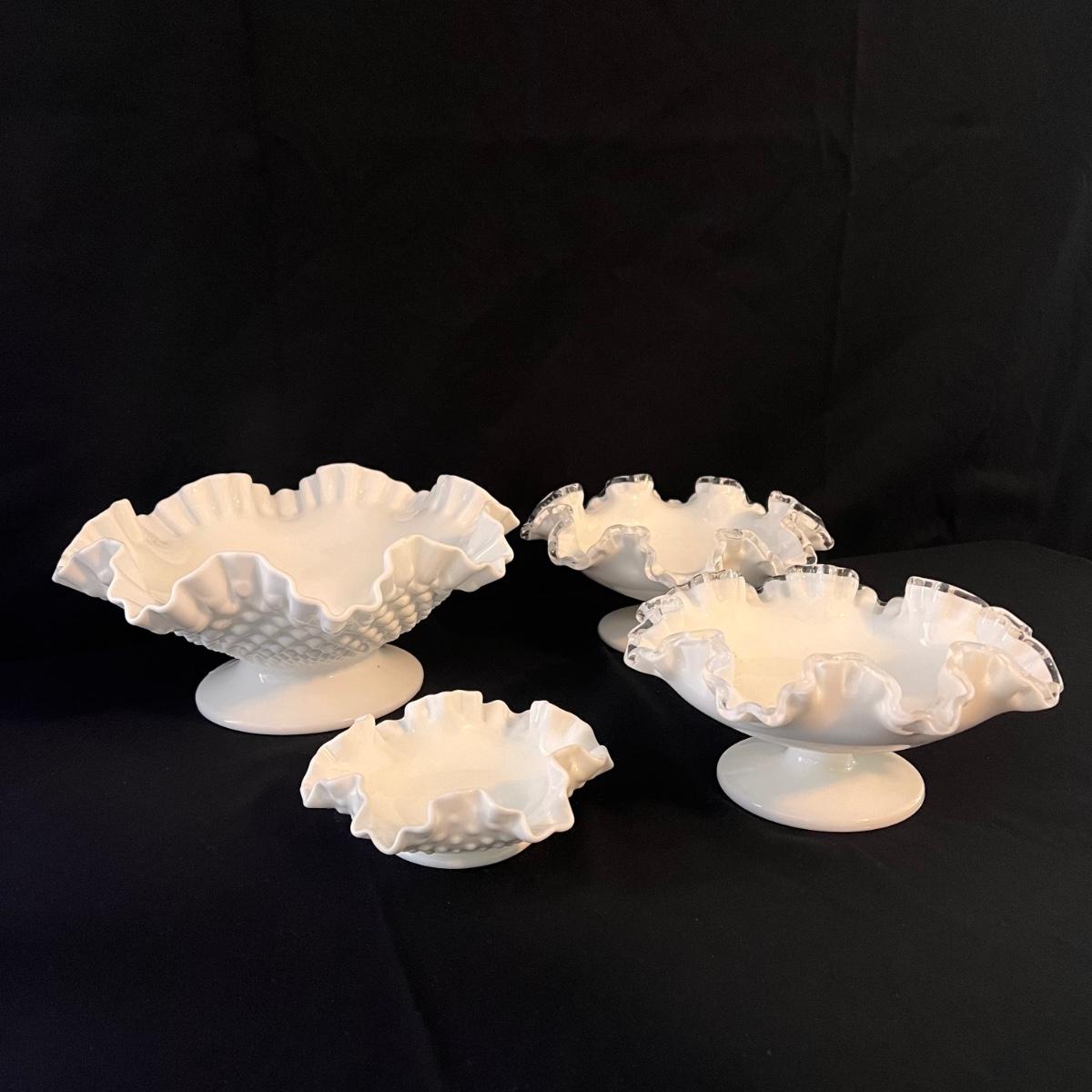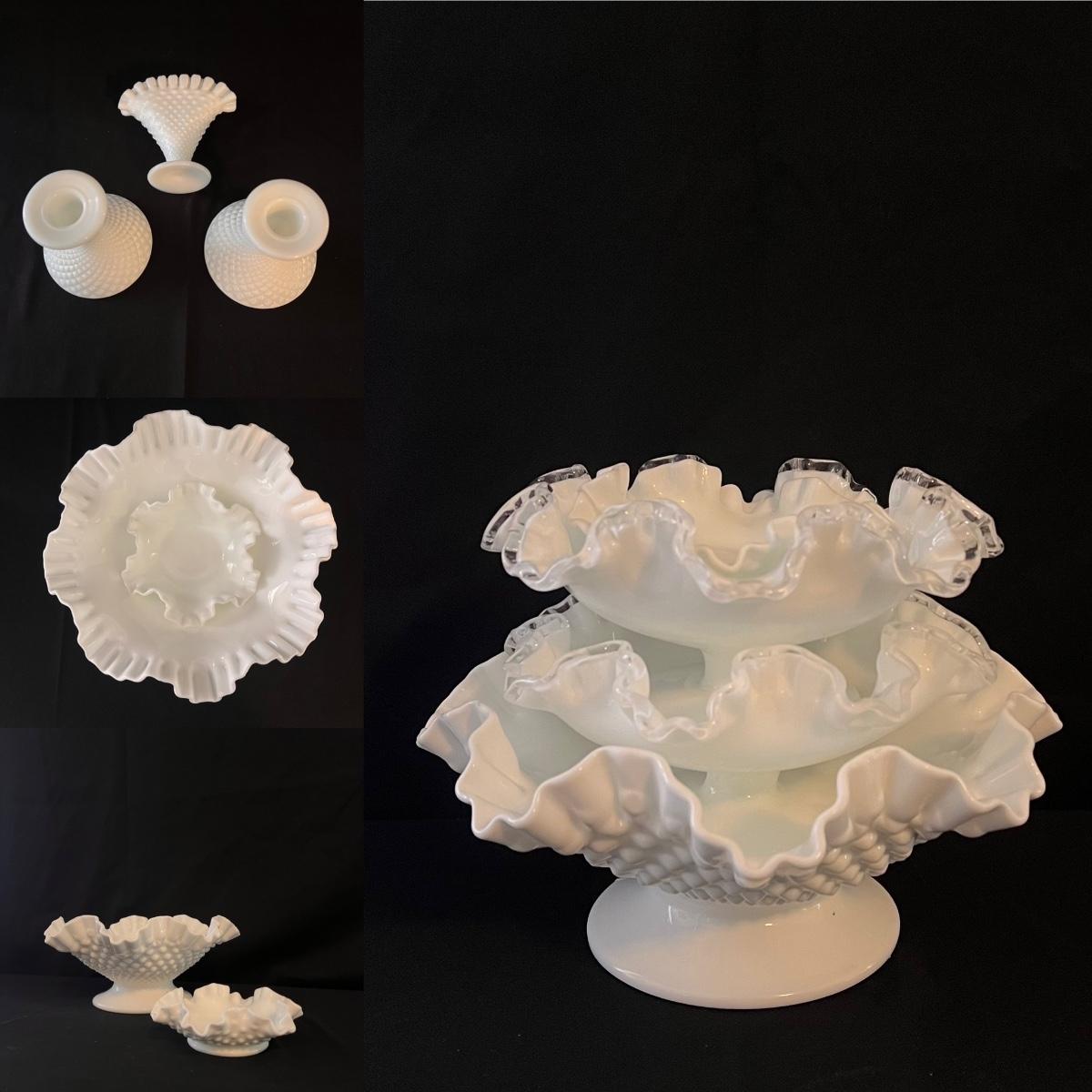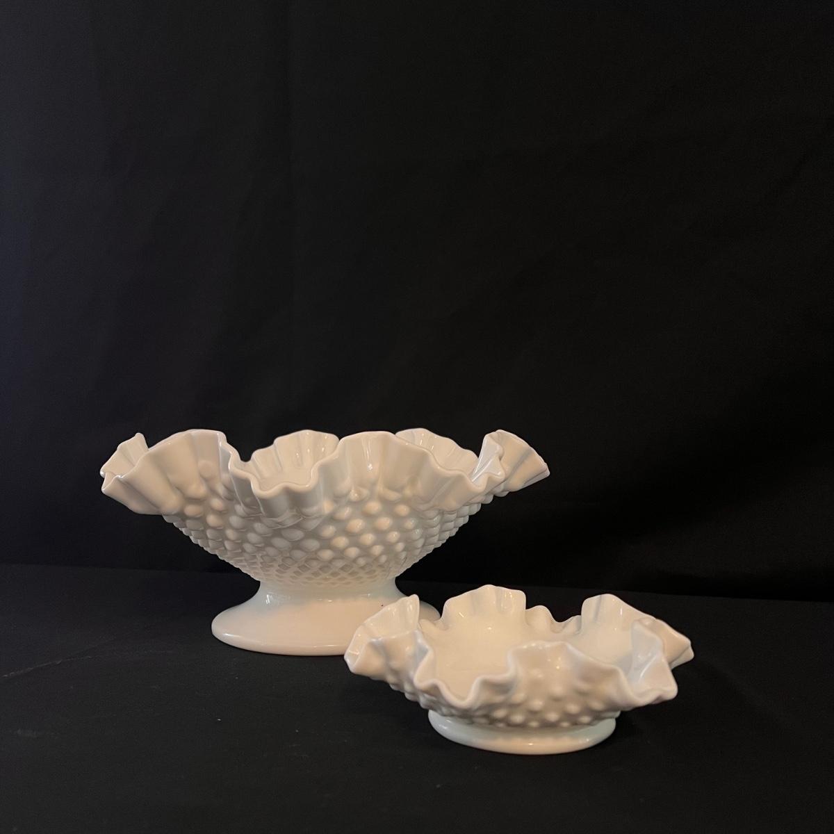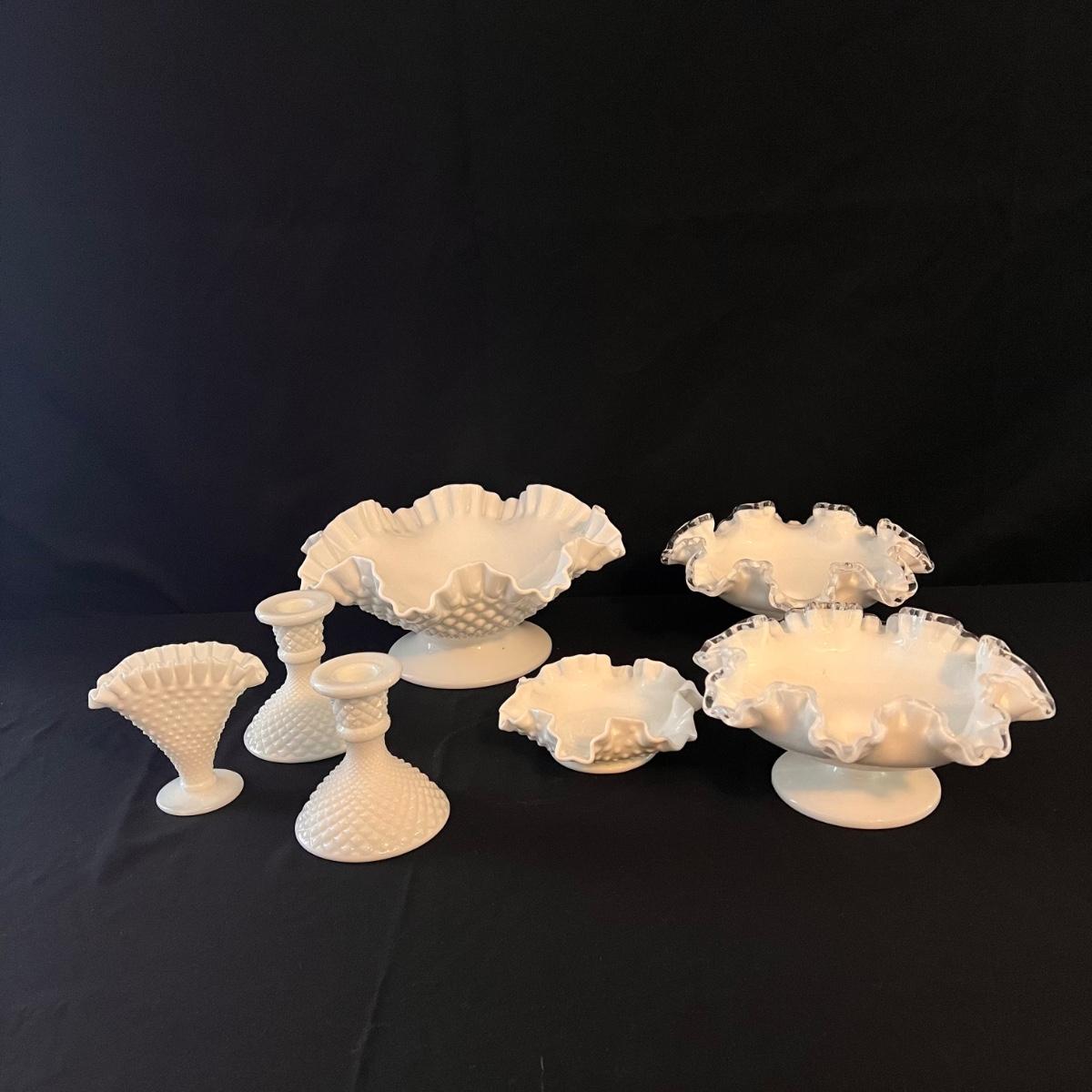 This Milk Glass Collection has two candle holders, one small vase, and four bowls that vary in size. The largest item is the ruffled bowl measuring at 9.5” x 4”H. Shipping available.