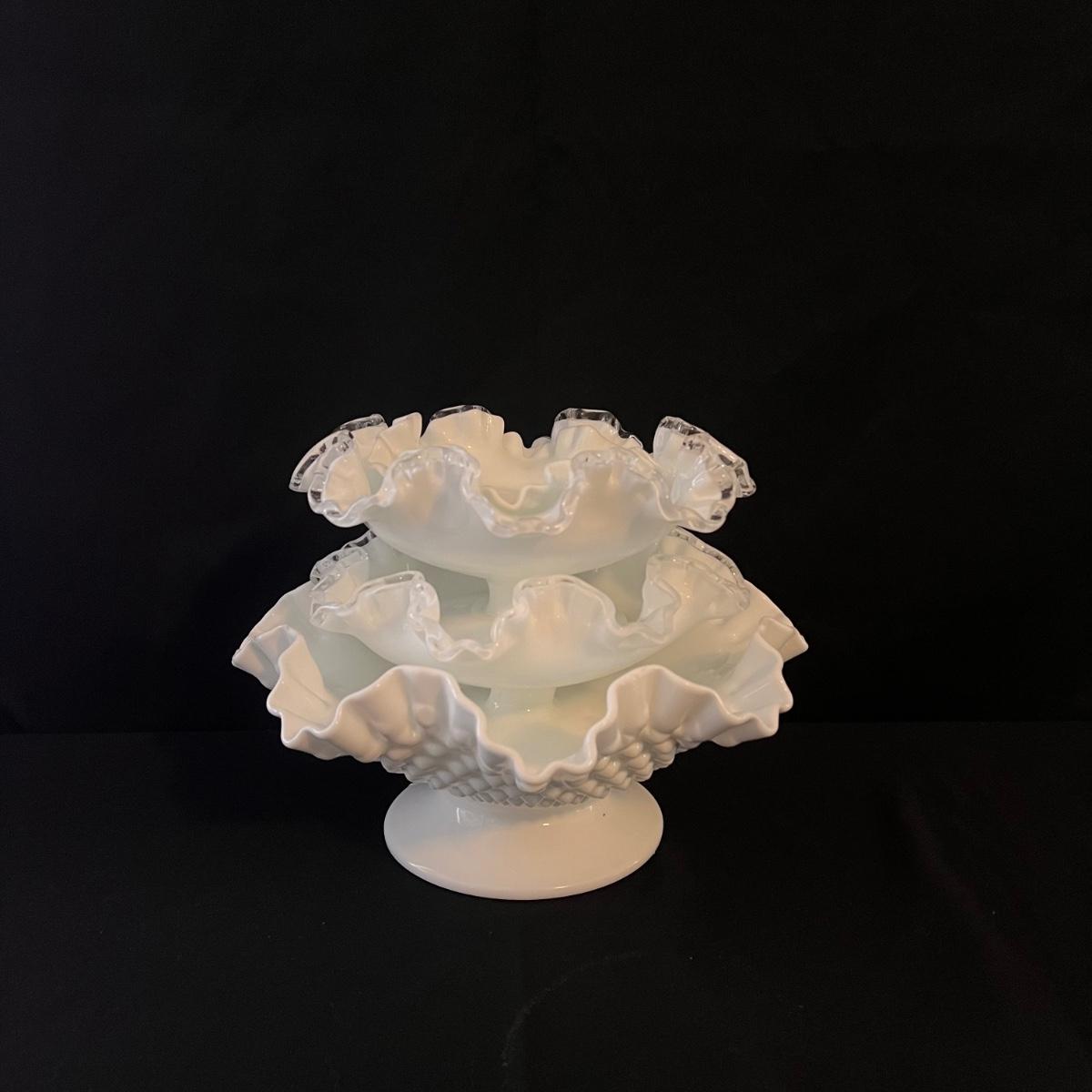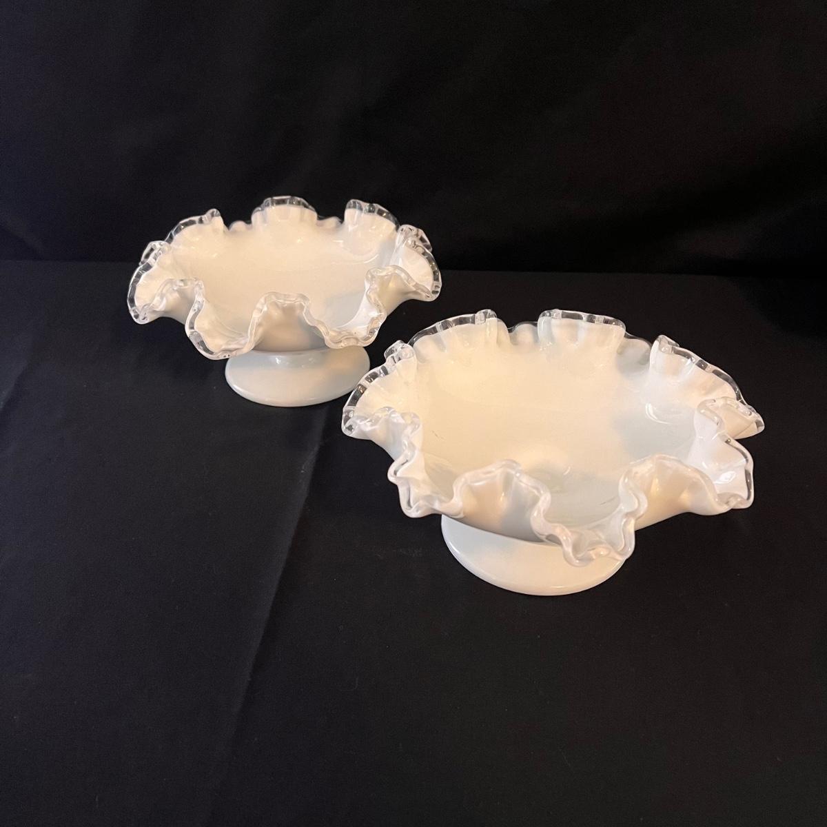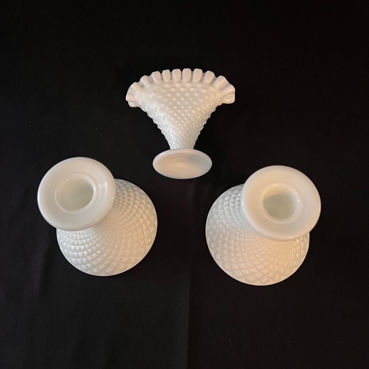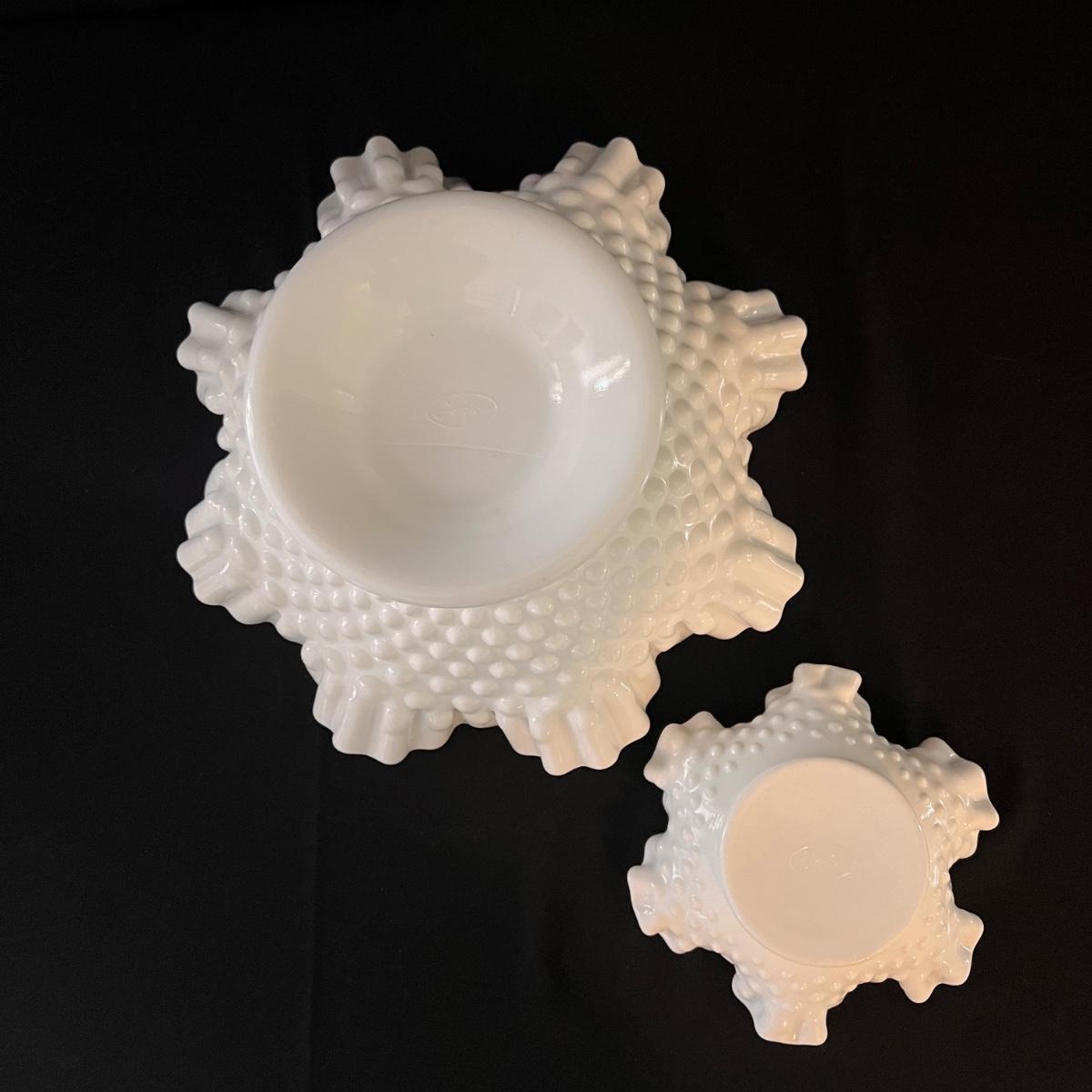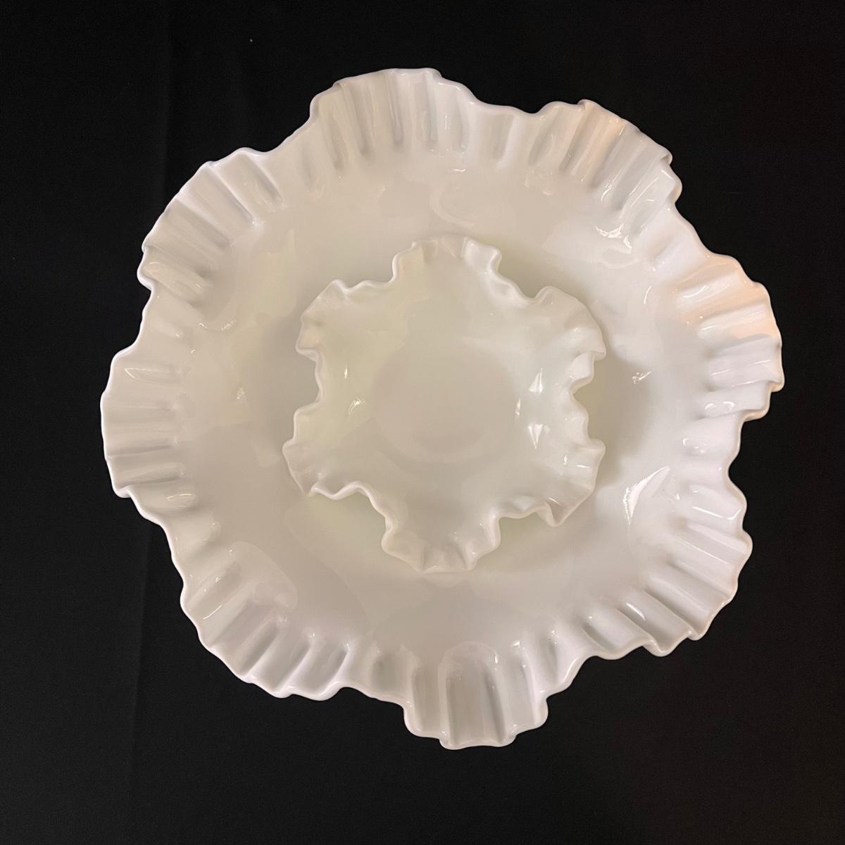 This Milk Glass Collection has two candle holders, one small vase, and four bowls that vary in size. The largest item is the ruffled bowl measuring at 9.5” x 4”H. Shipping available.