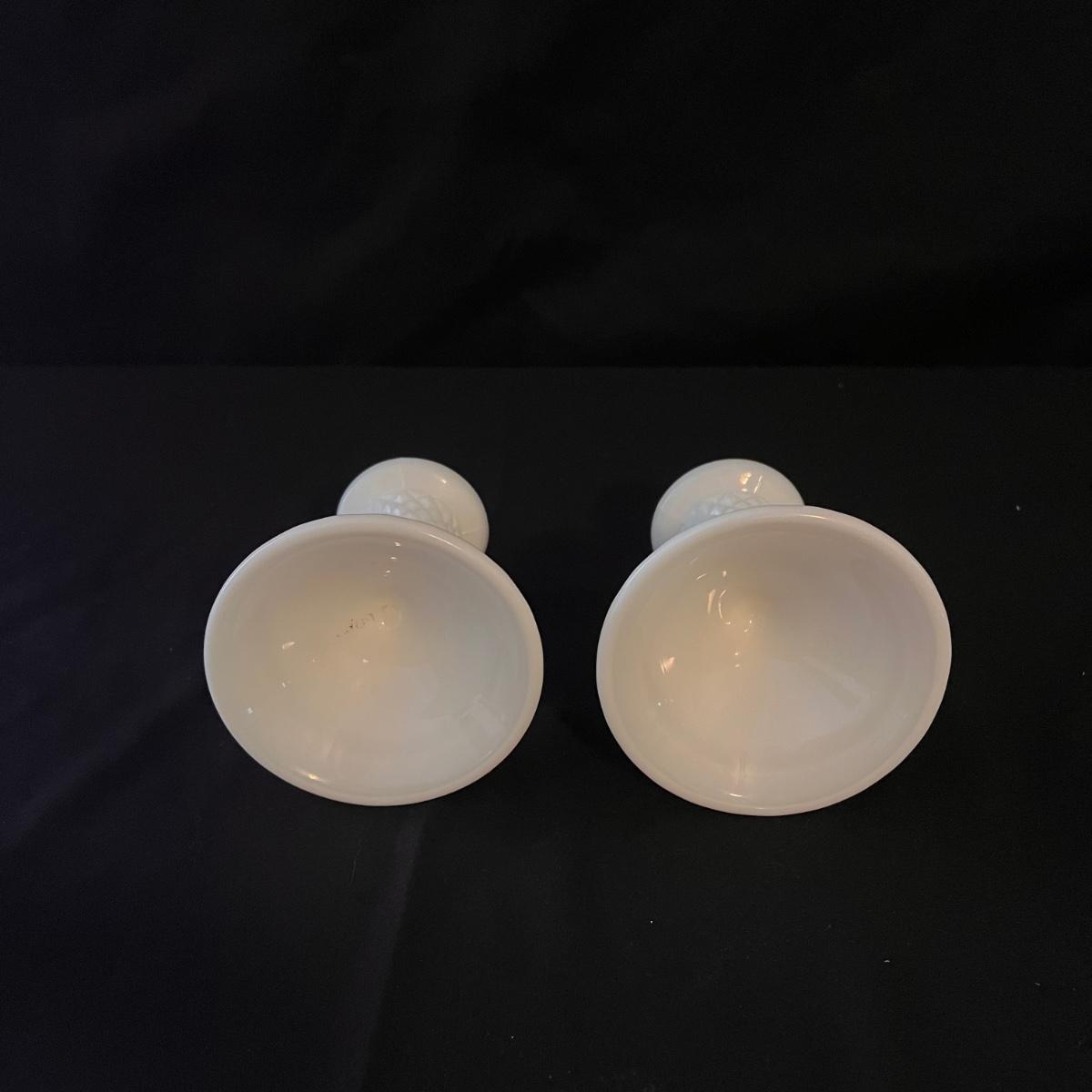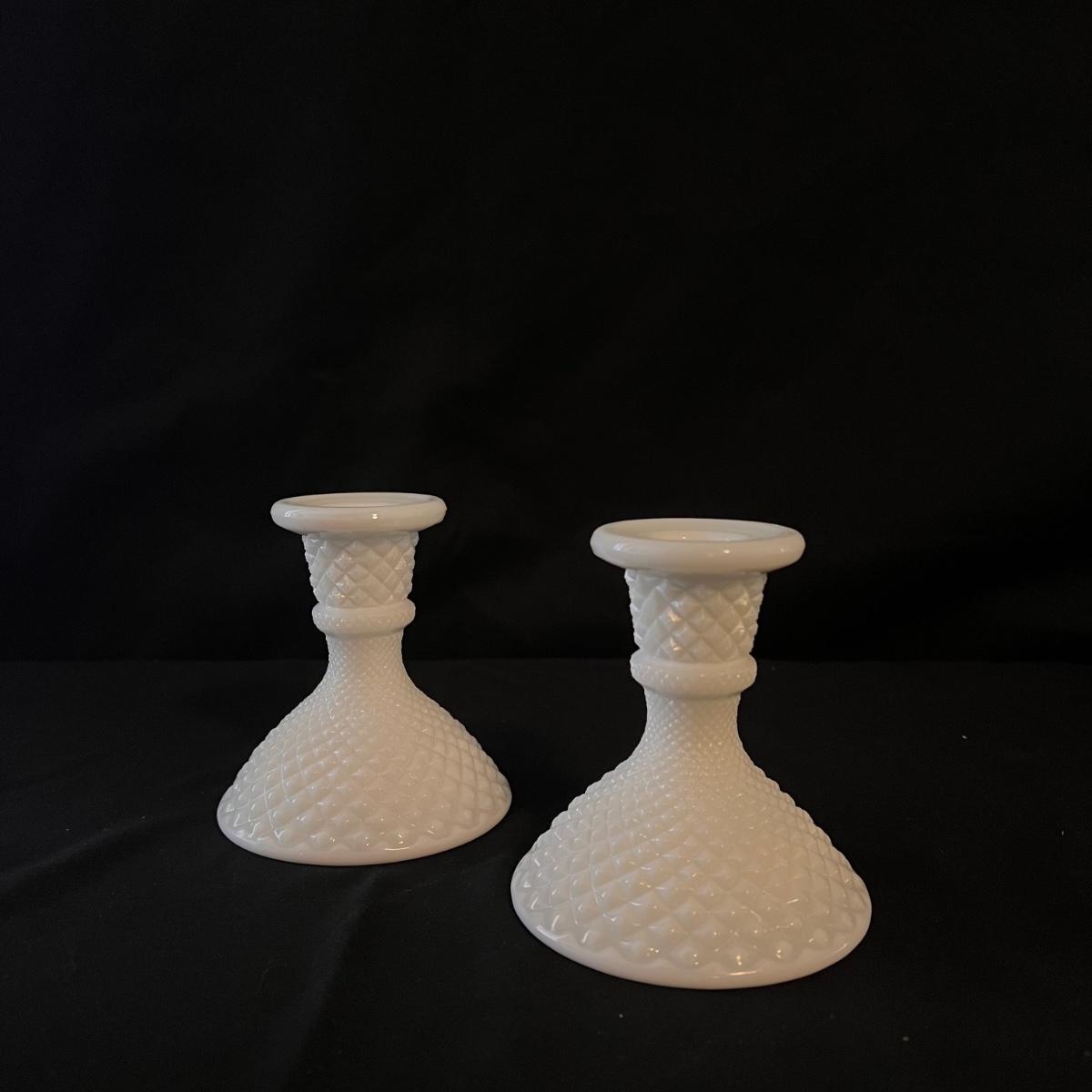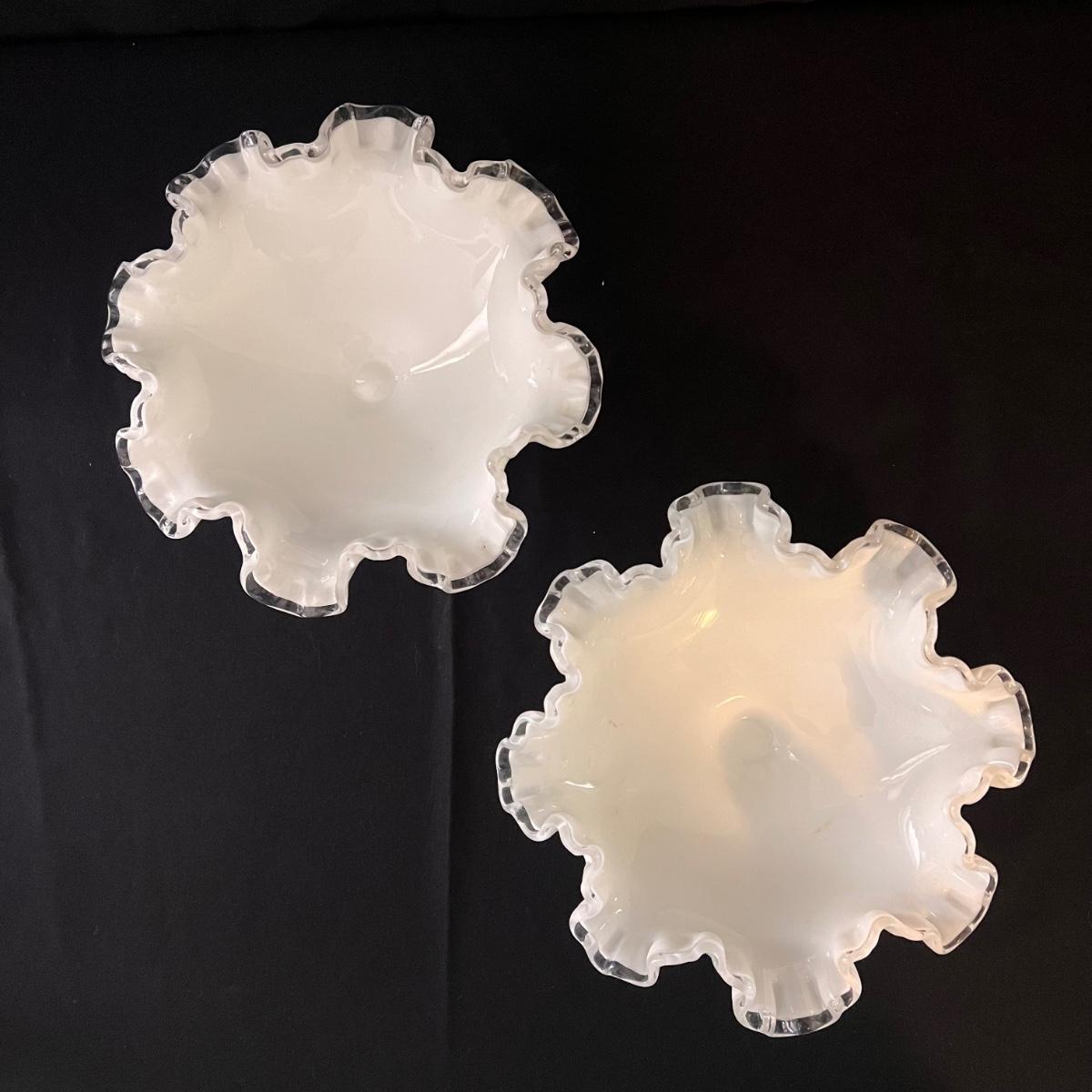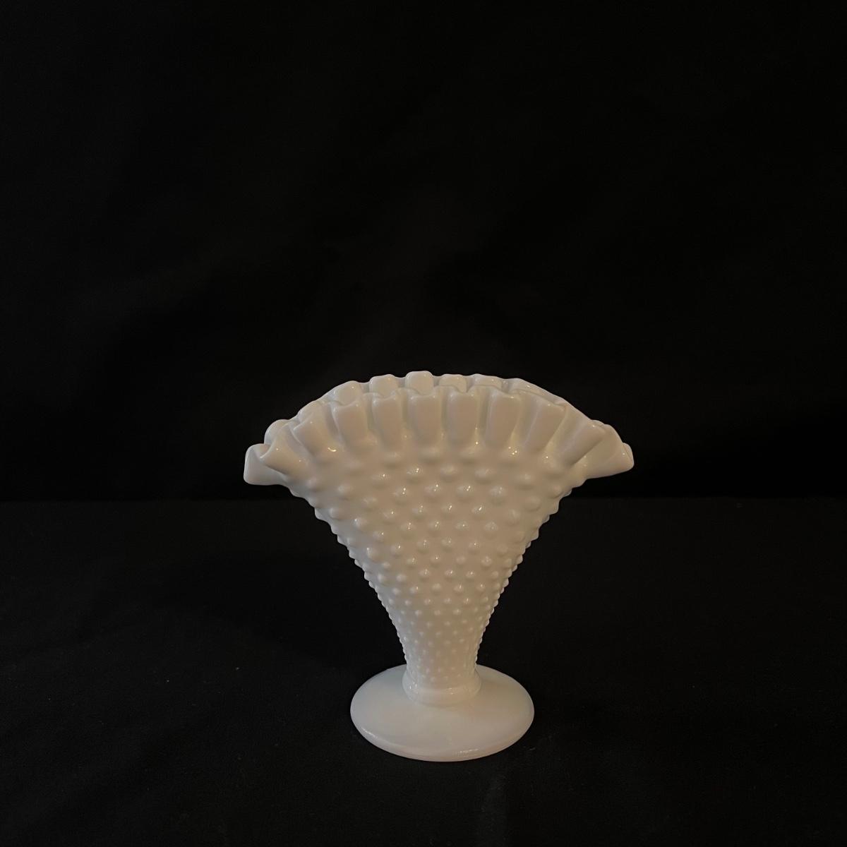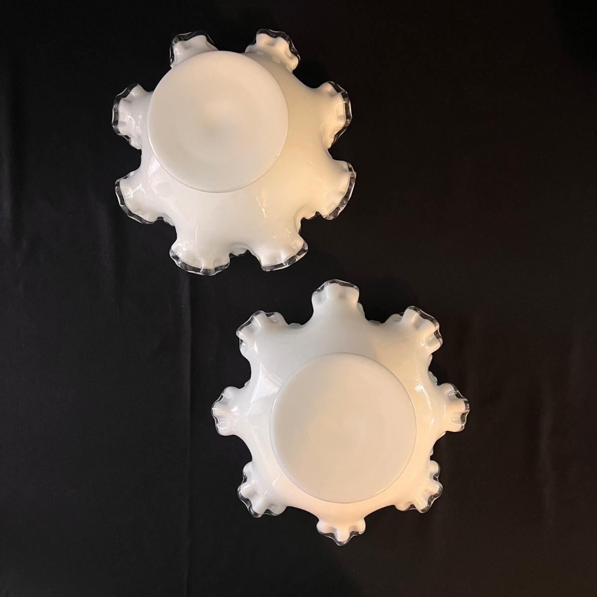 This Milk Glass Collection has two candle holders, one small vase, and four bowls that vary in size. The largest item is the ruffled bowl measuring at 9.5” x 4”H. Shipping available.