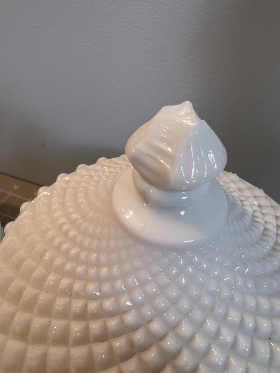 Minor Chip on candy lid. Sad! But this is still a huge lot of very good milk Glass! Please Bring Paper and Boxes.