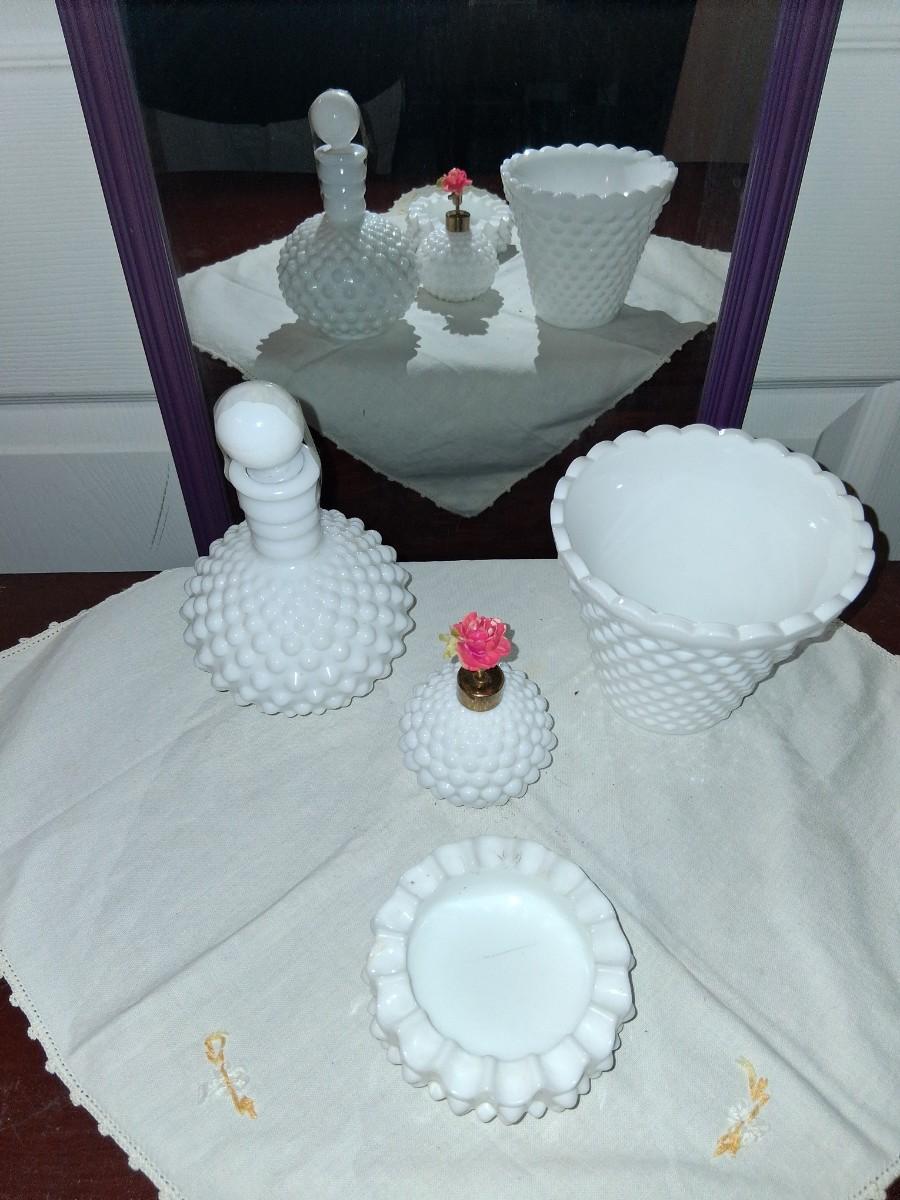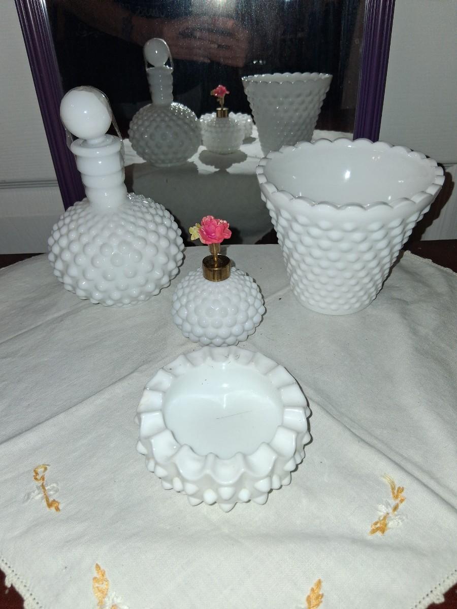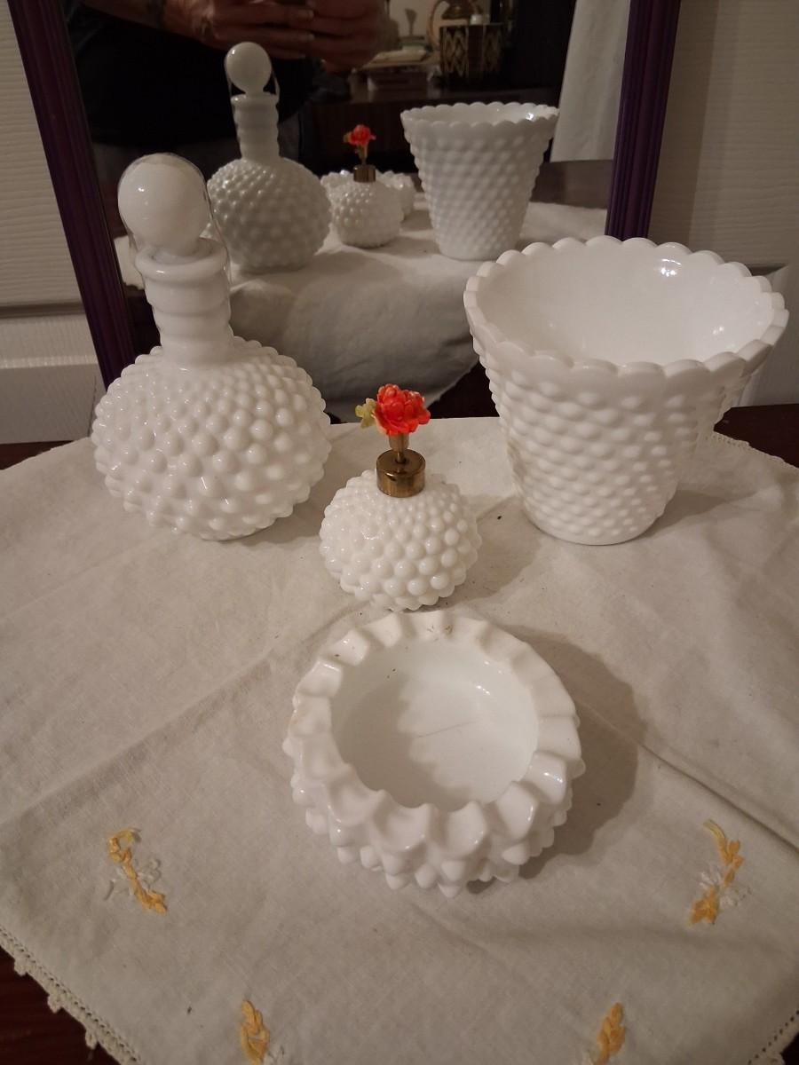 The small vase & ashtray are unmarked Fenton, the parfume bottle with the rose is the Rice company & the Larger bottle with the ball top only contains a number on bottom. Could also be Fenton.
