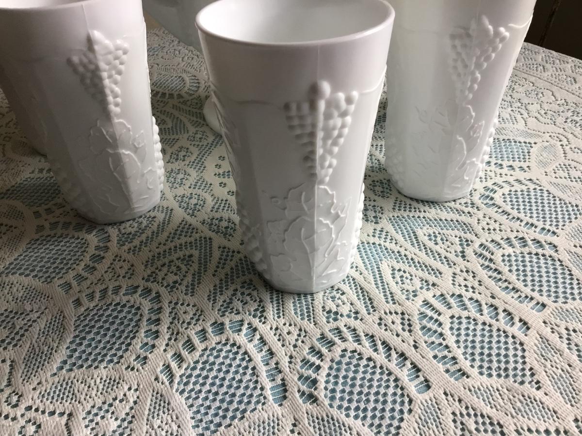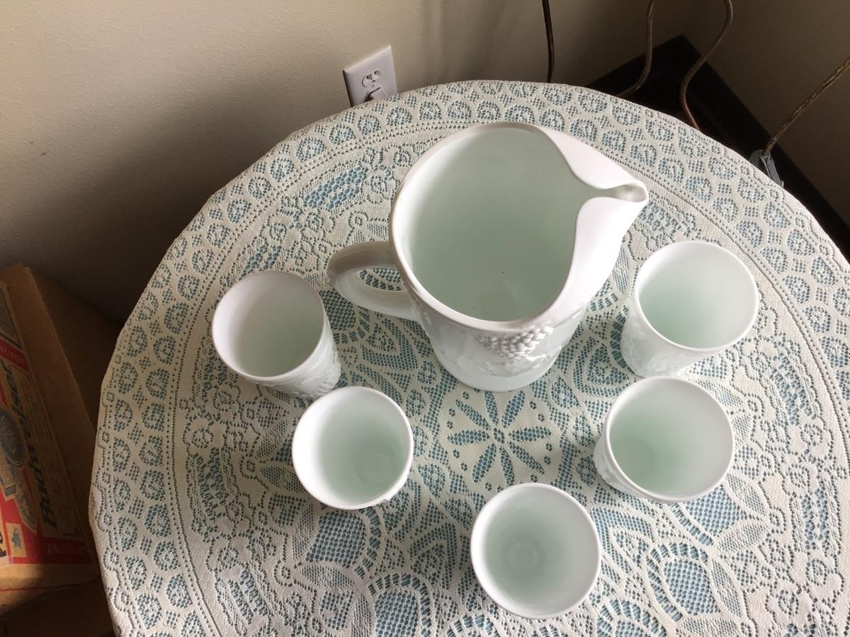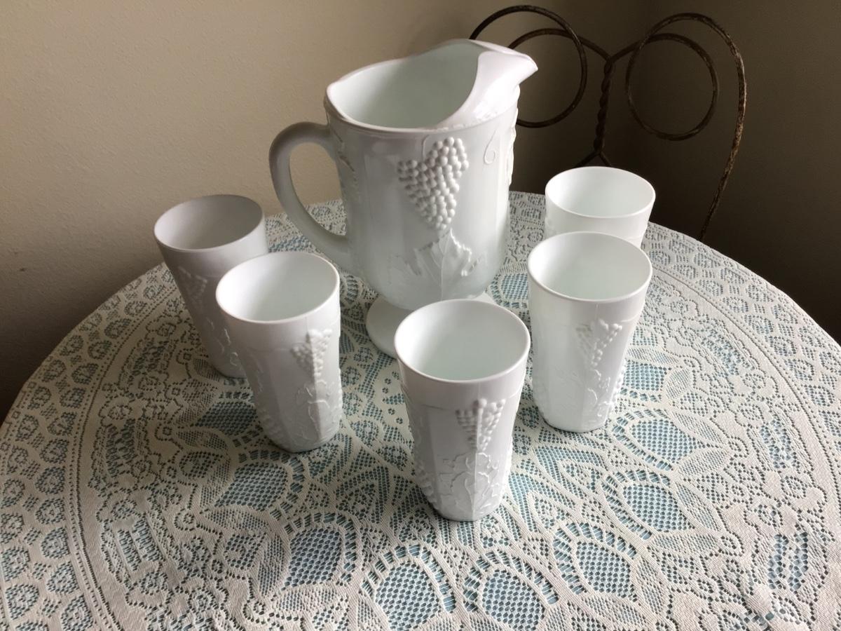 This is a great milk glass with grapes and leaf patter. You get the pitcher and 5 glasses all in great condition.