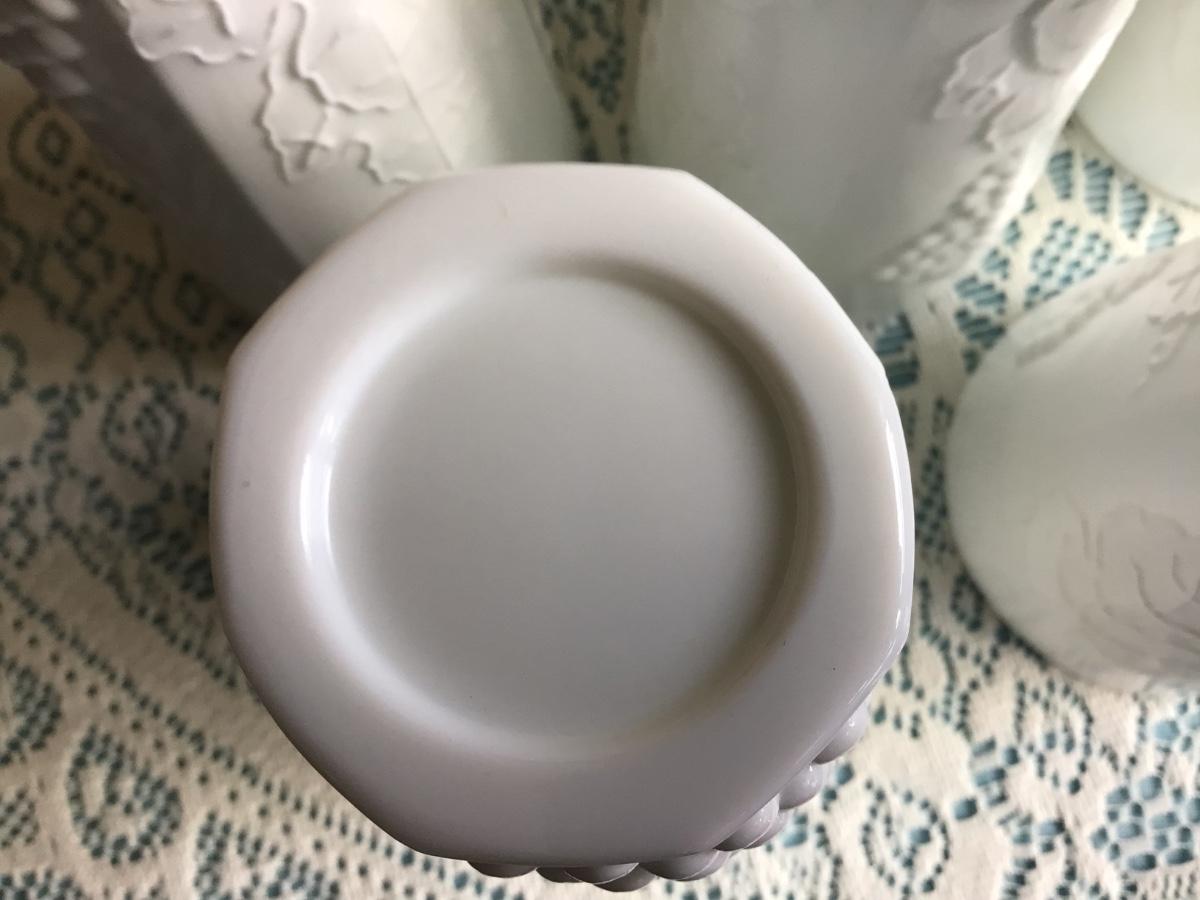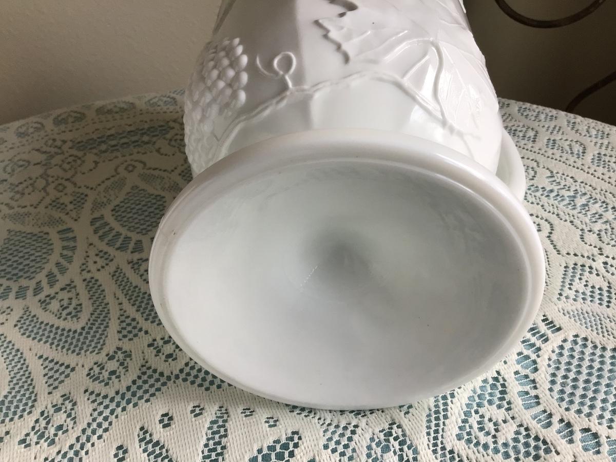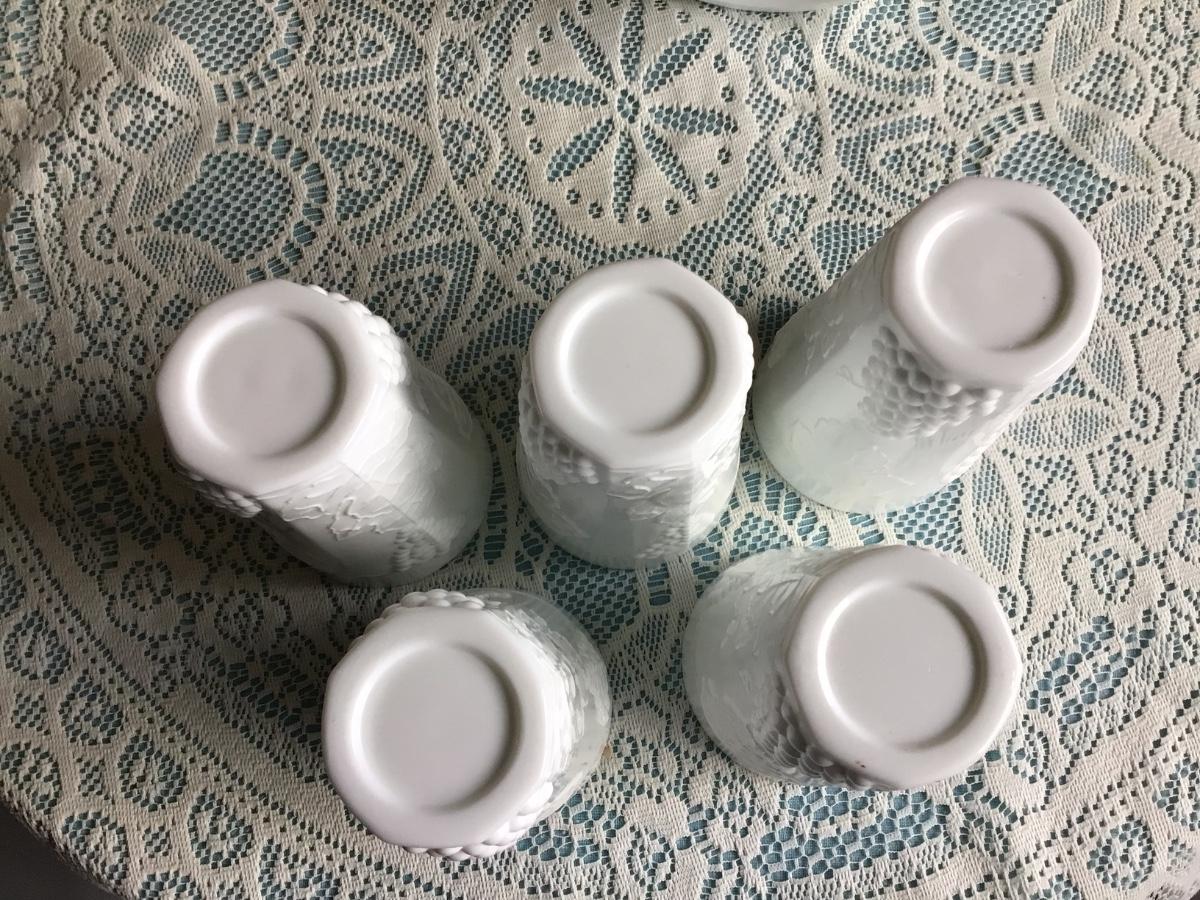 This is a great milk glass with grapes and leaf patter. You get the pitcher and 5 glasses all in great condition.