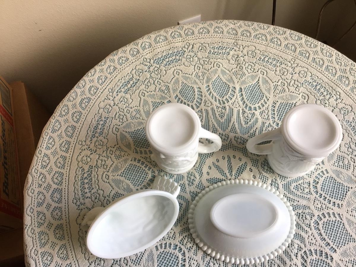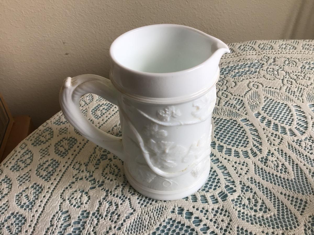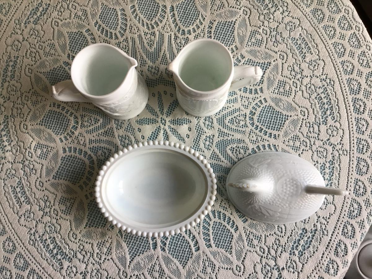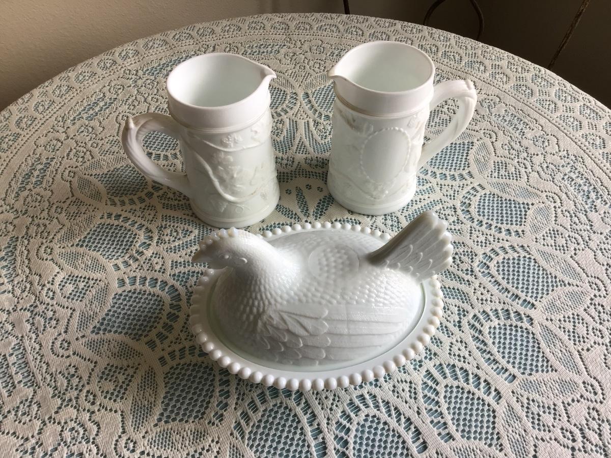 This is a great lot of milk glass. You get a milk glass hen on a nest, and two milk glass small grape and leaf pattern pitchers. Very unique.