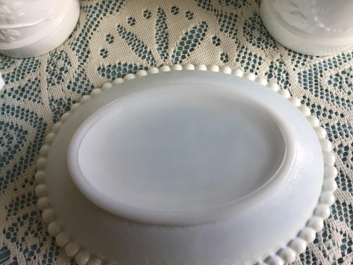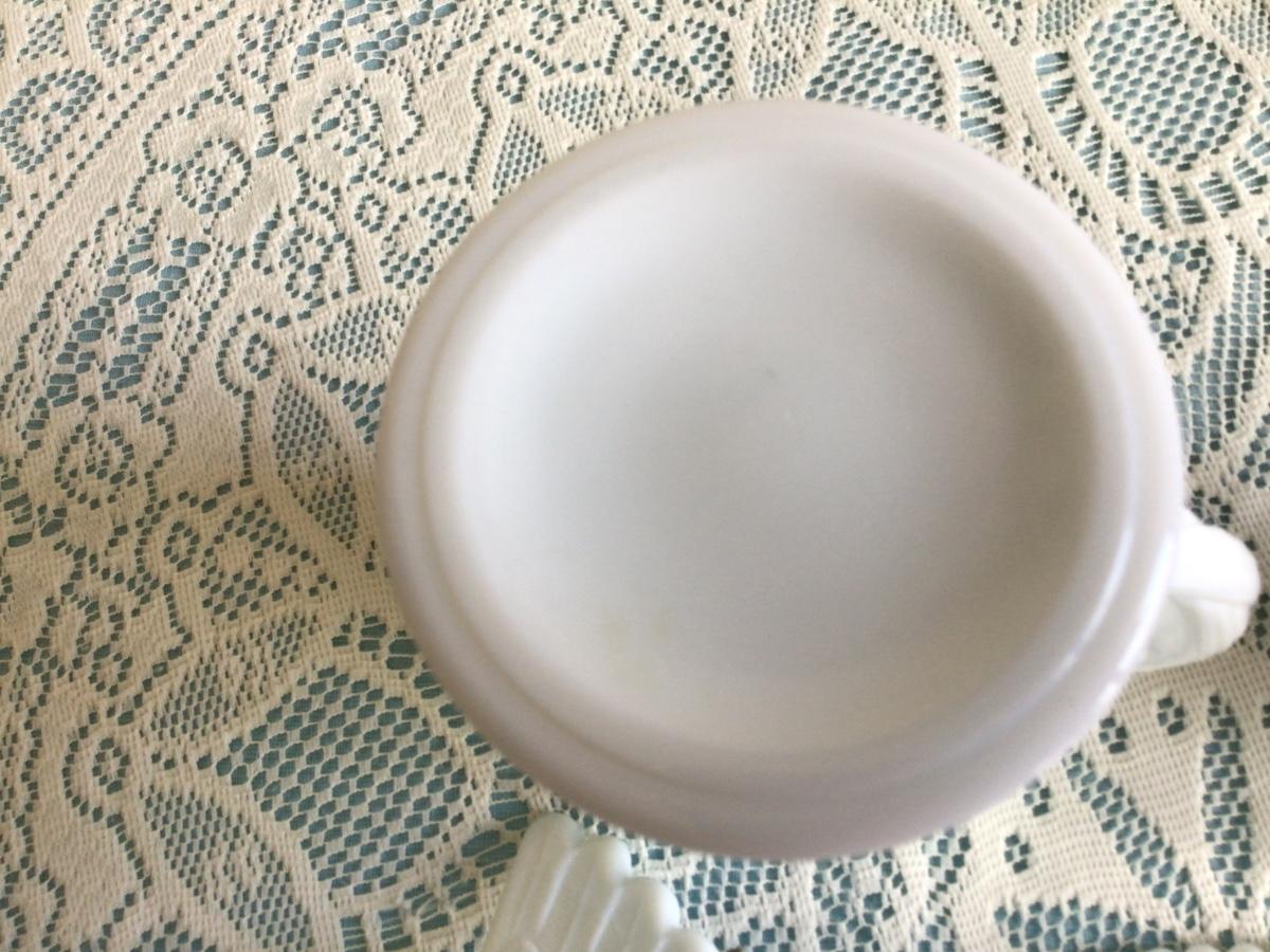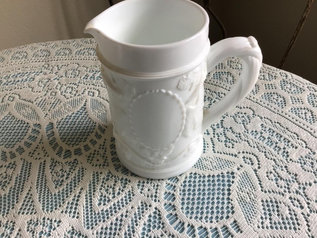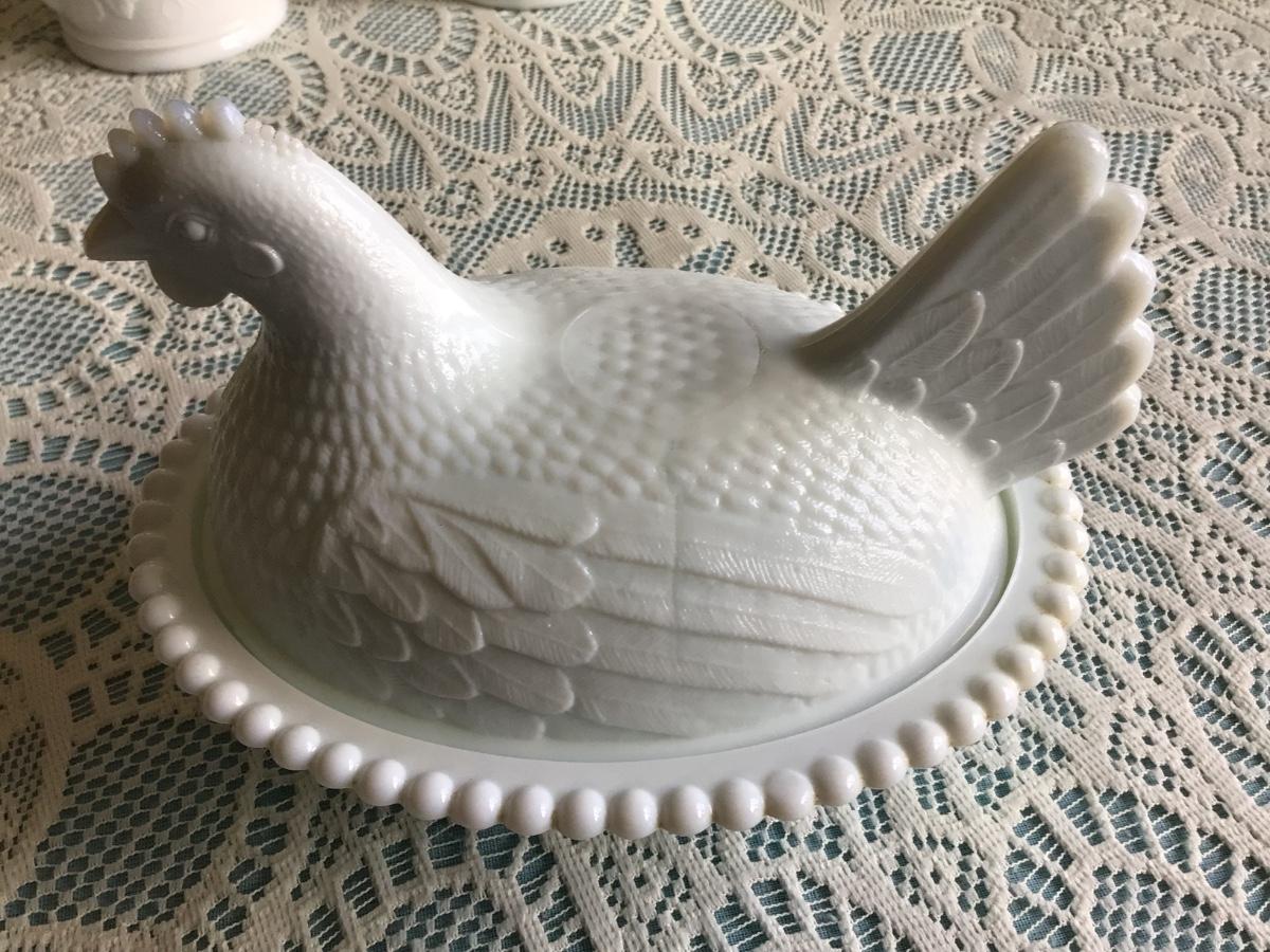 This is a great lot of milk glass. You get a milk glass hen on a nest, and two milk glass small grape and leaf pattern pitchers. Very unique.