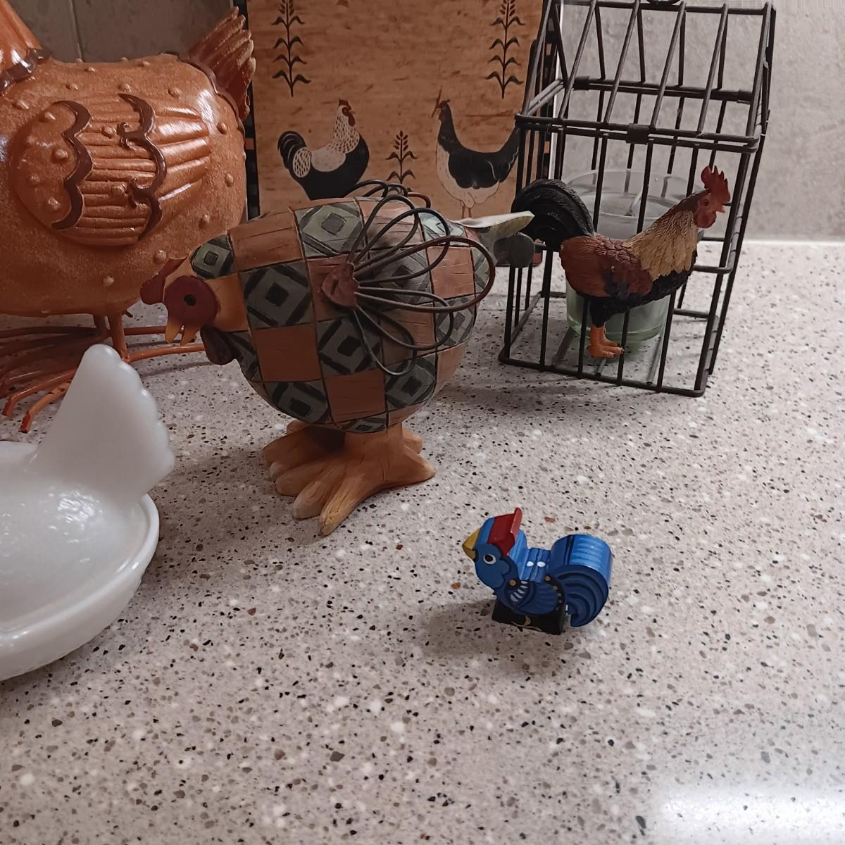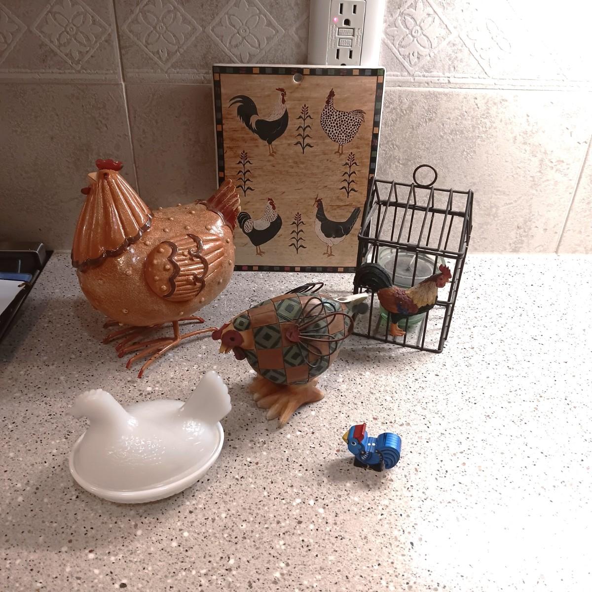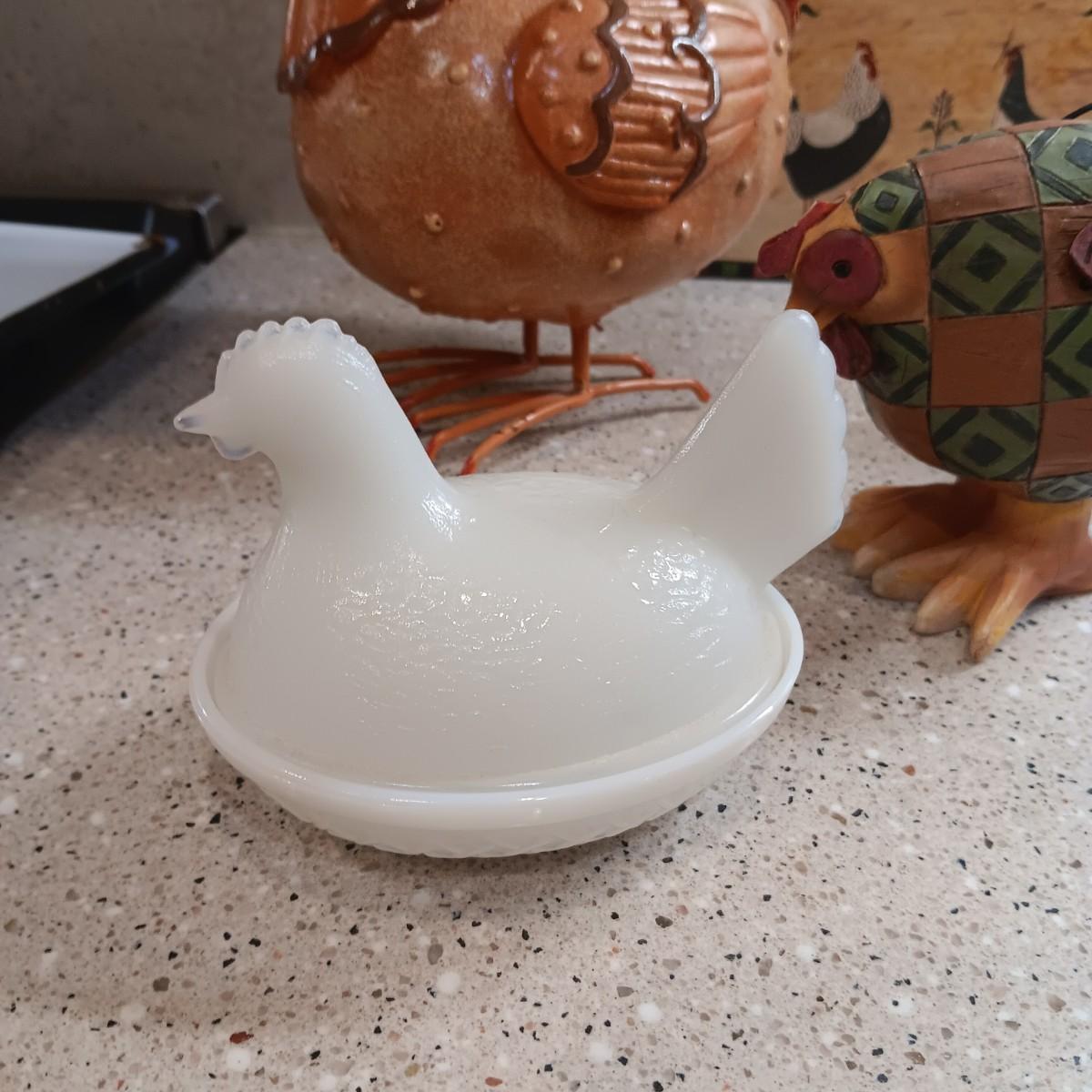 MILK GLASS HEN ON NEST, CERAMIC HOT PLATE AND OTHER ROOSTERS
