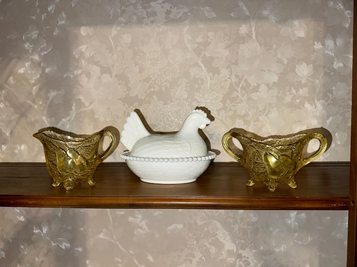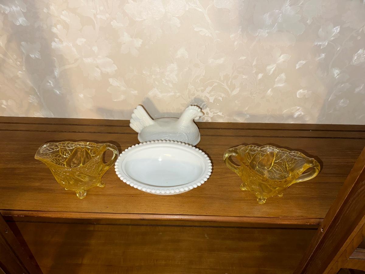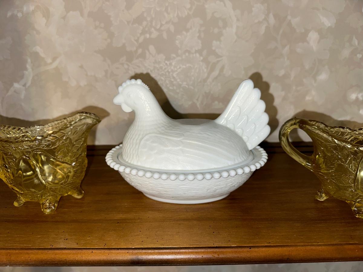 MILK GLASS HEN ON NEST AND GLASS SUGAR CREAM SET