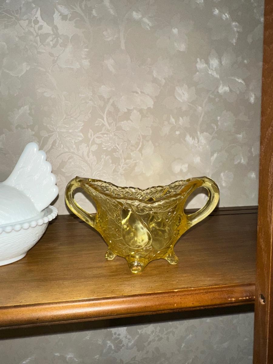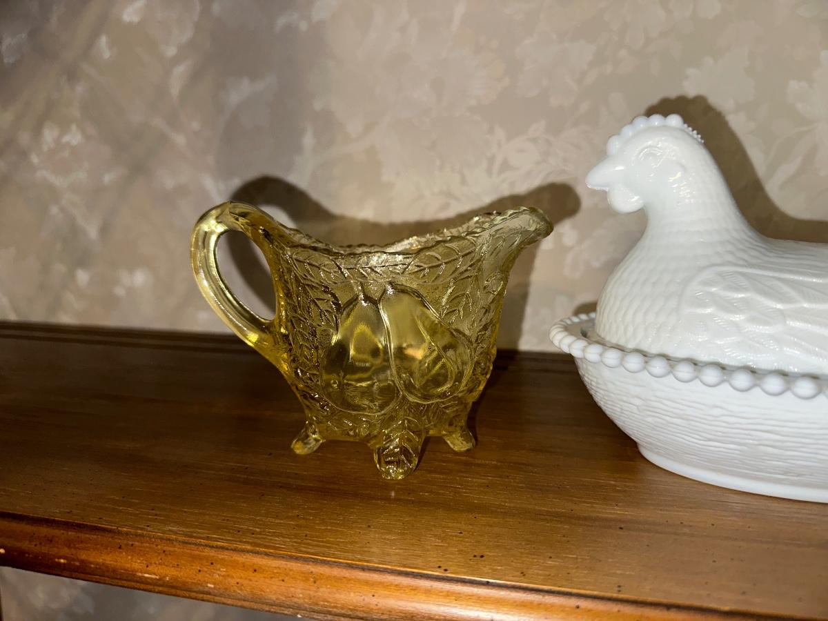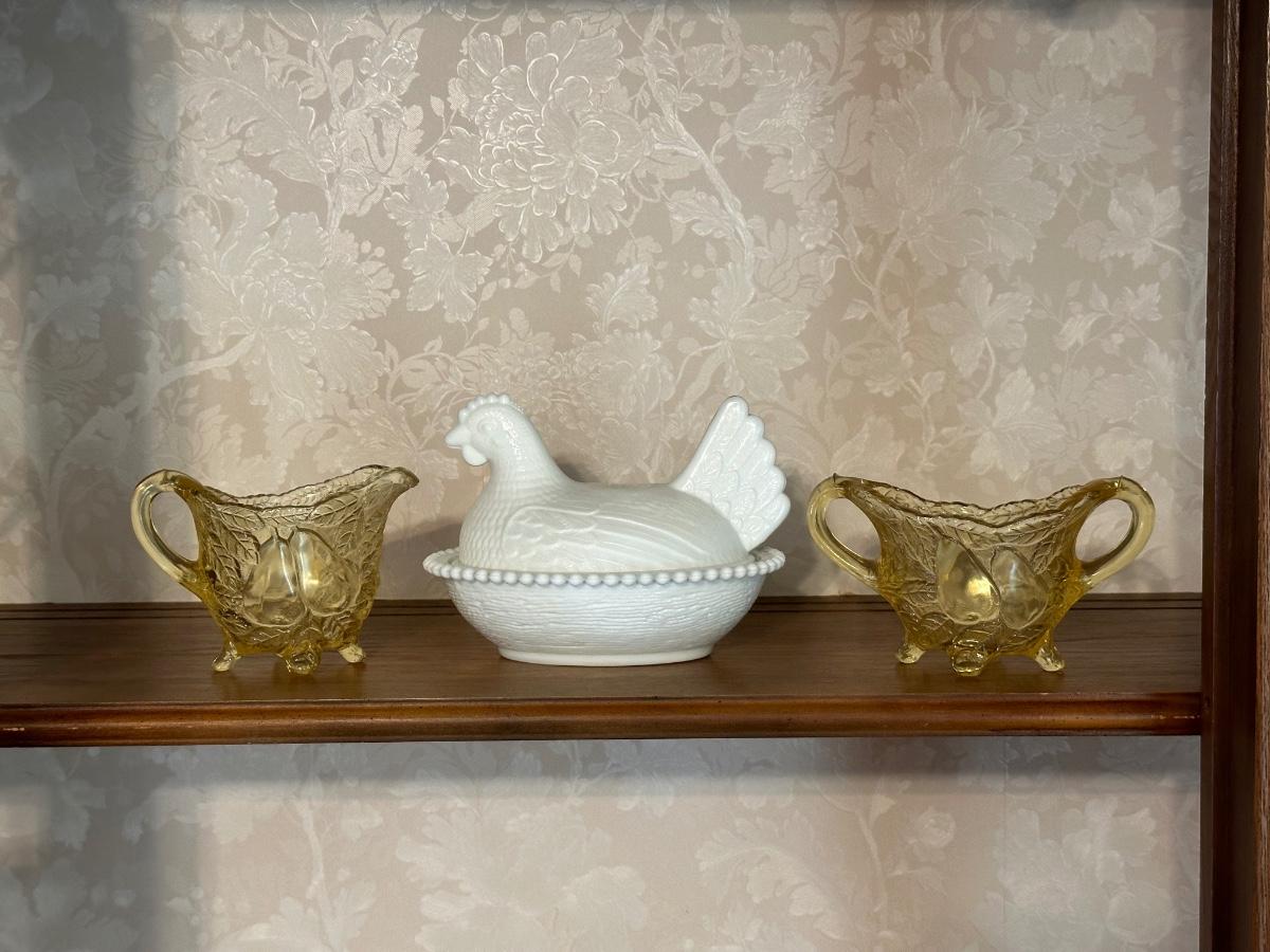 MILK GLASS HEN ON NEST AND GLASS SUGAR CREAM SET