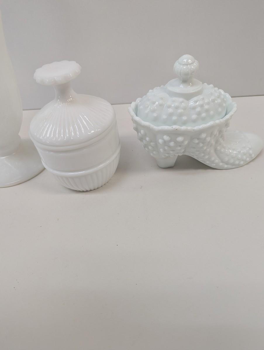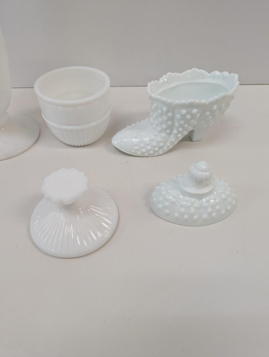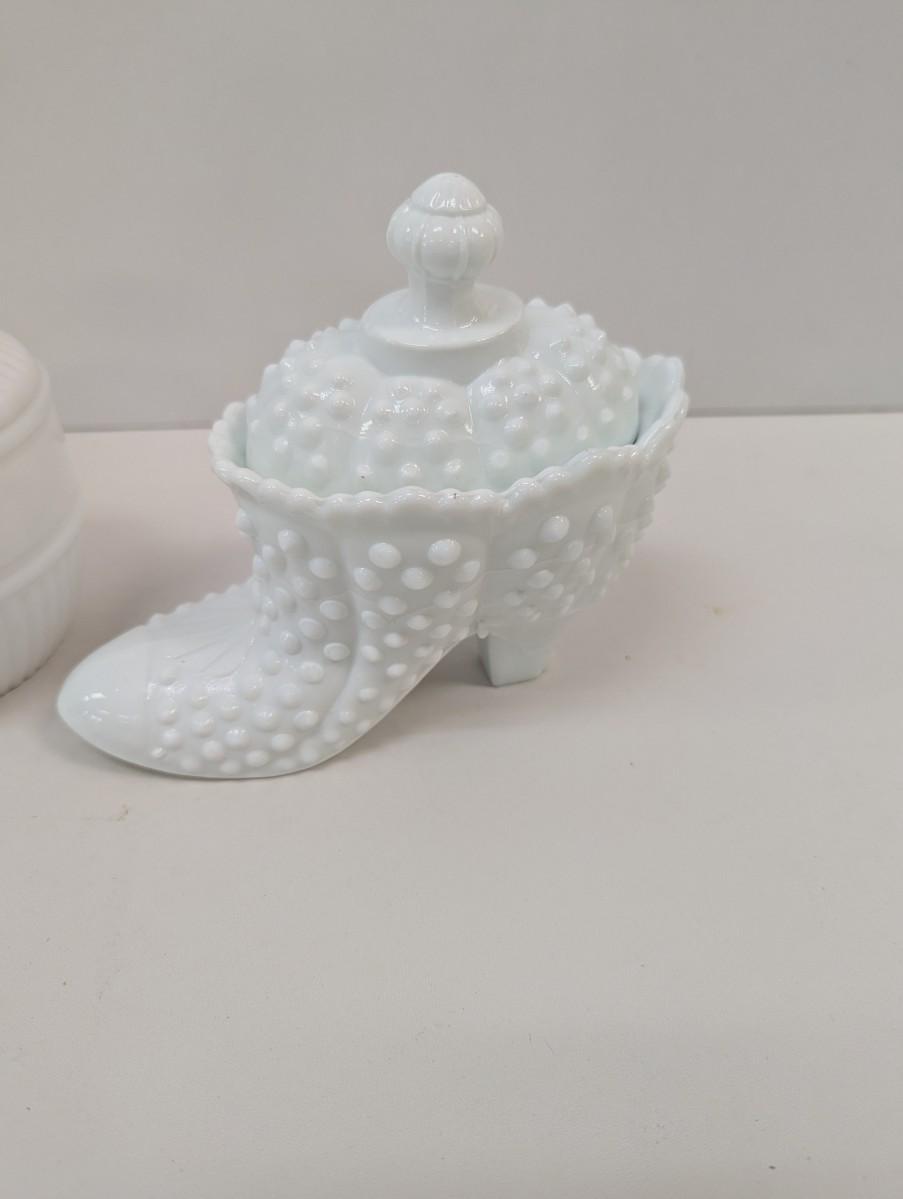 Milk Glass Hobnail Boot Candy Dish & Vase