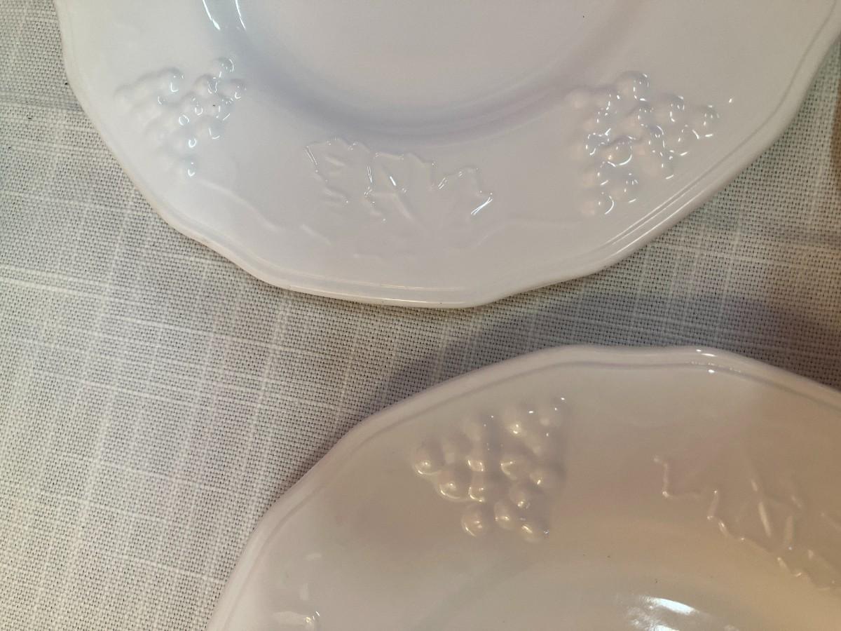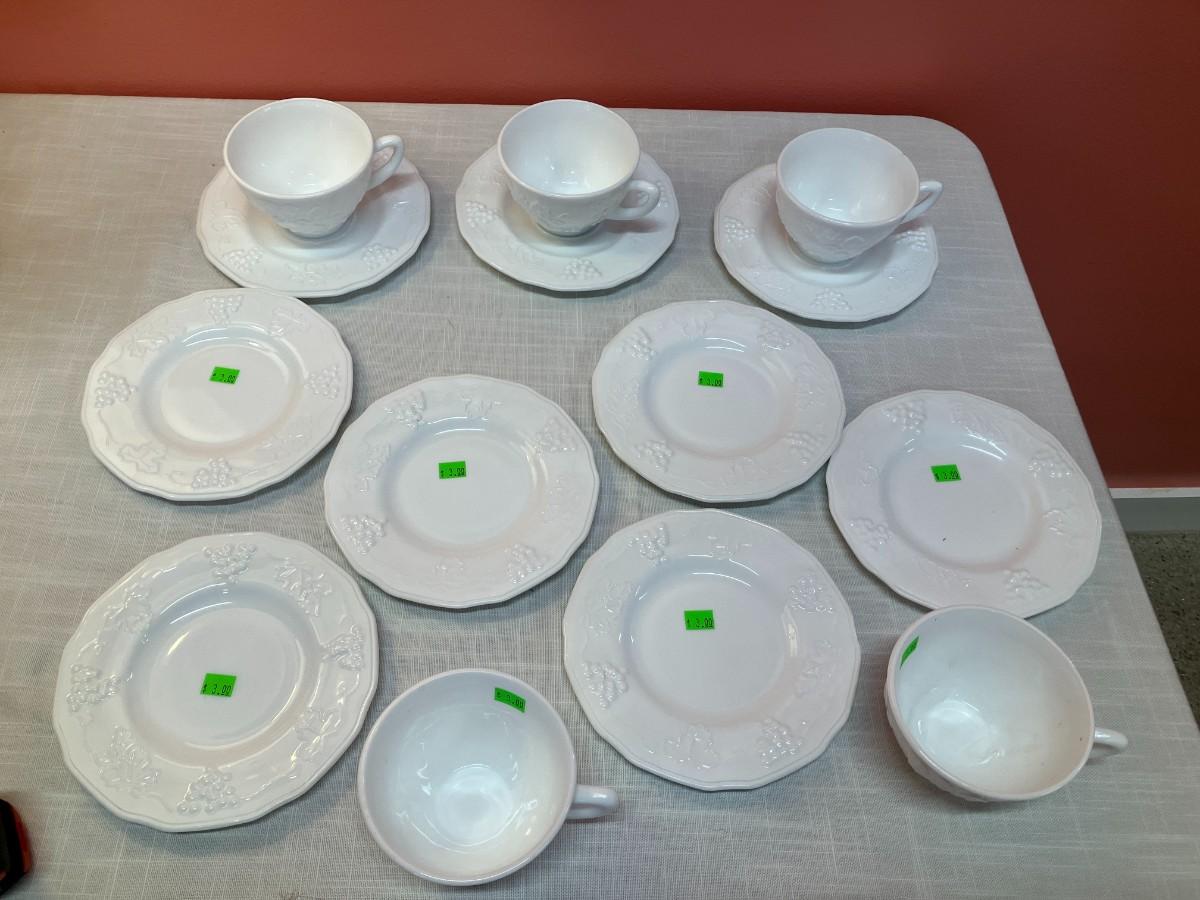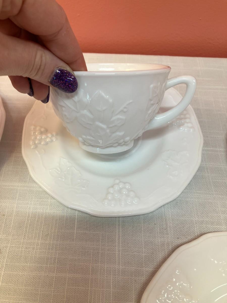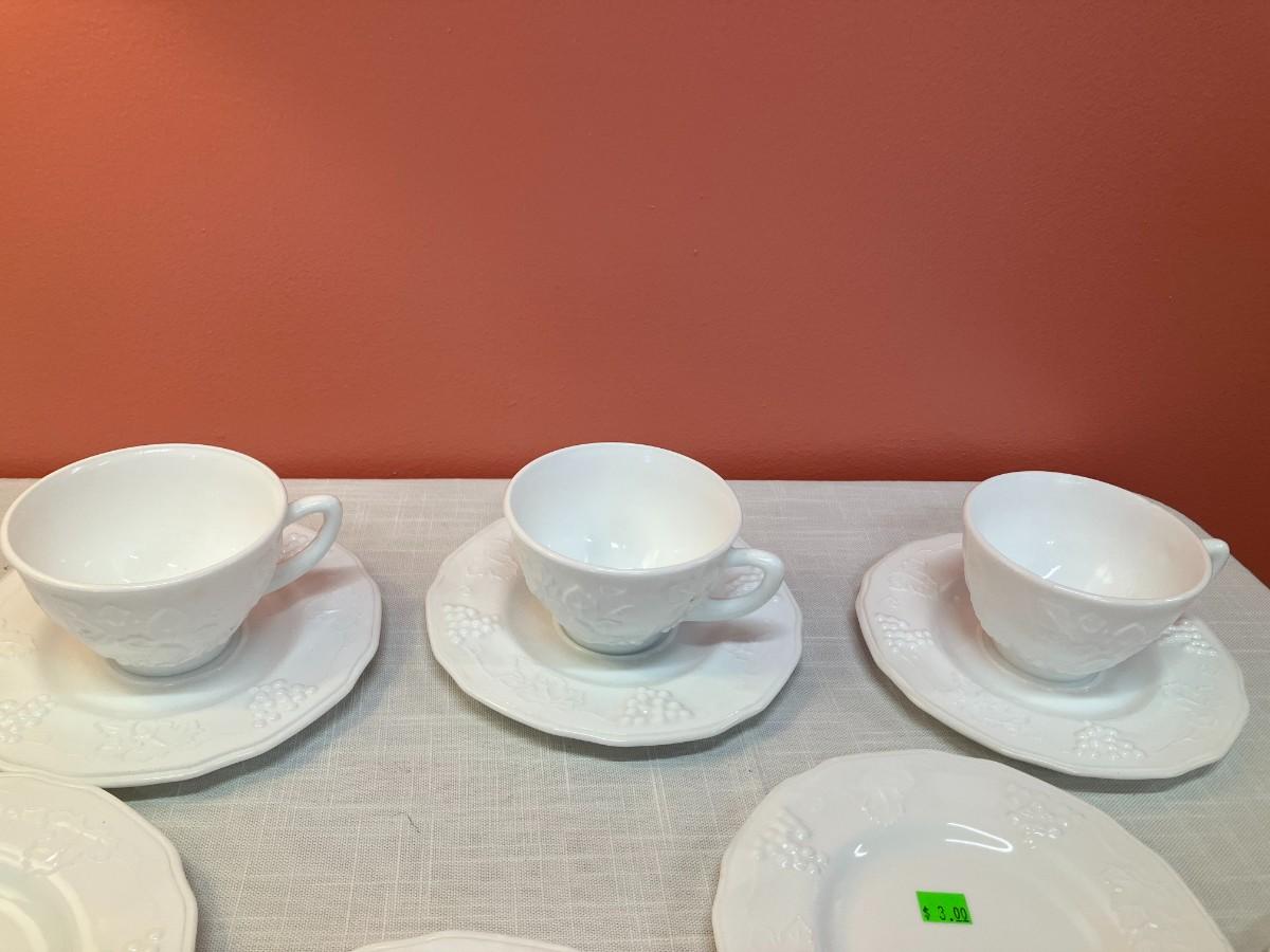 Set of same pattern milk glass items, containing: 6 small plates, 5 cups, 3 saucers, all in excellent condition