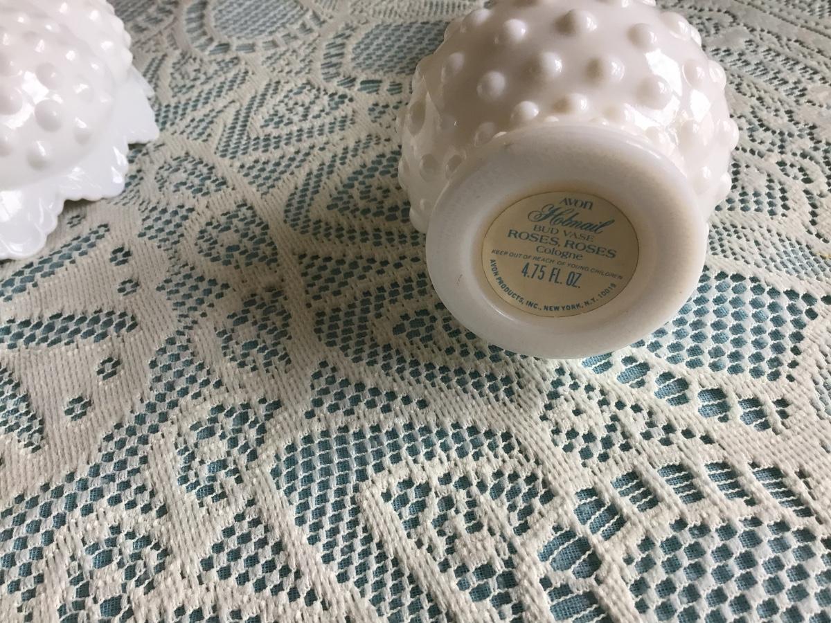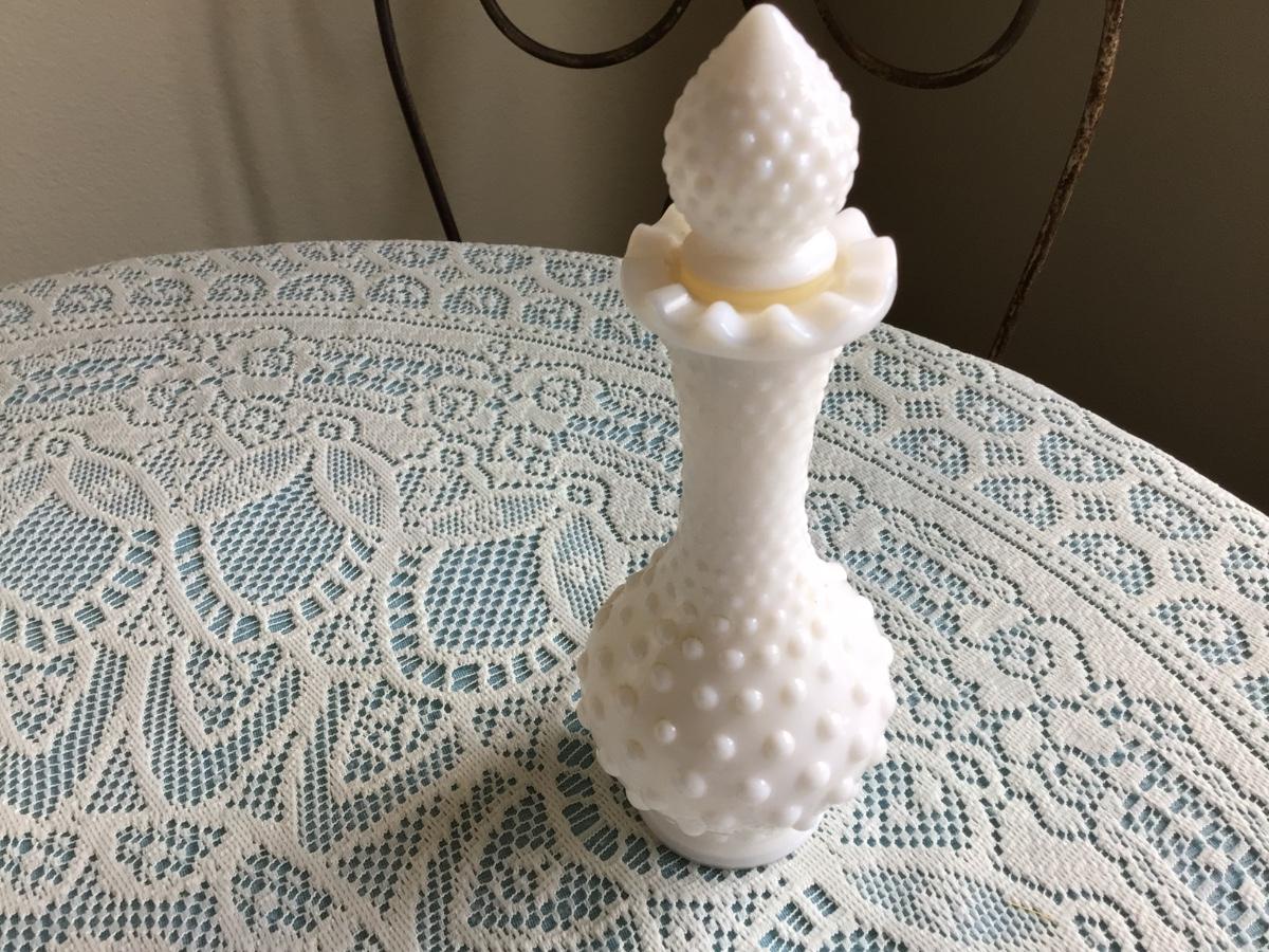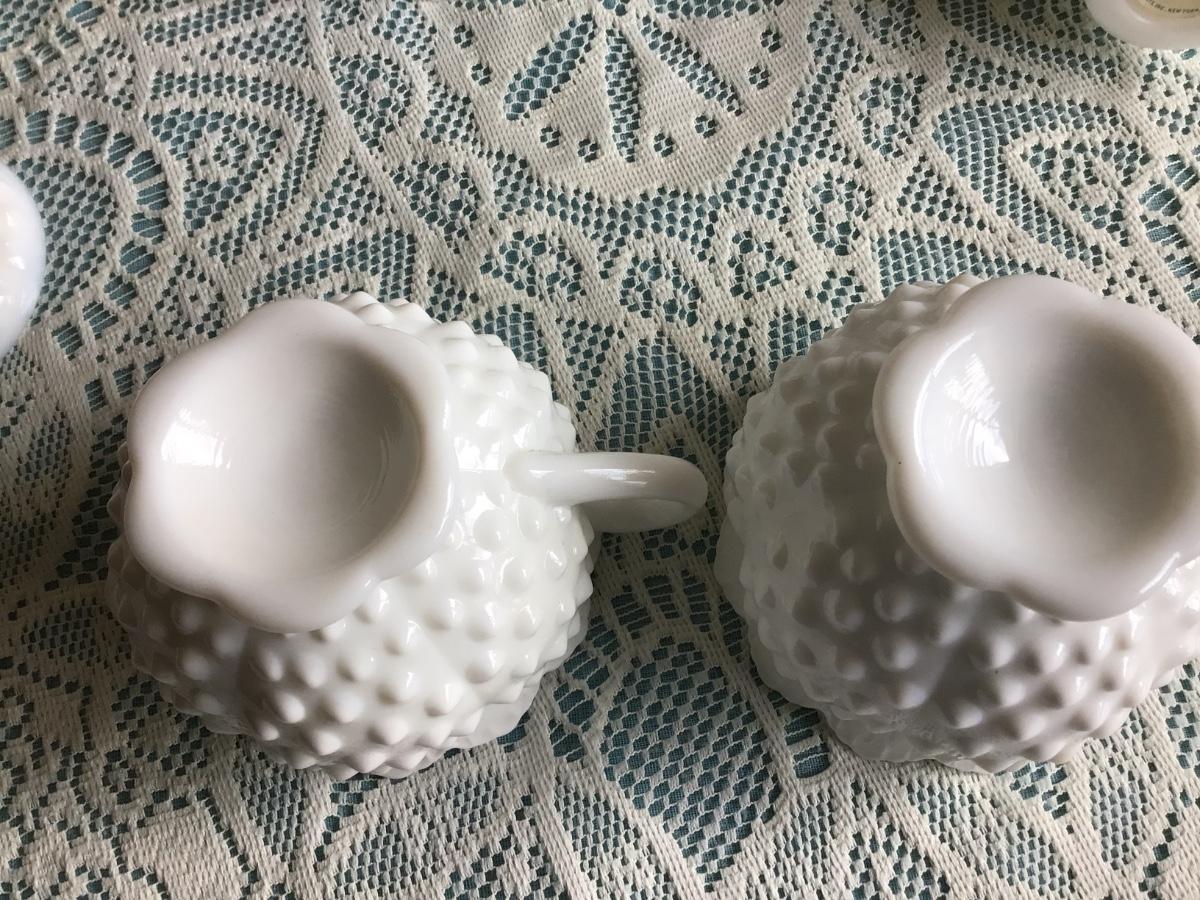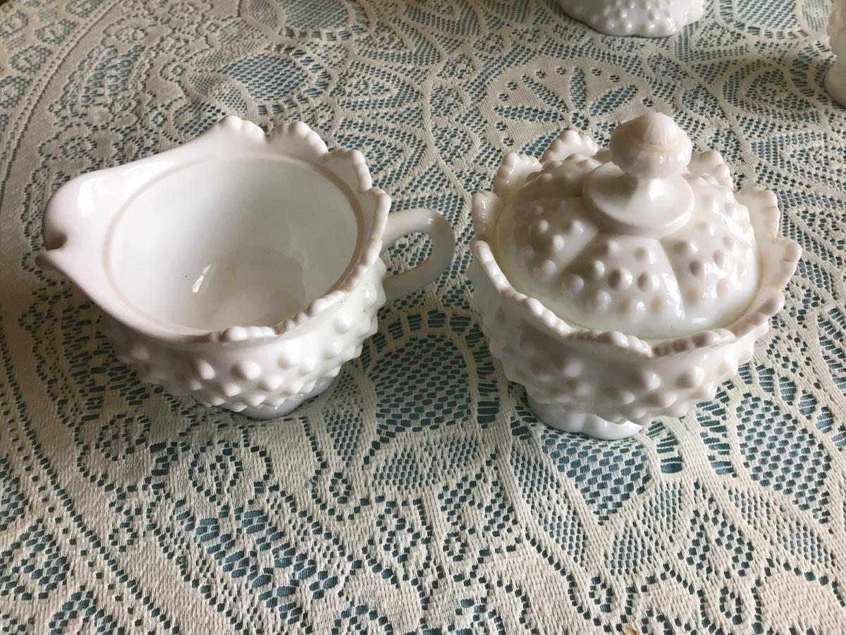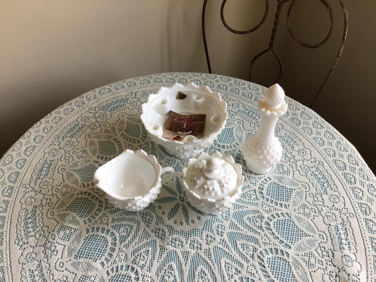 This is a great milk glass lot, you get Fenton hobnail candle holder, hobnail cream and sugar, single hobnail crewet Avon perfume.