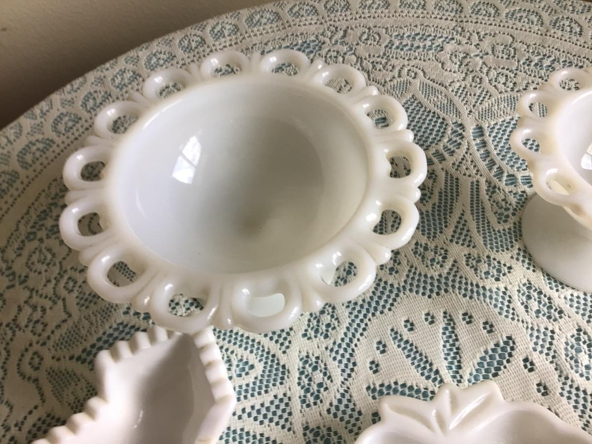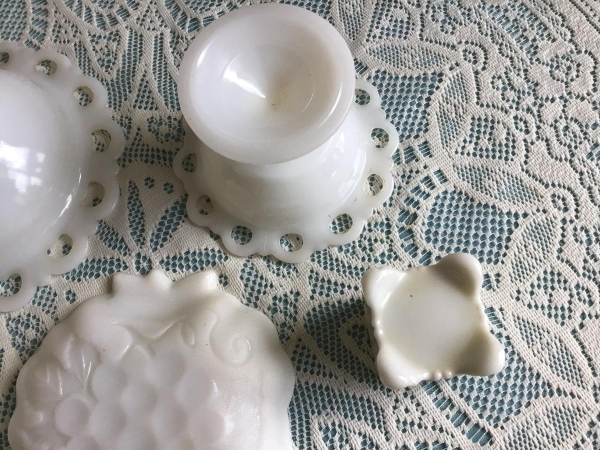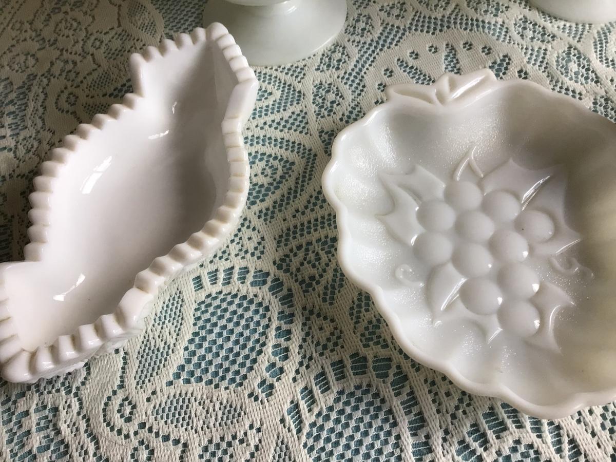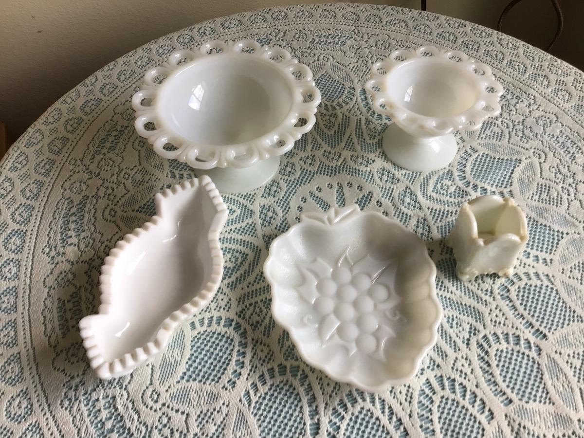 This is a great milk glass lot, you get two footed bowls with loops on edge, grape tray, toothpick holder, long tray. All in good condition.