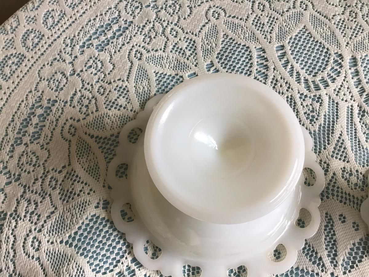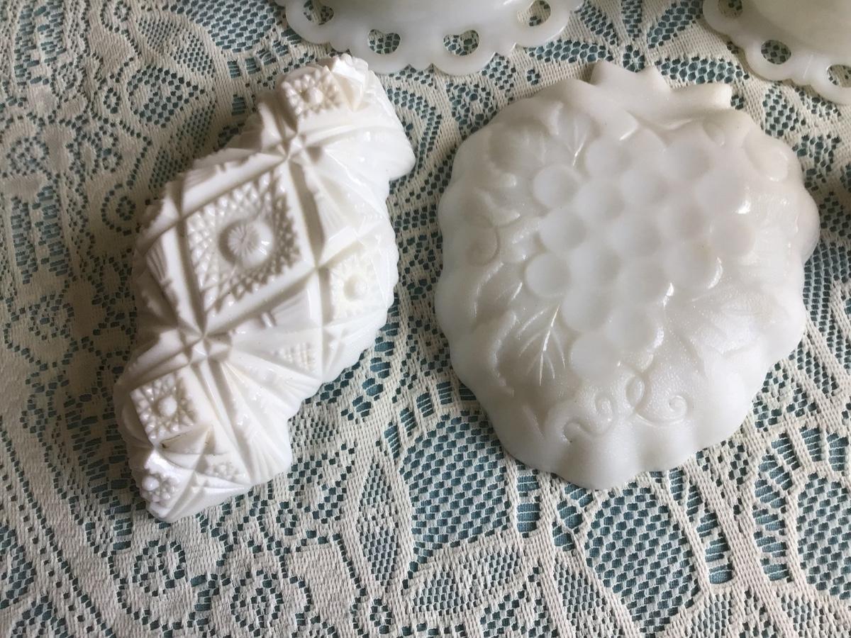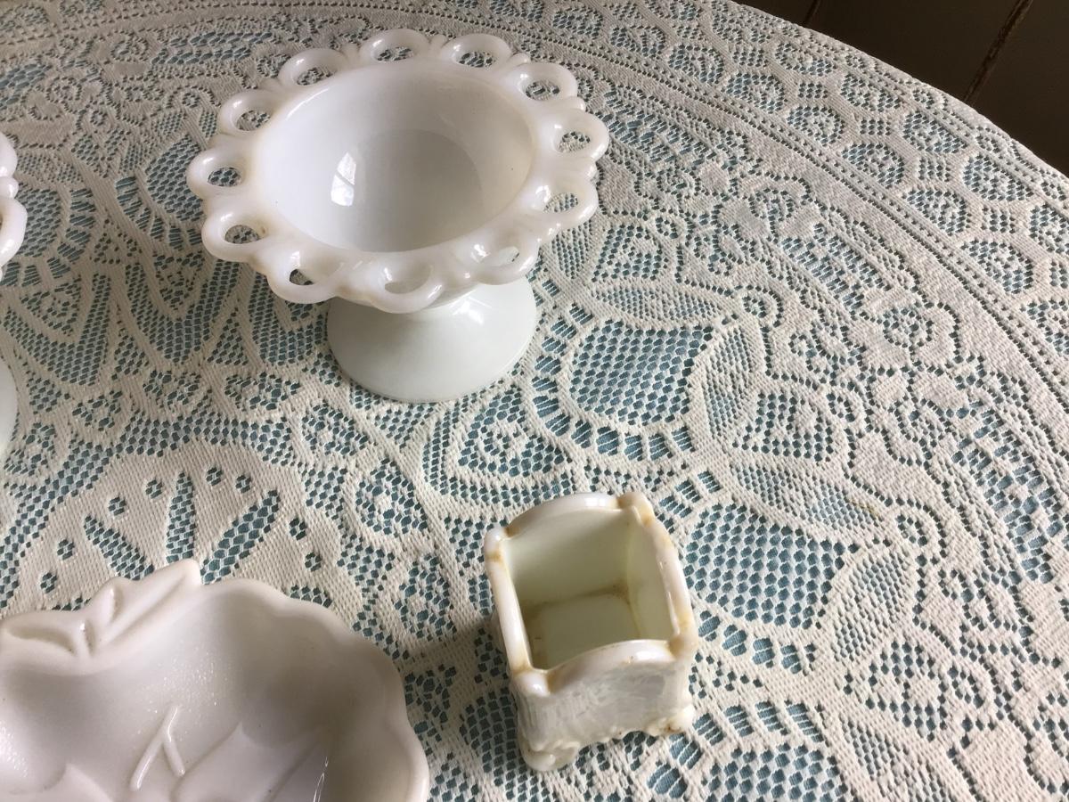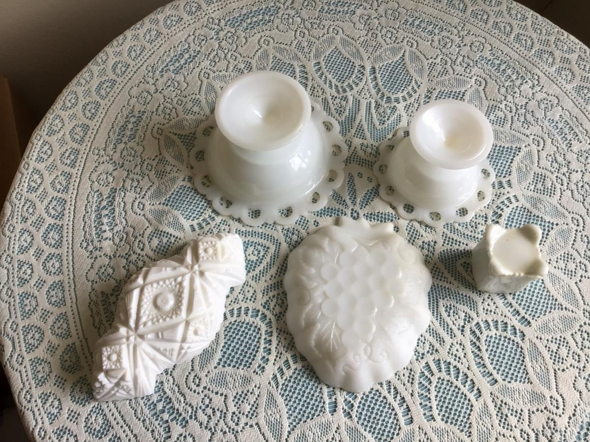 This is a great milk glass lot, you get two footed bowls with loops on edge, grape tray, toothpick holder, long tray. All in good condition.