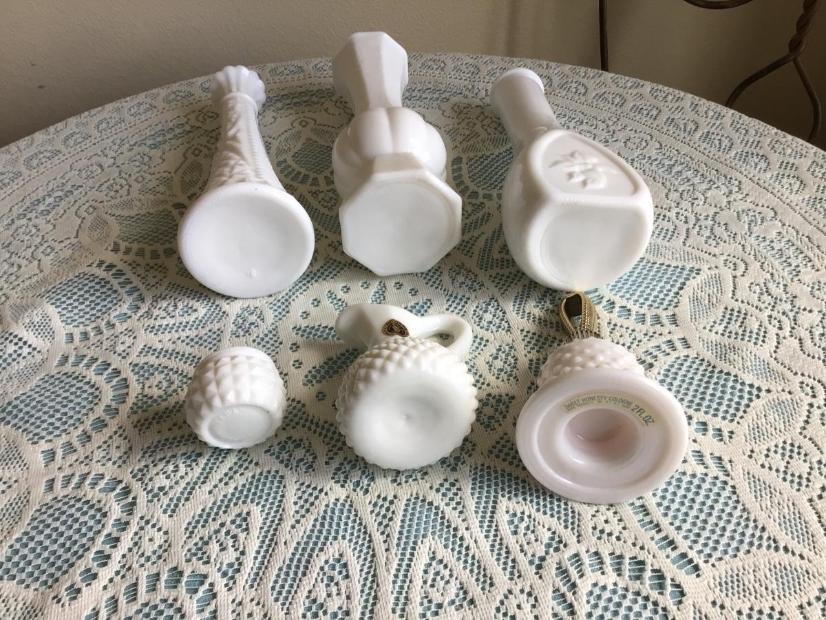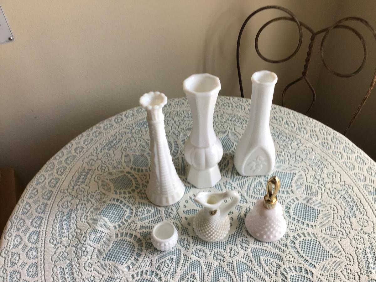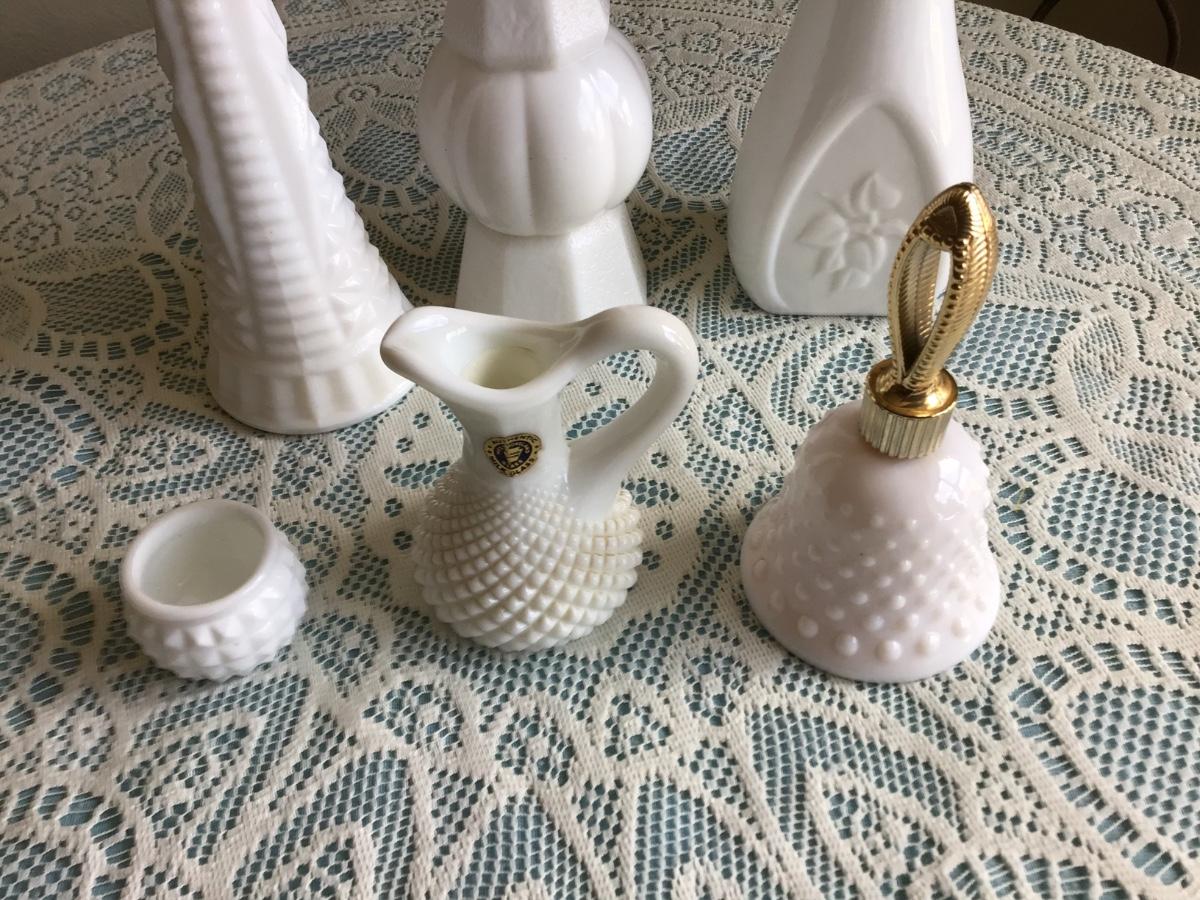This is a great lot of milk glass. You get three tall bud vases, single hobnail salt, small crewet, and Avon bell hobnail.