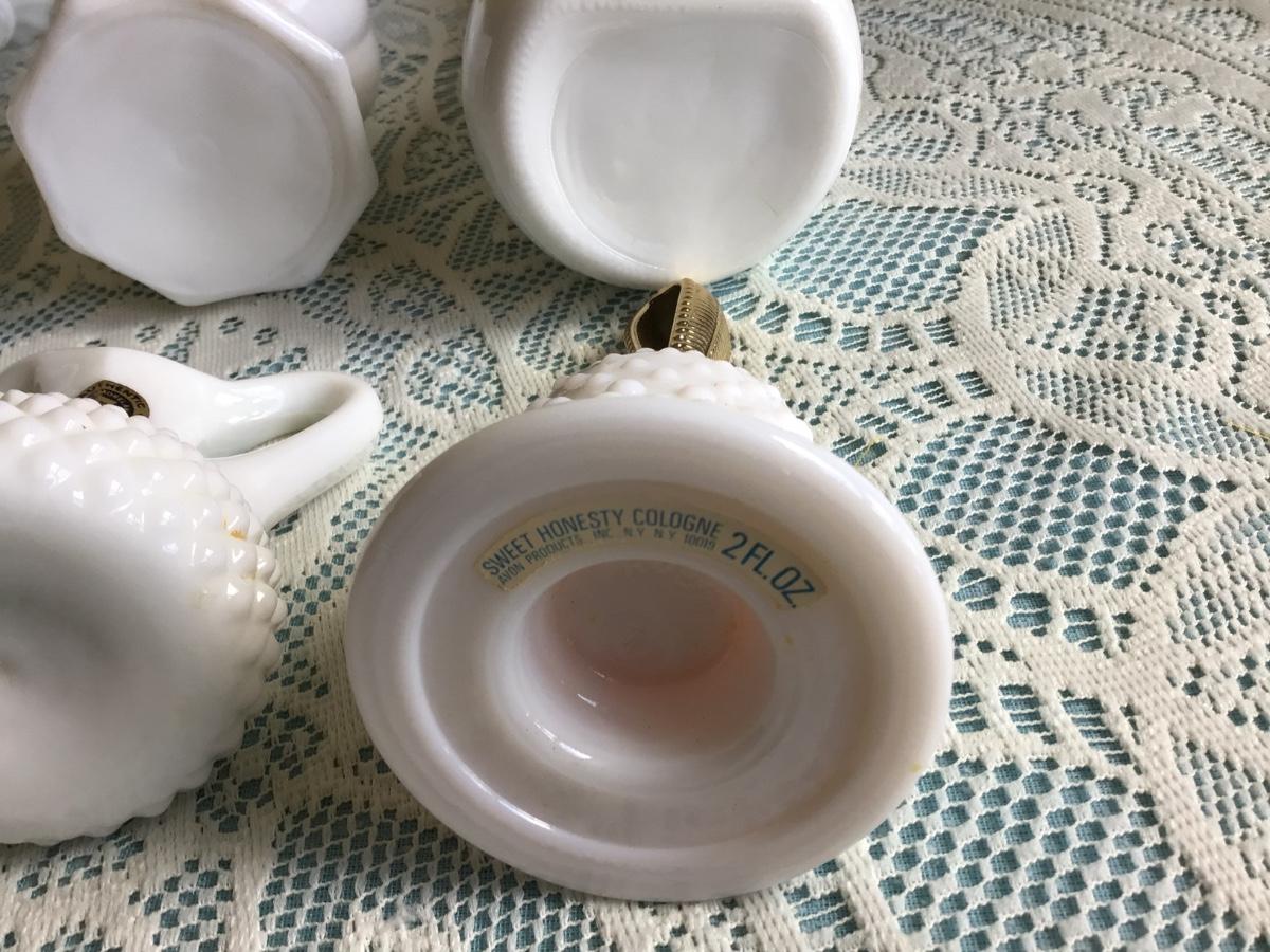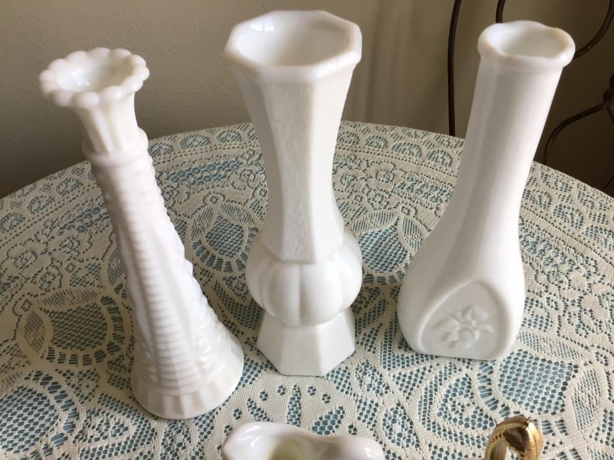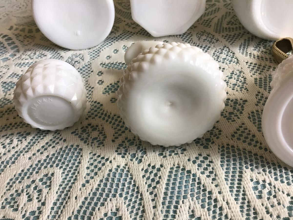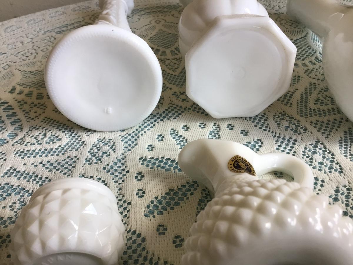 This is a great lot of milk glass. You get three tall bud vases, single hobnail salt, small crewet, and Avon bell hobnail.