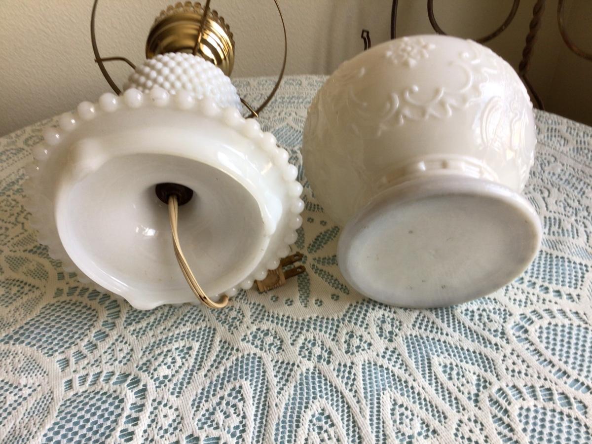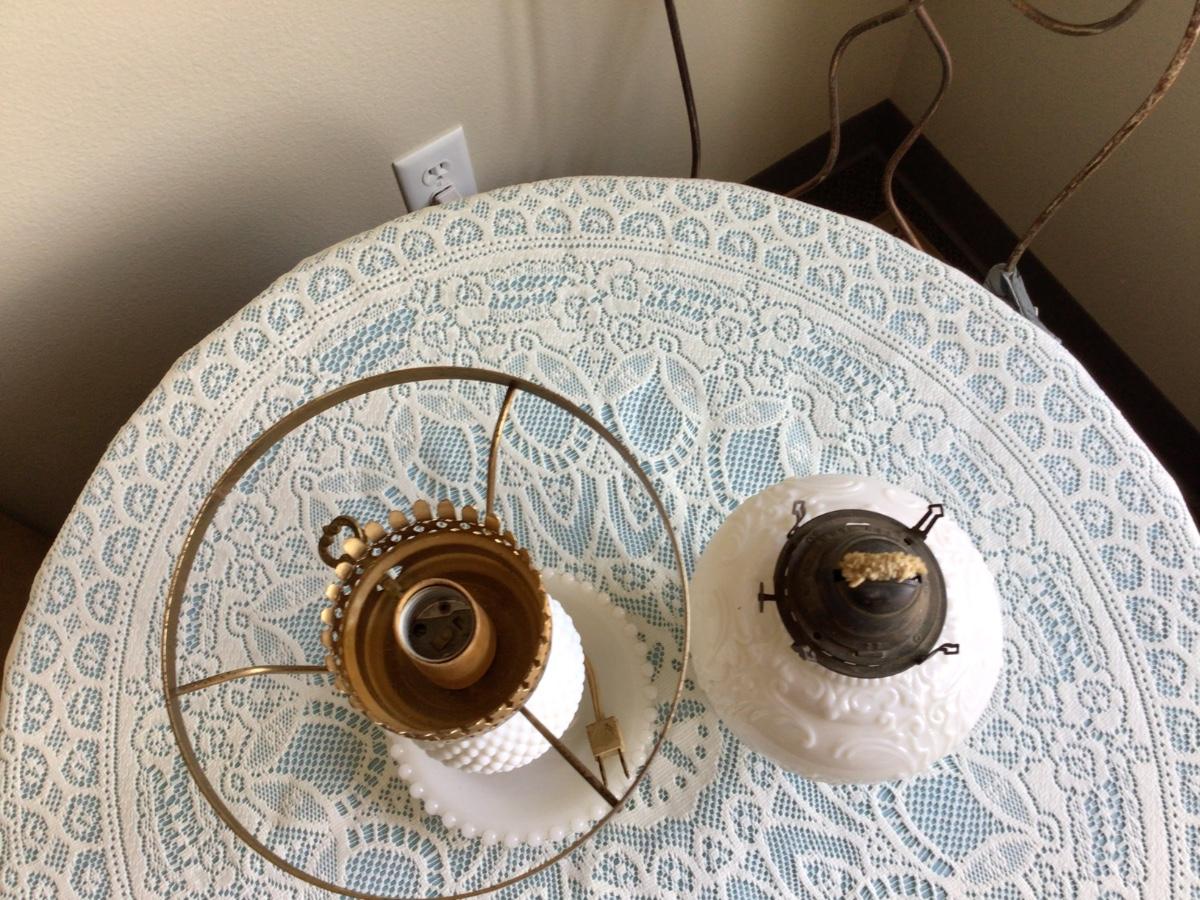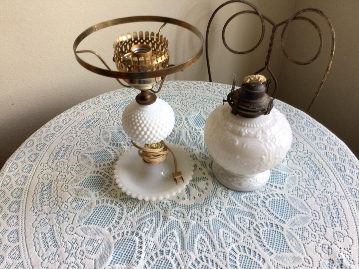 Milk glass oil lamp with no chimney, hobail milk glass electric lamp with no lamp shade.