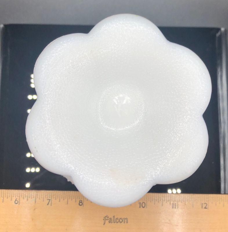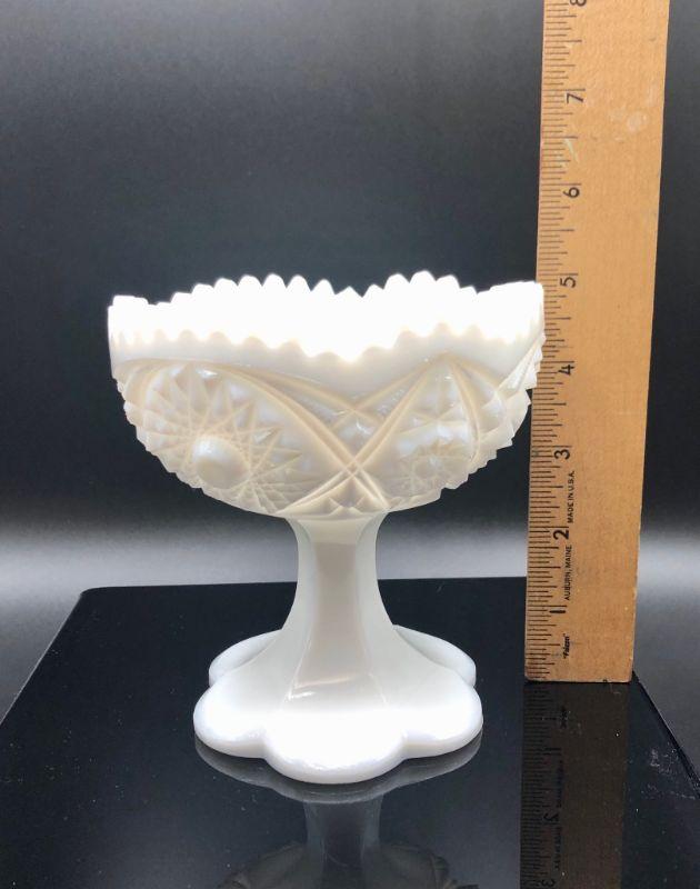 Kemple Milk Glass Pedestal Compote, Candy Dish. Sawtooth rim, paneled stem, and a scalloped base. Measures 5" tall 5" diameter top Scalloped bottom pedestal. Beautifully cut pattern. Good Condition.