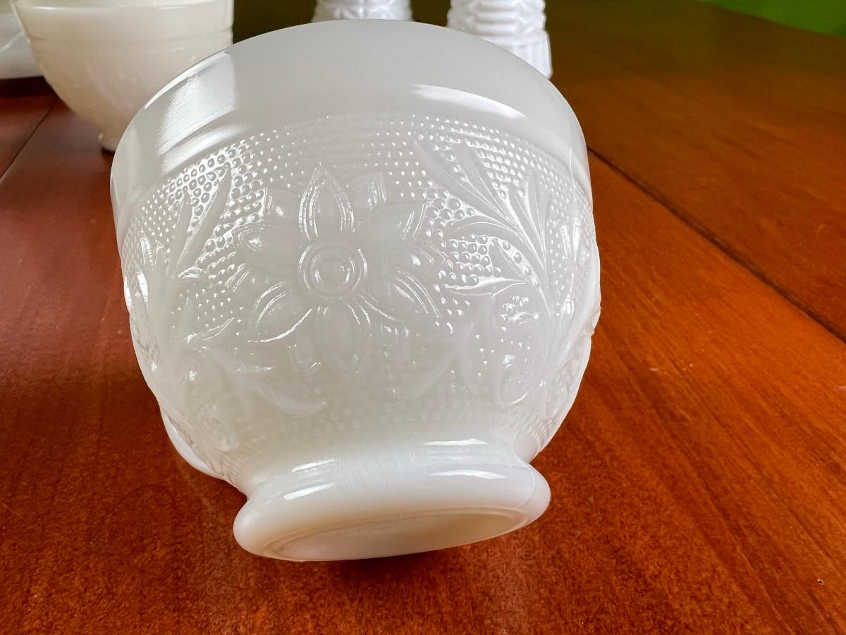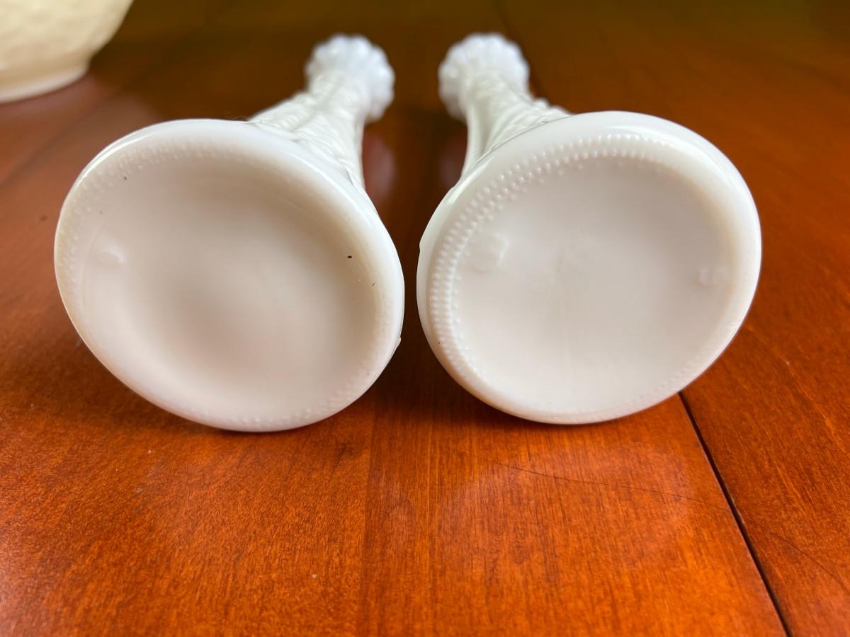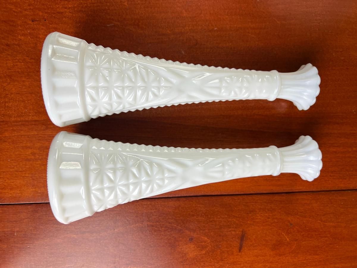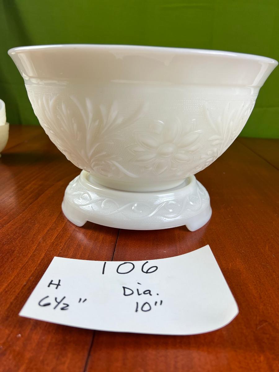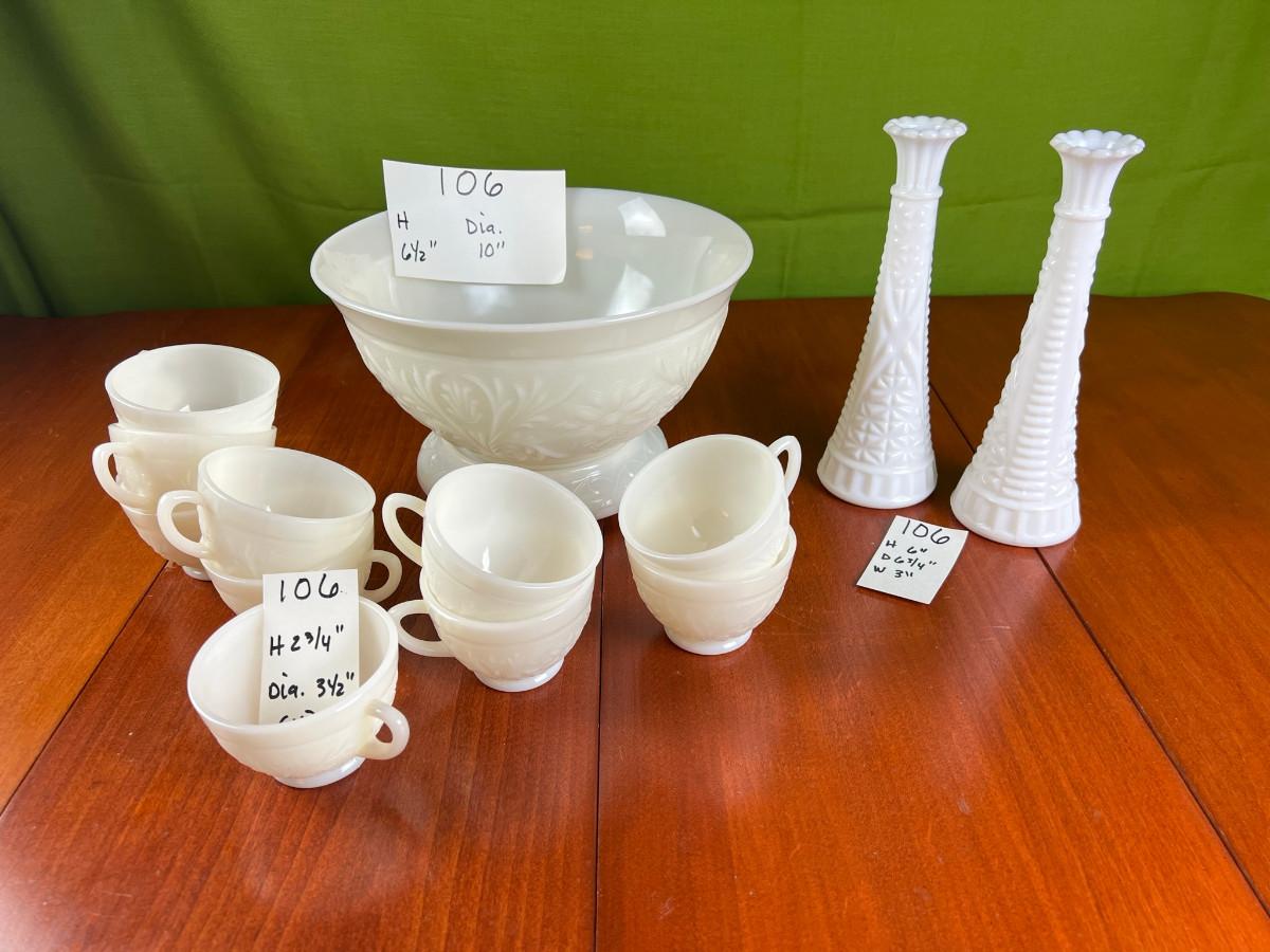 Milk glass punch bowl set and more. Bowl 6.5" x 10" x 7" with small chip, cups (10) 2 3/4" x 3.5" 2 vases match 9" x 3"