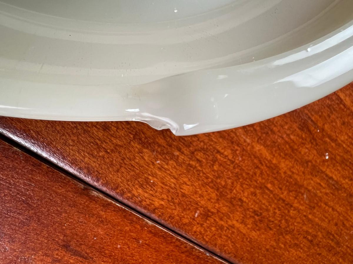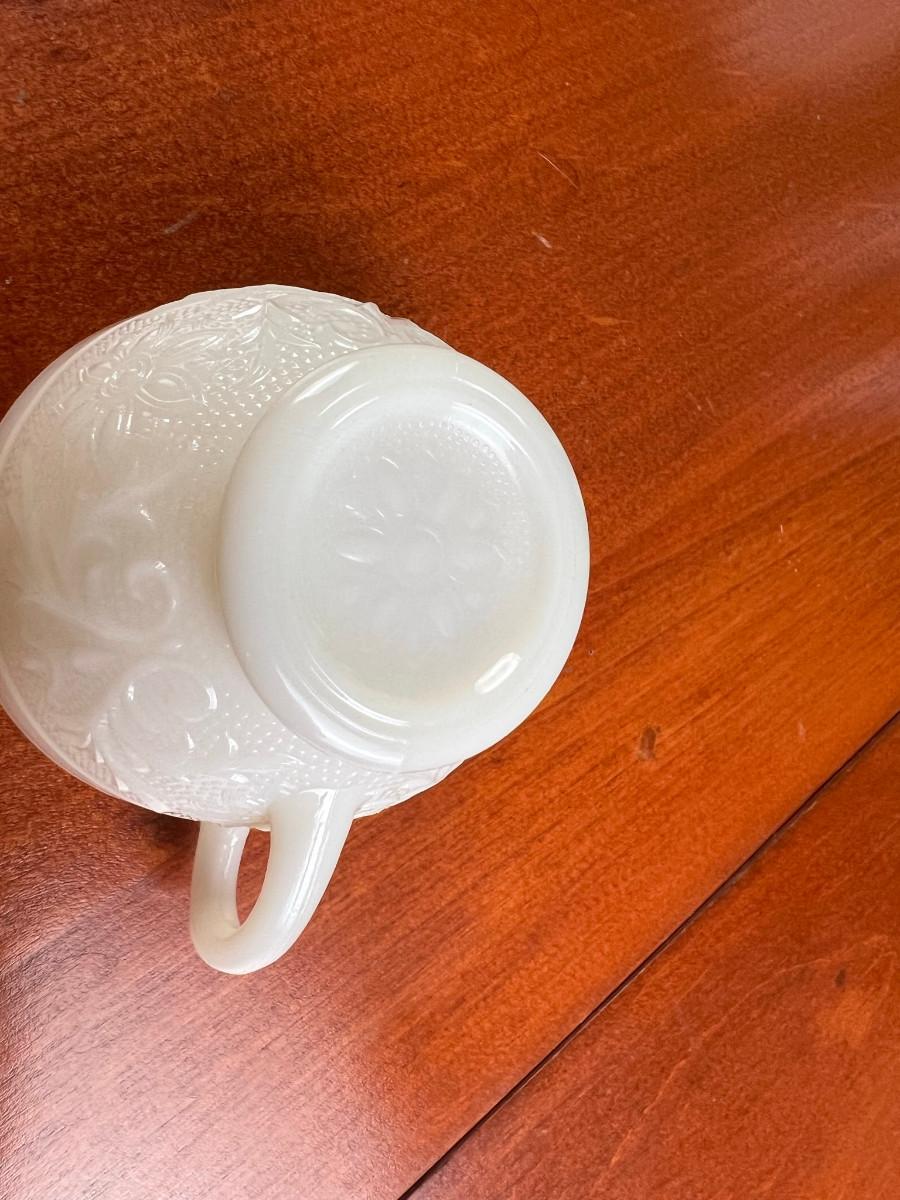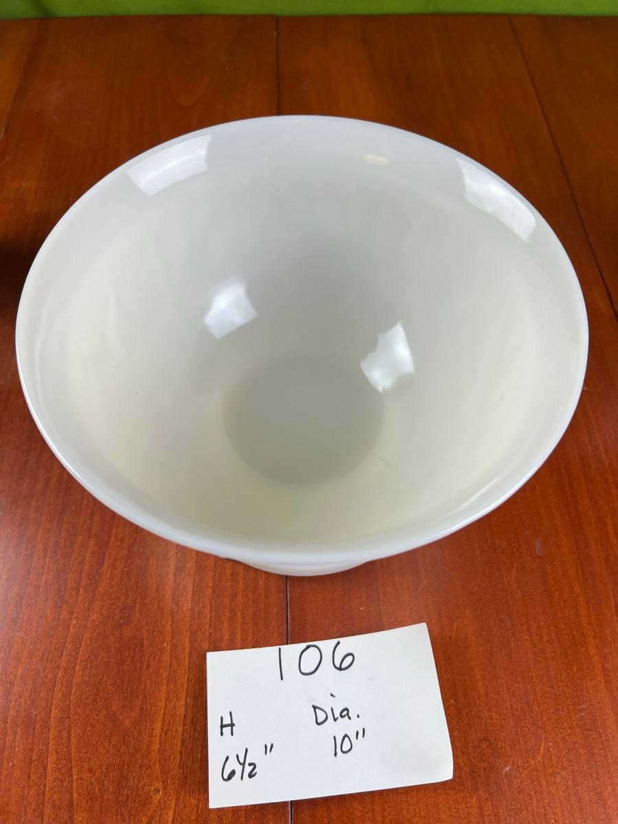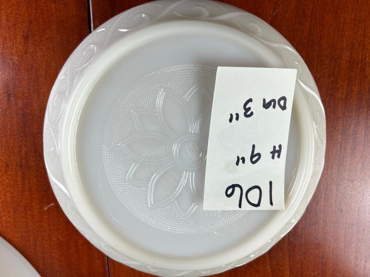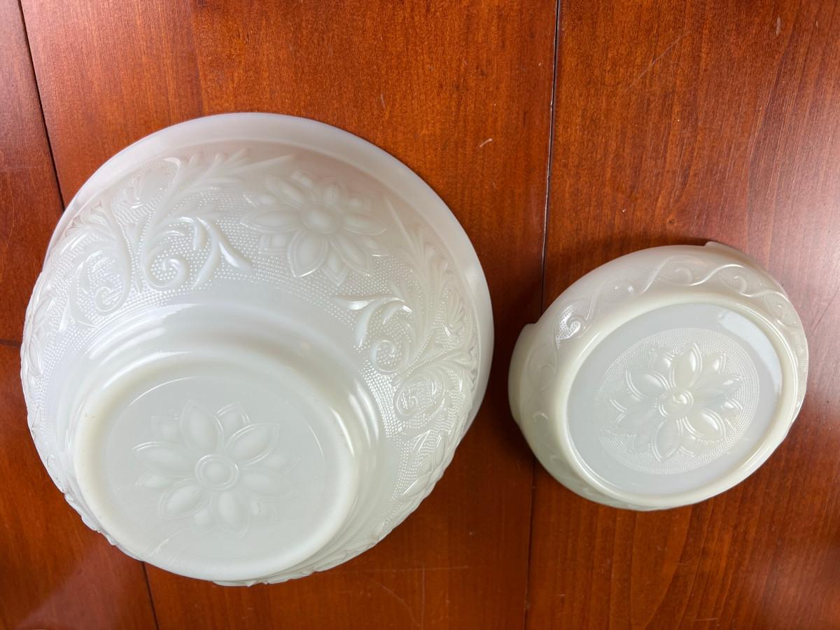 Milk glass punch bowl set and more. Bowl 6.5" x 10" x 7" with small chip, cups (10) 2 3/4" x 3.5" 2 vases match 9" x 3"