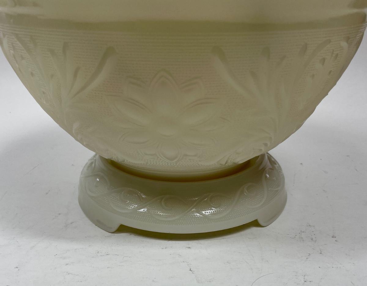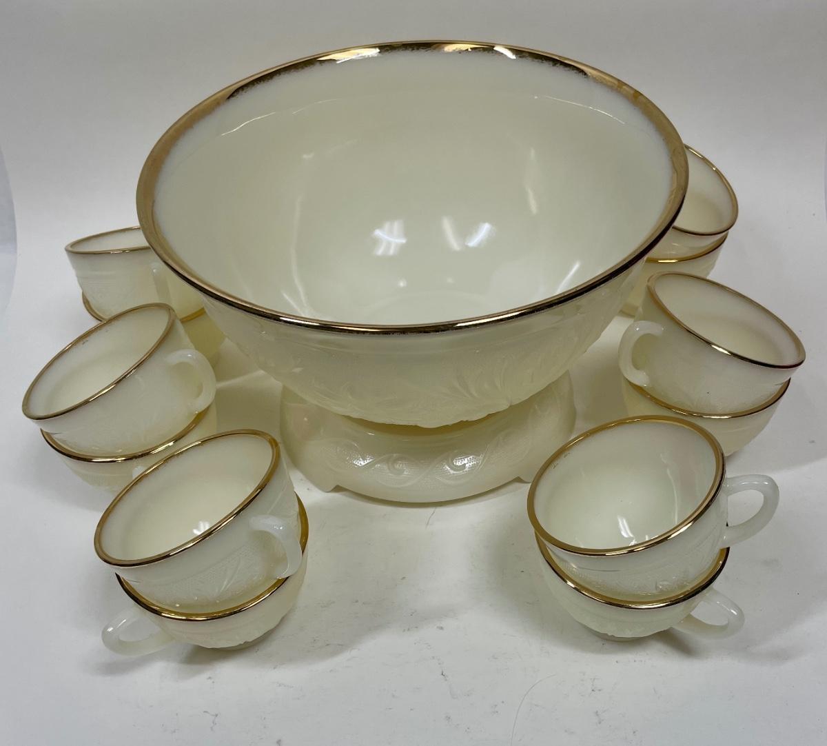 Vintage MCM Anchor Hocking Ivory Milk Glass Gold Trim 4 Qt. Punch Bowl, Stand & 12 Cups