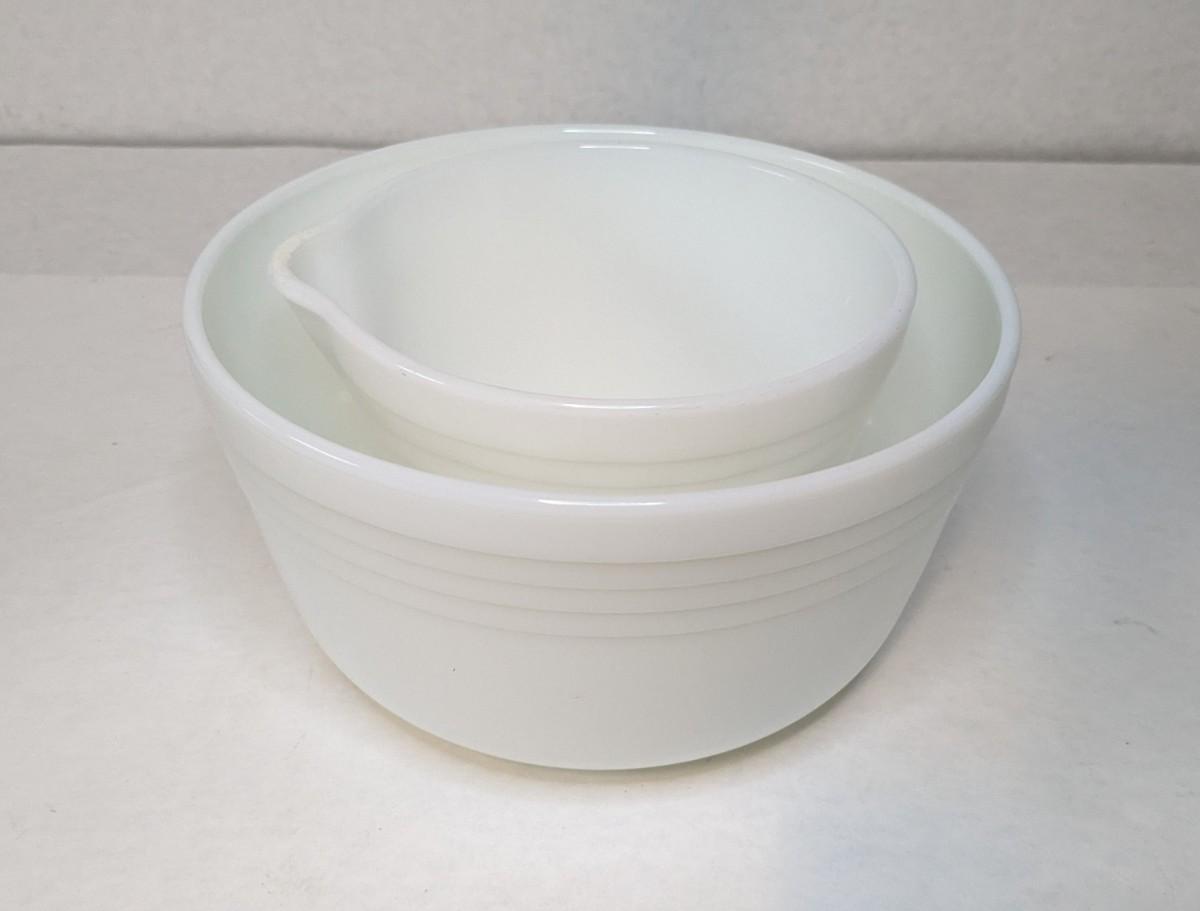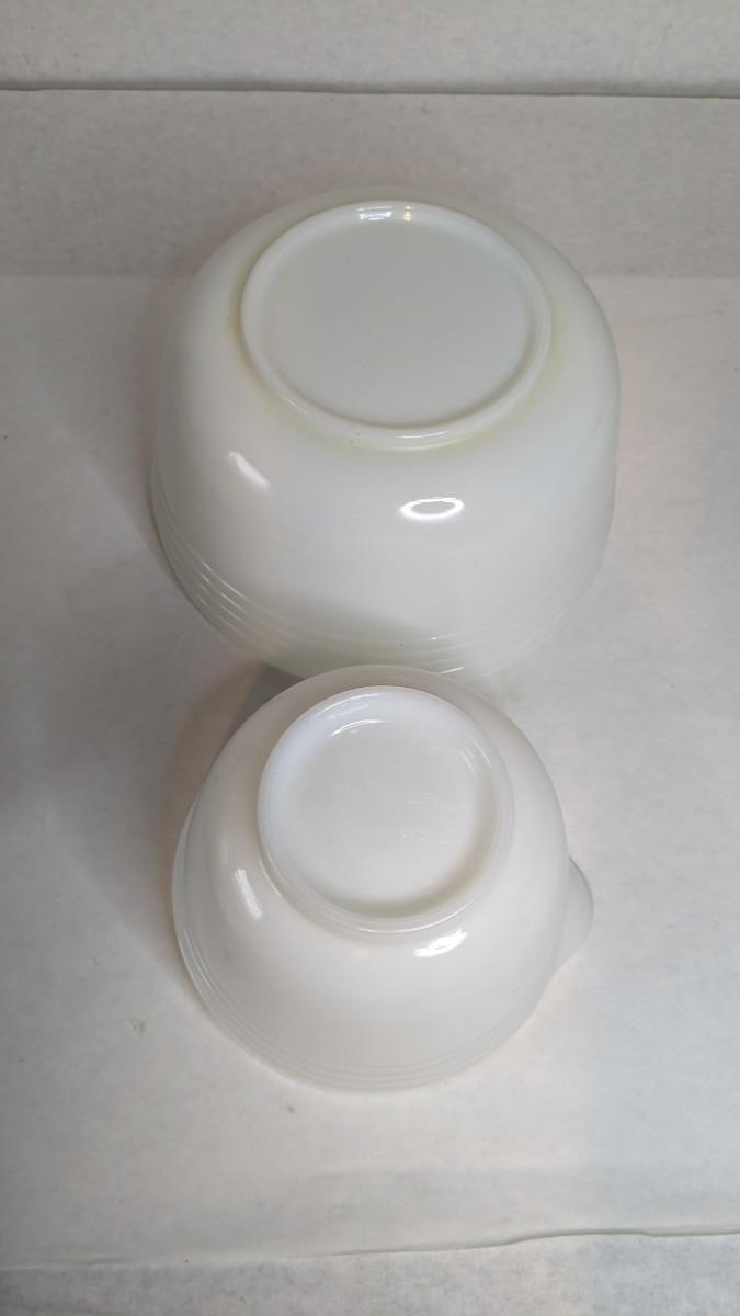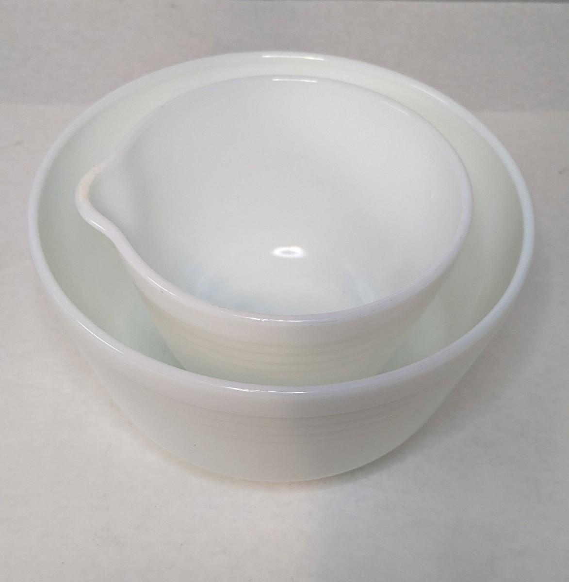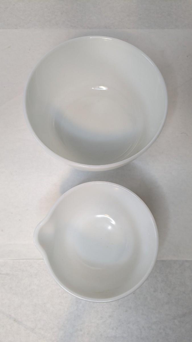 (2) 6.75" with pour spout no.14 milk glass mixing bowl and 8 5/8" no. 12 bowl both for use in countertop mixer by Hamilton Beach or perfect for everyday use. Both are in excellent condition with no flaws noted.