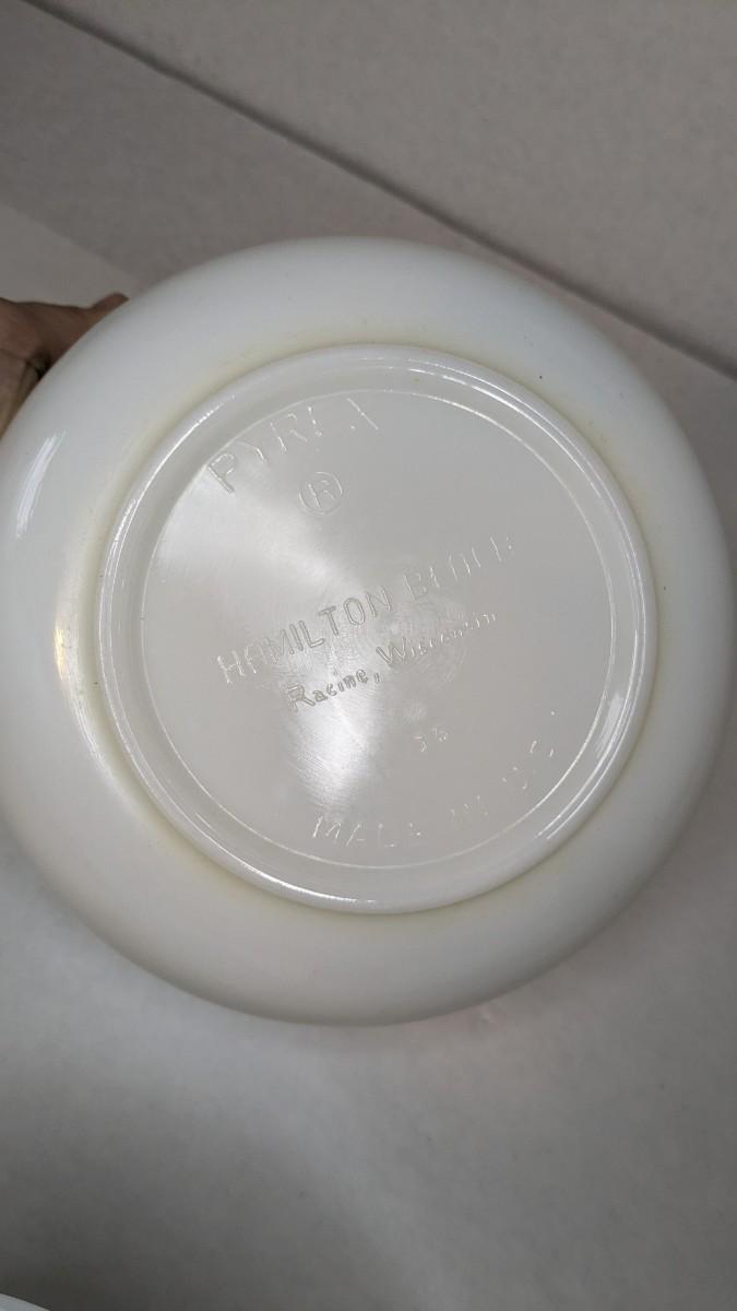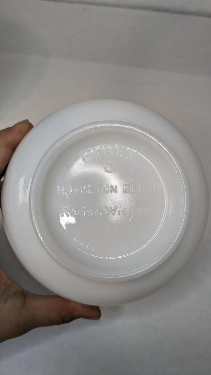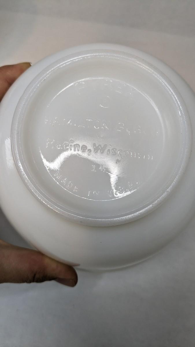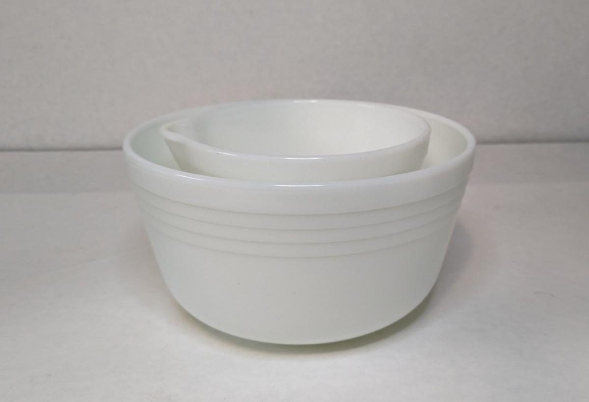 (2) 6.75" with pour spout no.14 milk glass mixing bowl and 8 5/8" no. 12 bowl both for use in countertop mixer by Hamilton Beach or perfect for everyday use. Both are in excellent condition with no flaws noted.